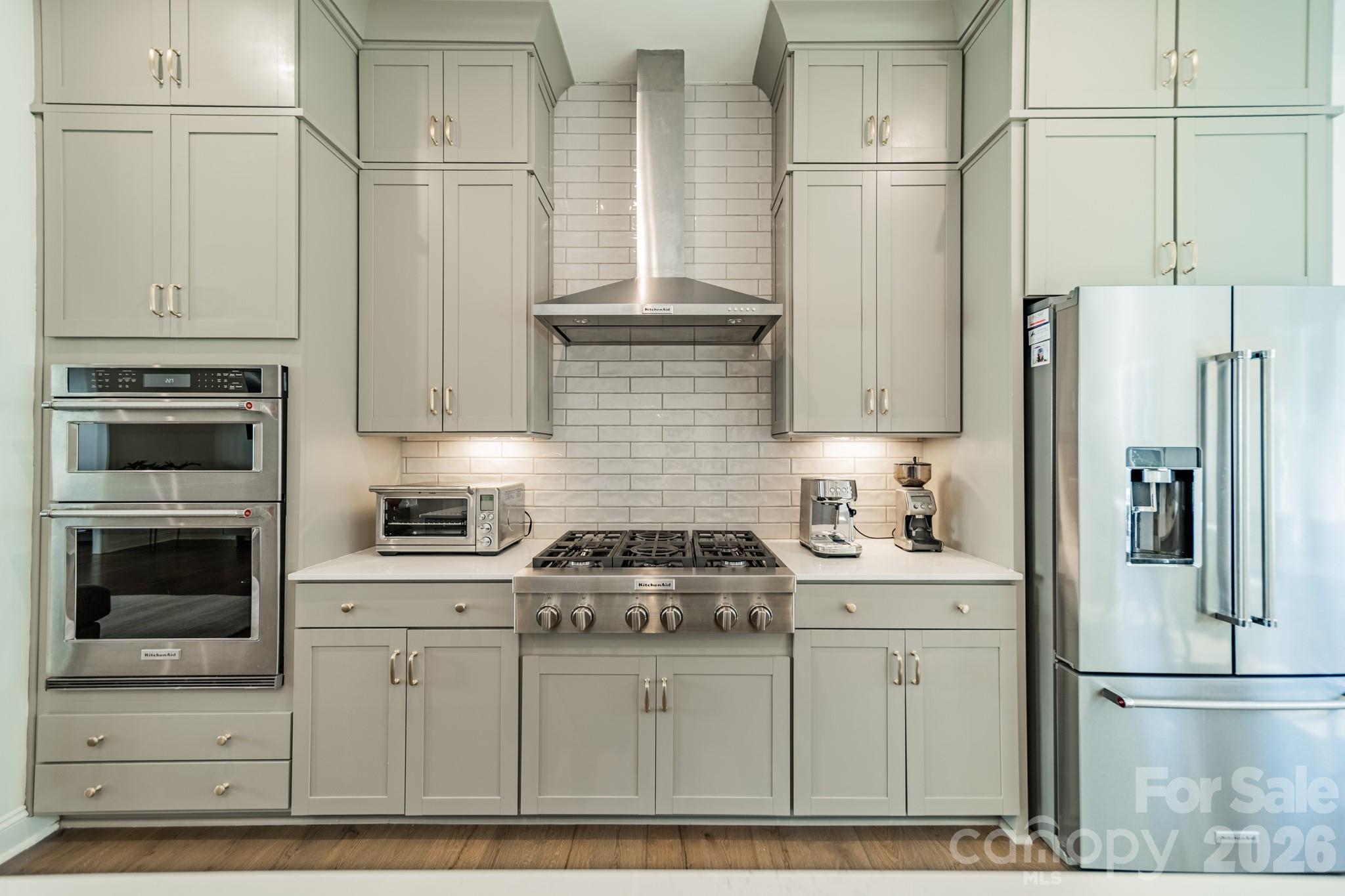 Entering the Second Floor: The heart of the home features an open-concept living space flooded with natural light and enhanced by lofty ceilings and rich hardwood floors. The high-end kitchen is a home-chef's dream, showcasing a built-in KitchenAid refrigerator, 6-burner KitchenAid gas range, built-in microwave and wall oven, and an oversized island with seating for five. Ample cabinetry ensures storage is never a concern. The dining area flows seamlessly into the spacious living room, while a private balcony and sun-room extend your entertaining space to the outdoors.
