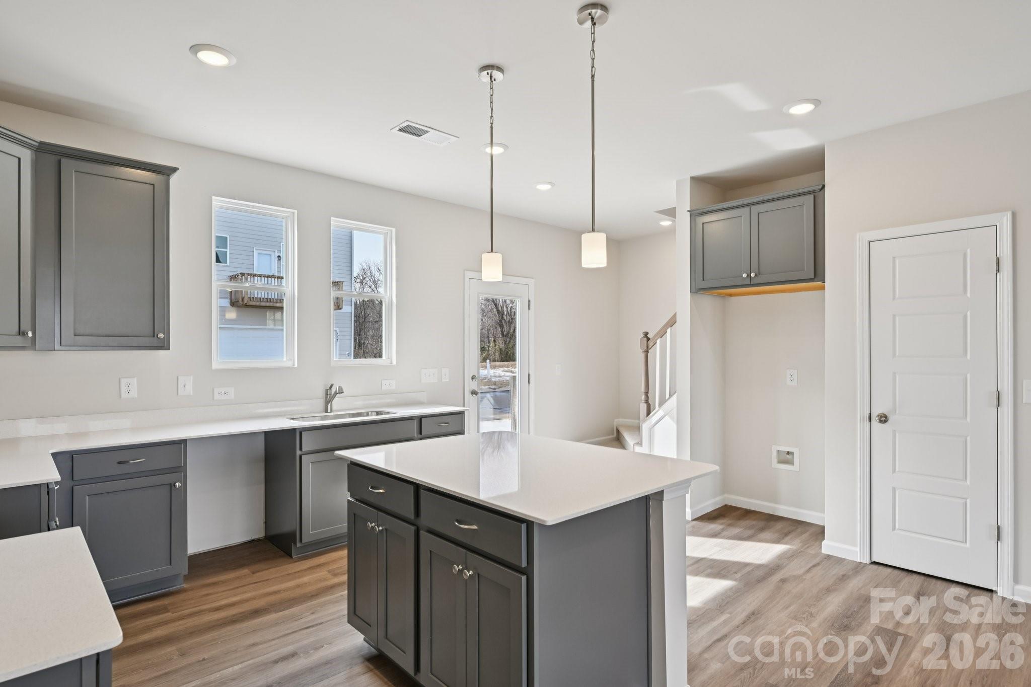 Welcome home to The Watkins, where modern townhome living meets comfort, convenience, and an unbeatable location in Cramerton, NC. Thoughtfully designed with today’s buyer in mind, this 2-story, 3-bedroom, 2.5-bath new construction townhome offers nearly 1,400 square feet of stylish, low-maintenance living—perfect for first-time home buyers, relocating buyers, or anyone looking for a home that fits their lifestyle without the upkeep. As you step through the stunning 8-foot front door, natural light pours into the open foyer, instantly creating a warm and welcoming feel. The main level features 9-foot ceilings, beautiful EVP flooring, dimmable LED lighting, and an open-concept layout that effortlessly connects the great room, kitchen, and dining area—ideal for cozy nights in or entertaining friends and family. A conveniently located powder bath and coat closet add to the home’s smart, functional design. The kitchen is truly the heart of the home, showcasing quartz countertops, a large center island with abundant storage, 42-inch cabinetry, a pantry, and stainless steel Frigidaire appliances—a space that feels just as good for weekday meal prep as it does for hosting. Tucked away is a private, hidden staircase that leads upstairs, where you’ll find a peaceful retreat in the owner’s suite. The ensuite bathroom features quartz countertops, a walk-in shower, and a walk-in closet. Two additional bedrooms, a shared full bath, a linen closet, and a full-size stacked washer and dryer closet round out the upper level—perfect for guests, a home office, or added flexibility. Built with durability in mind, the exterior combines low-maintenance Hardie® board siding and brick, giving you peace of mind and long-term value.