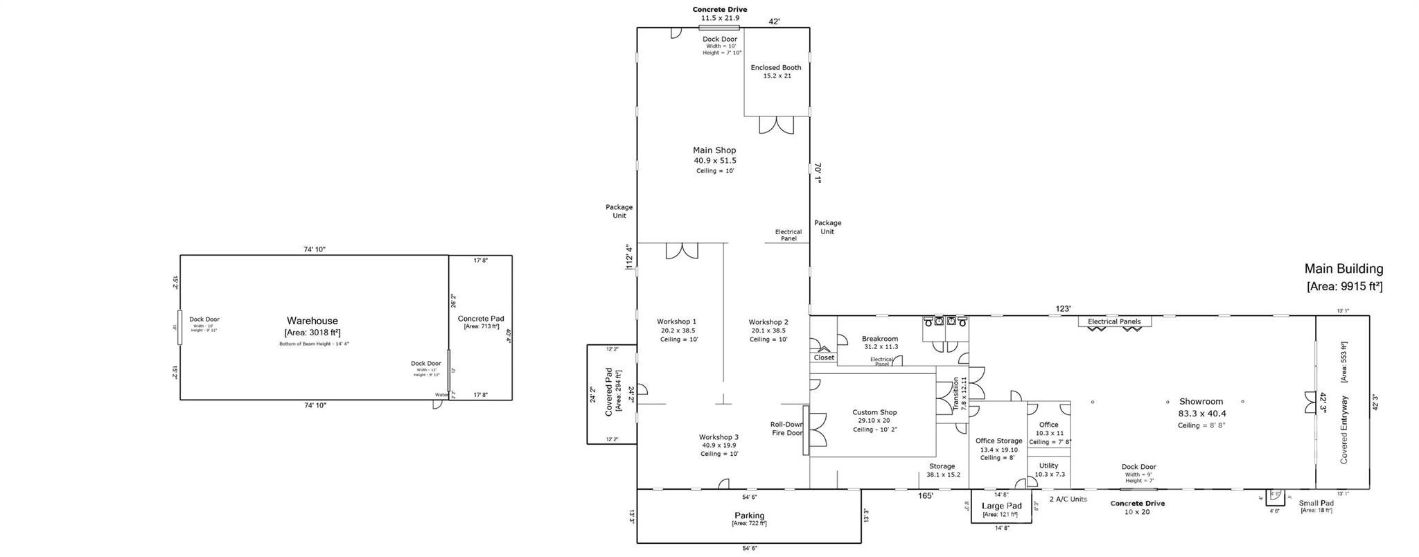 The main building includes approximately 9,915 heated square feet with workshop and showroom space, office areas, restrooms, two drive-in doors, and a firewall door for added functionality and safety. An additional 3,018-square-foot warehouse offers two more drive-in doors and flexible storage or production capacity.