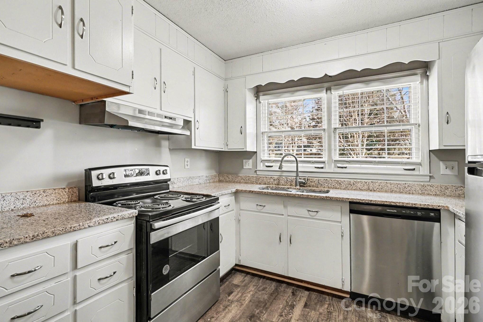This property features a spacious traditional floor plan, including a formal dining room located just off the front living area. The dining room flows seamlessly into the kitchen, which boasts granite countertops and stainless-steel appliances. The kitchen opens into a cozy secondary living room anchored by a classic fireplace.