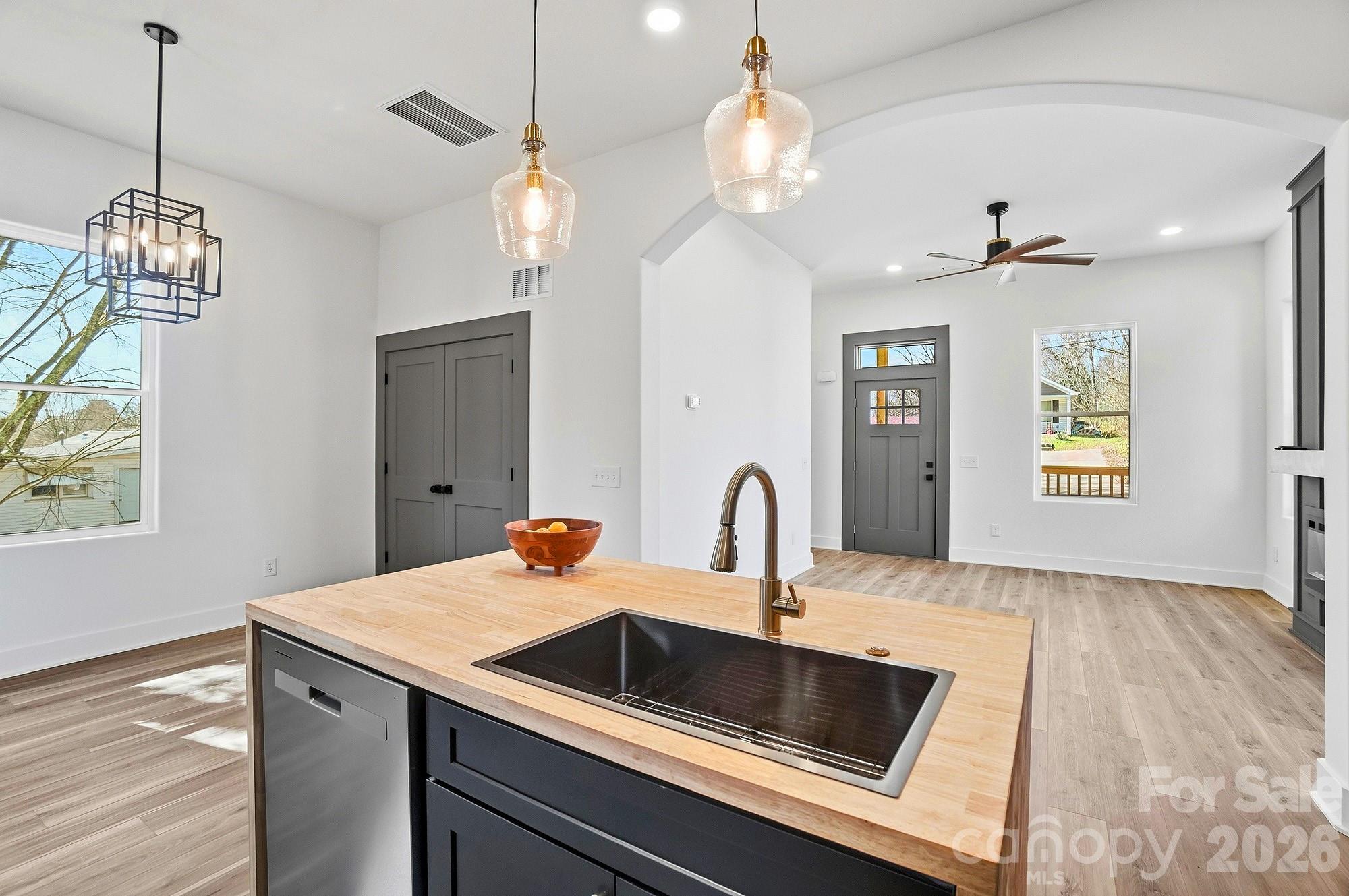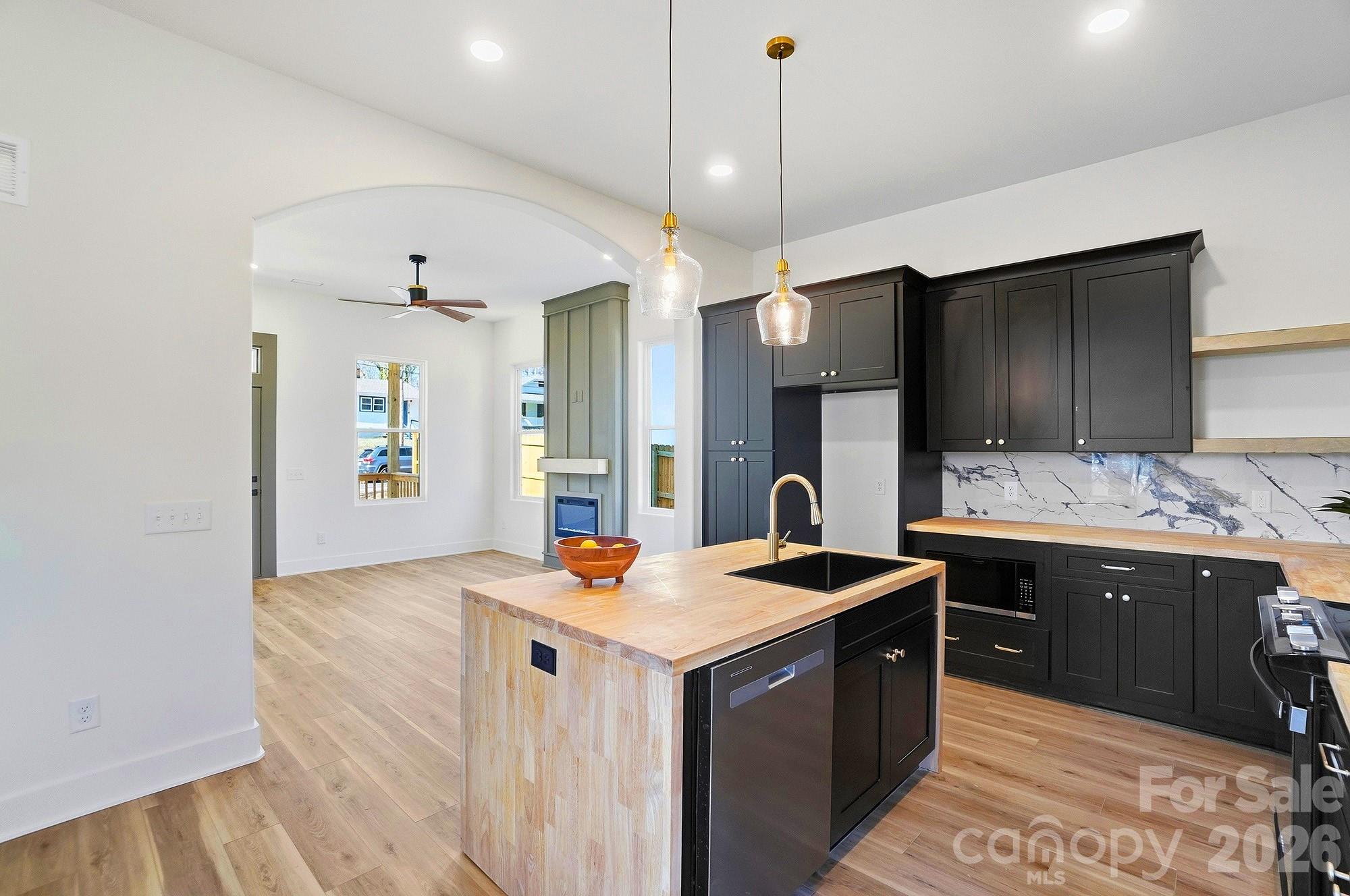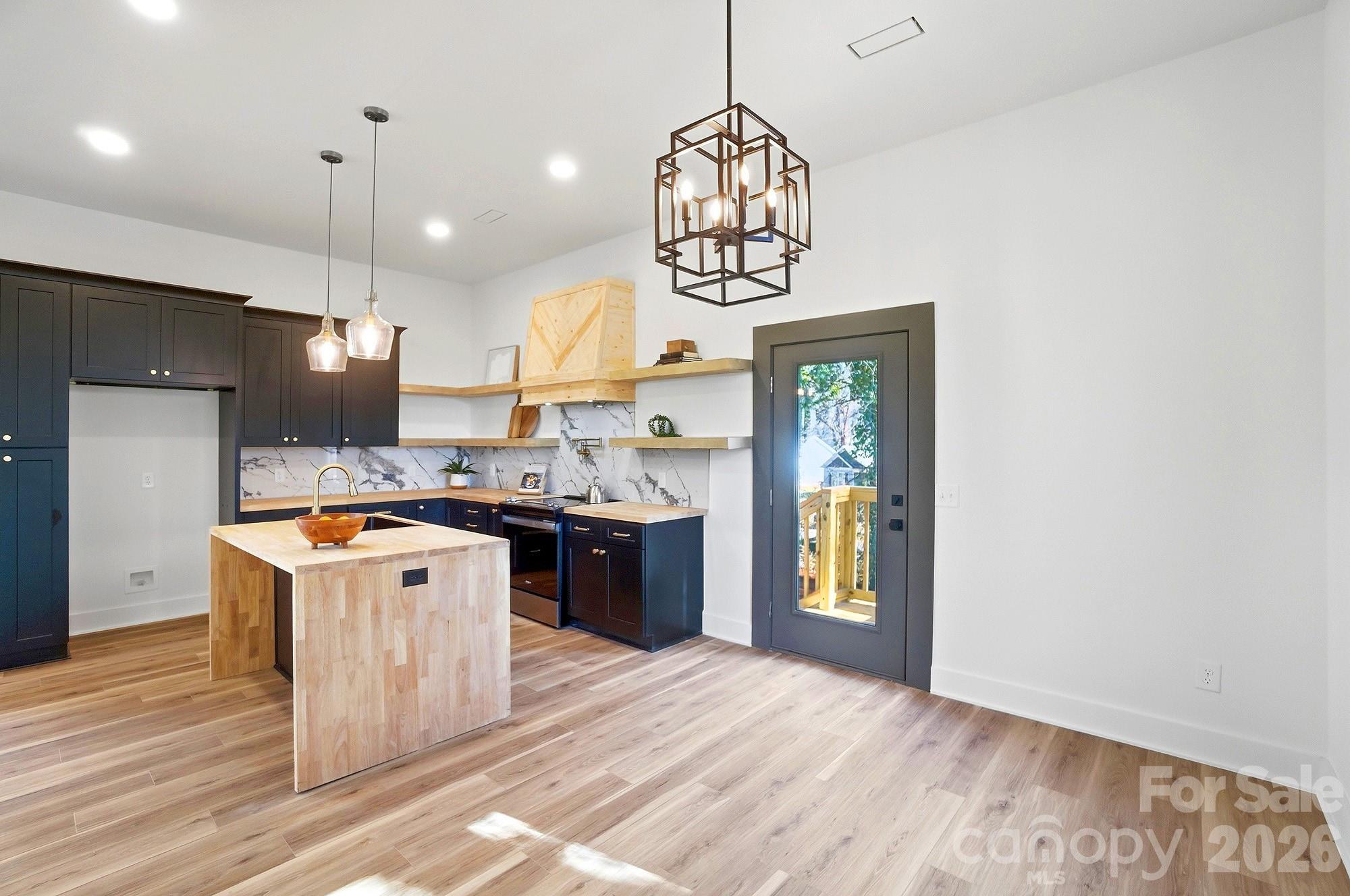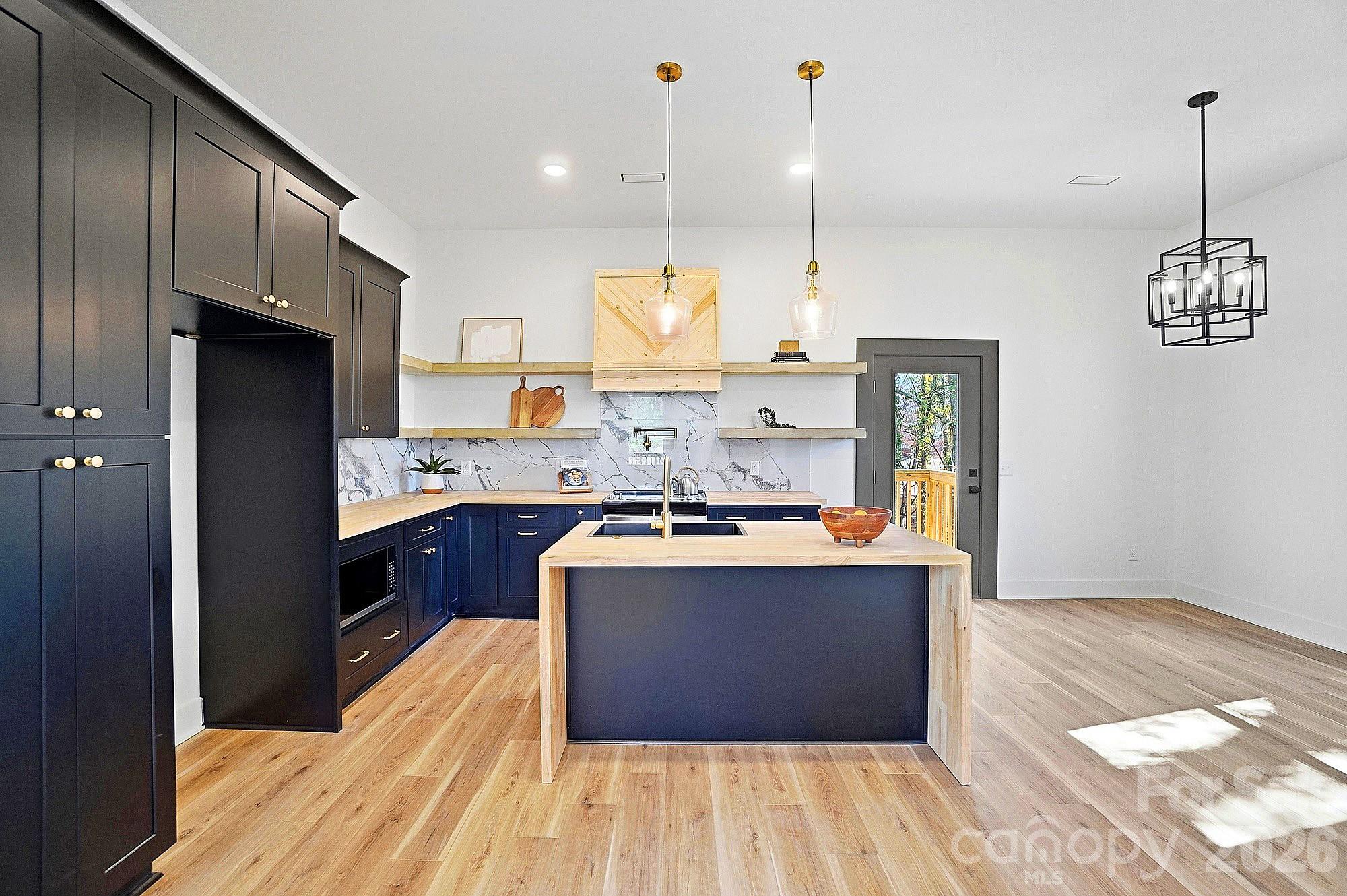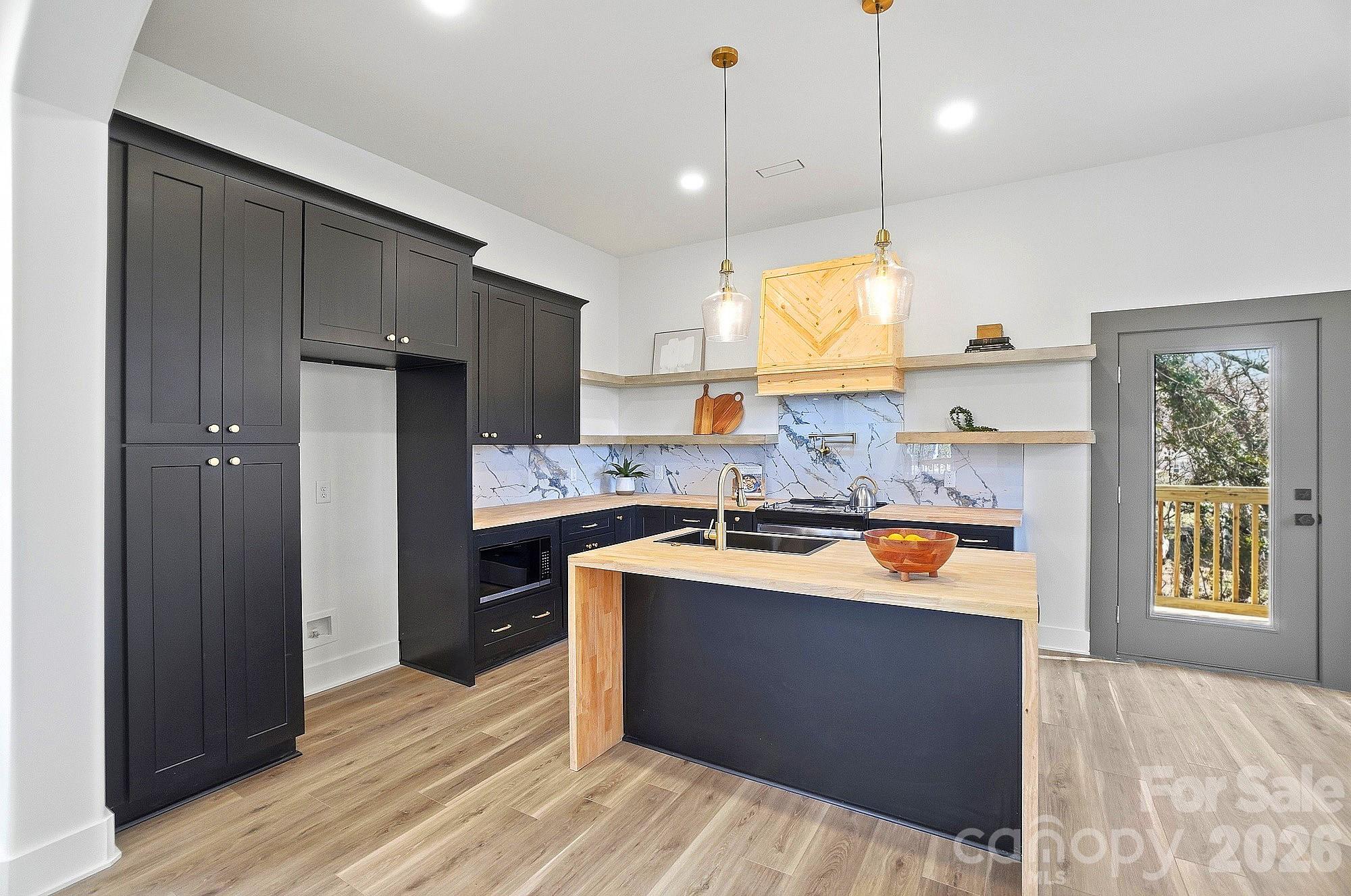 The show-stopping kitchen is the heart of the home, featuring black shaker cabinetry, a waterfall island, stylish pendant lighting, a designer backsplash, pot filler, and a modern apron-style range hood. Open shelving and warm wood accents add character and charm, while the large island provides the perfect space for gathering and entertaining.