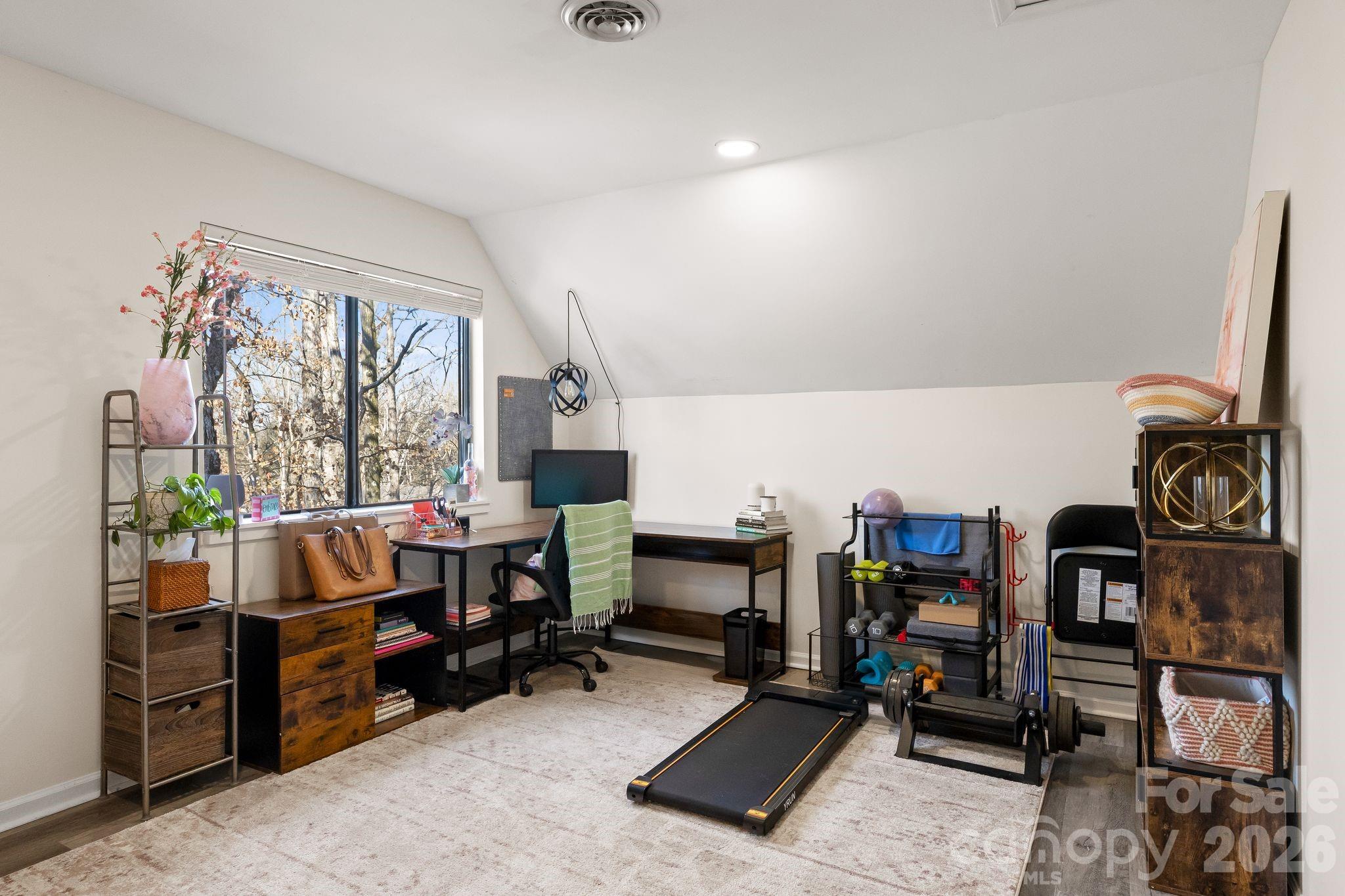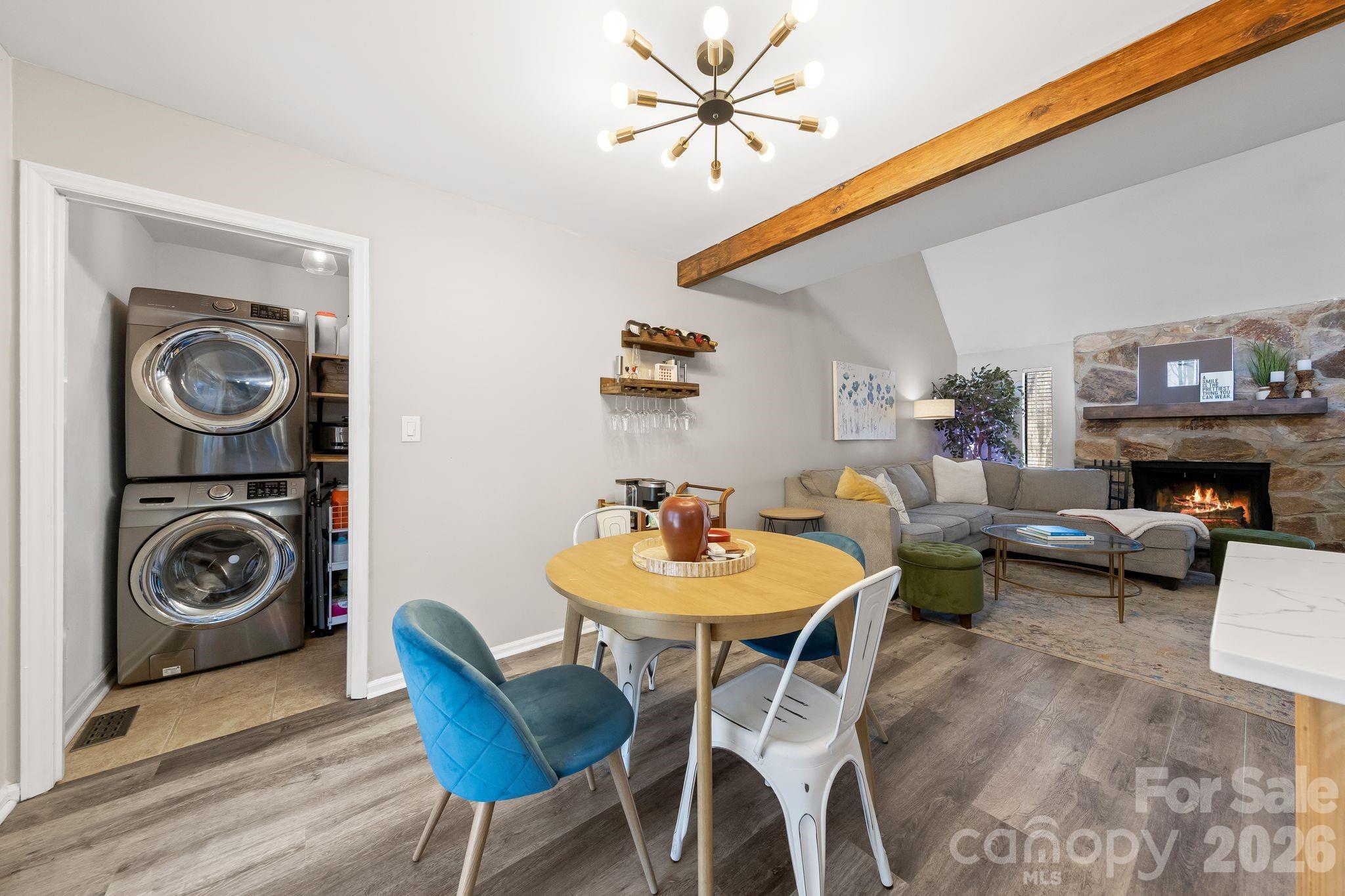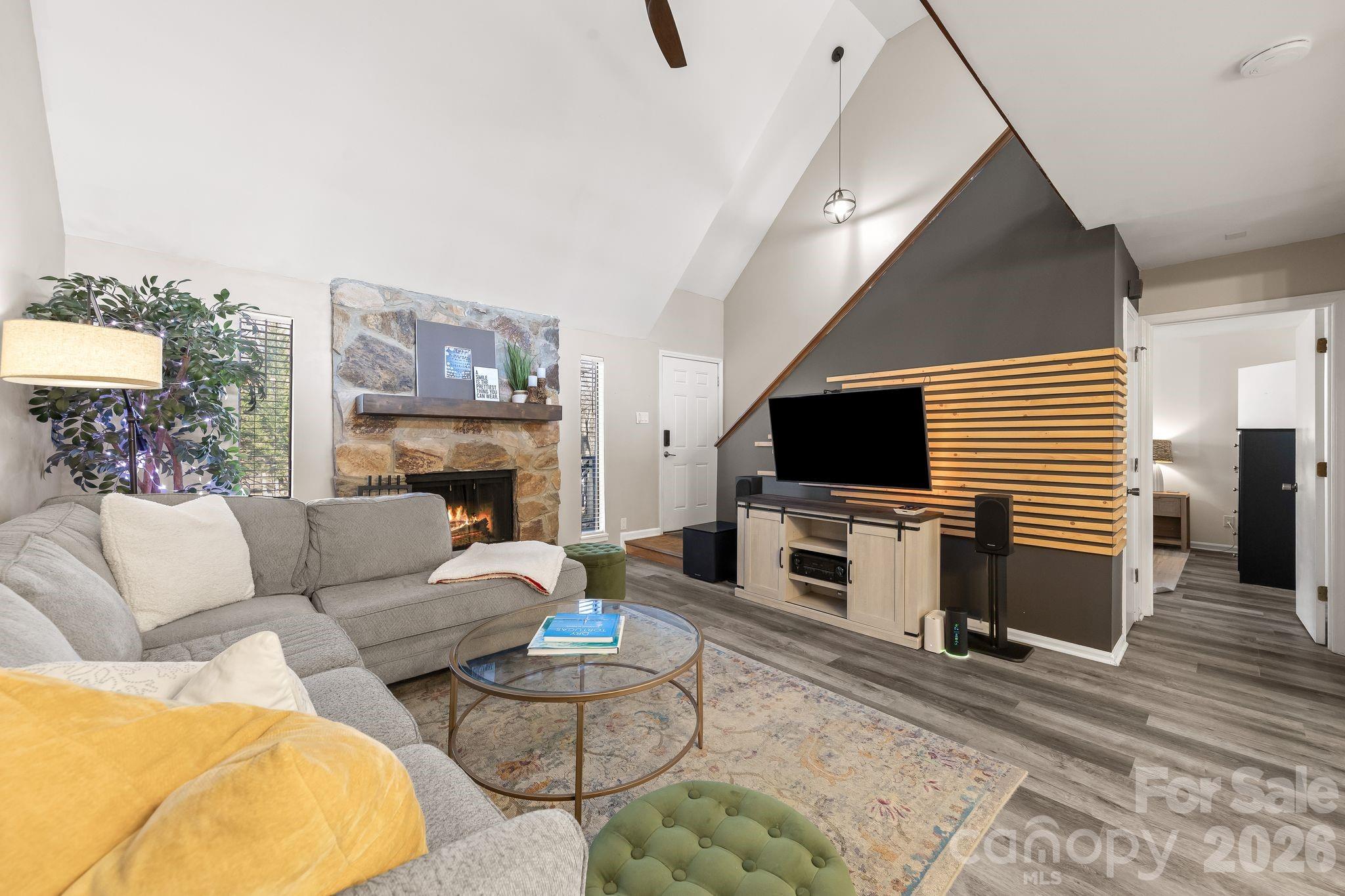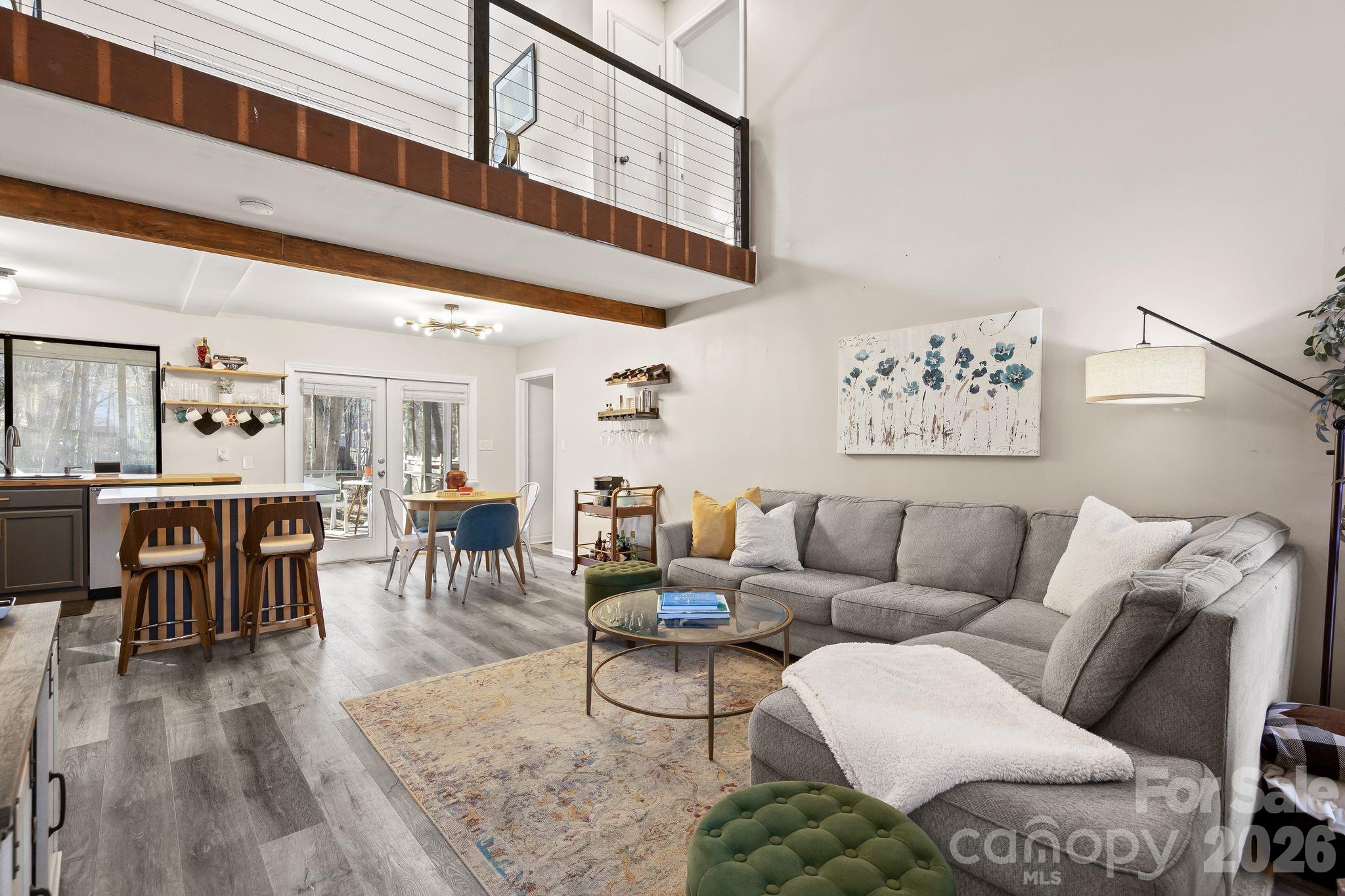 Inside, you’re greeted by a vaulted family room with wood-burning stone fireplace, open to the kitchen and breakfast area. The main living space features vinyl plank flooring, exposed wood beam ceilings, a custom slatted wood feature wall and kitchen island. The kitchen offers stainless steel appliances, butcher block countertops, and a converted under-stair storage space now serving as a pantry. Primary bedroom and updated bath on main provide separation from other bedrooms. A versatile loft presents ideal flex space for work, play, or guests.