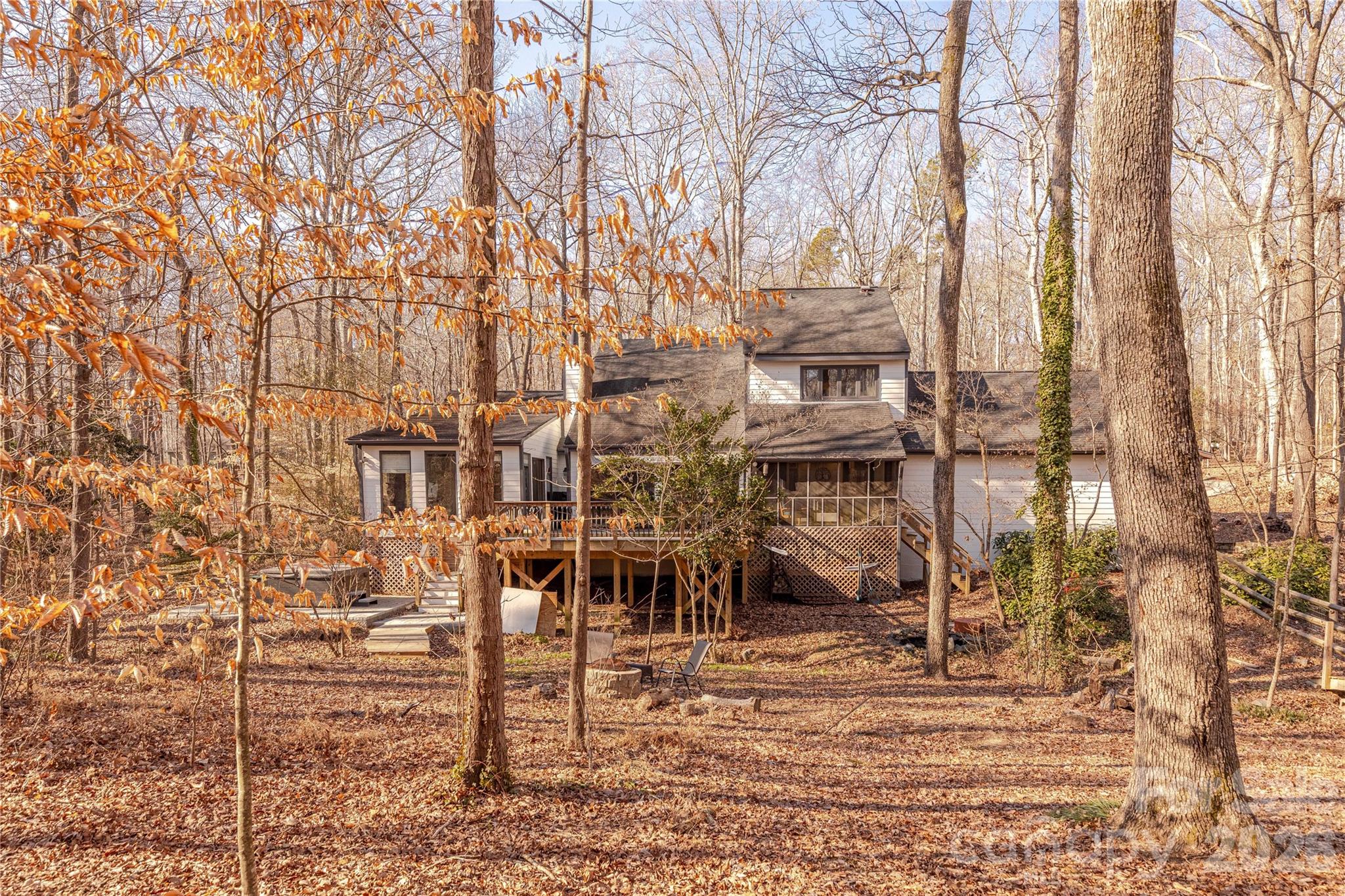 Situated on a private 2.5 acre lot in Weddington’s desirable Wellington Woods community, this meticulously updated home offers the perfect combination of character and elegant living. The split foyer entrance features custom bamboo flooring which leads to the dramatic natural light filled sunken great room complete with cathedral vaulted ceiling, dramatic wood burning stone fireplace and wrap around sliding doors. Gourmet chef’s kitchen has been updated with refinished white cabinets, granite counters, custom glass / stone backsplash and stainless appliances. Flexible dining room off the kitchen leads to the relaxing screened porch. Enormous primary suite features vaulted ceiling plus wood covered flex room with 270 degrees of natural light. Large walk-in closet plus primary bath including double vanity, glass enclose shower & garden tub. Upstairs features two generous bedrooms with Jack N Jill bathroom plus flexible loft space. Relax on the expanse new deck overlooking the fenced backyard which includes multiple bridges, koi pond, entertaining patio with hot tub and massive natural area beyond the fence. Oversized garage includes remarkable attached workshop. Conveniently located moments from premier shopping, dining and entertainment with fantastic Weddington school assignments, this is a must see.