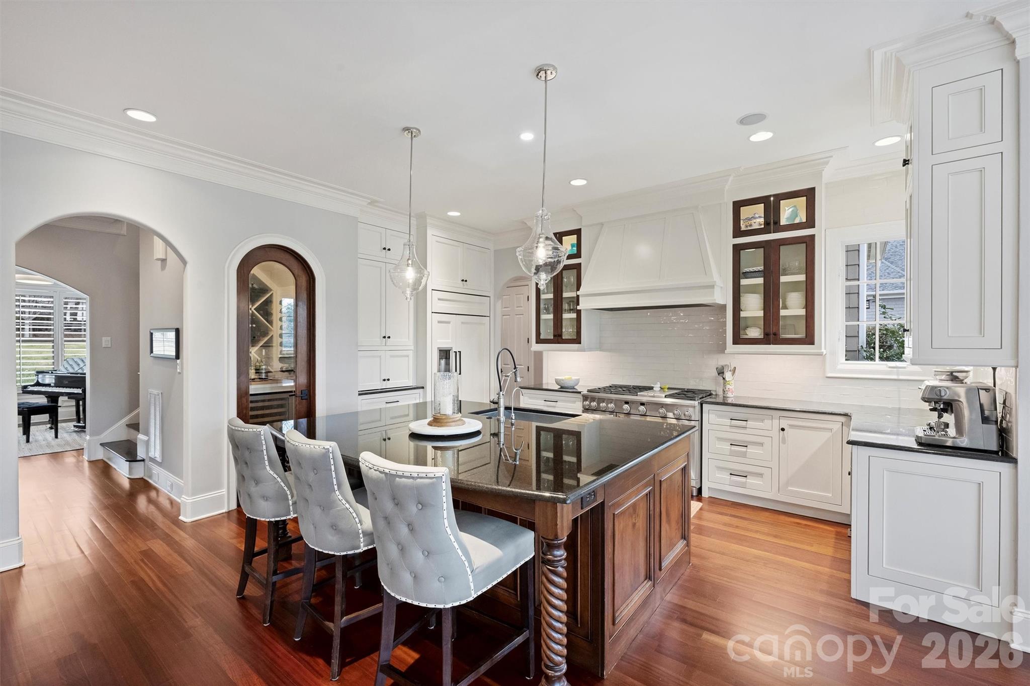 A comprehensive 2017 main-level renovation transformed the heart of the home, including the chef’s kitchen, breakfast room, wine alcove, laundry room, drop zone, and powder bath. The open-concept entertainer’s kitchen features Monogram appliances, a six-burner gas range with griddle and double ovens, a cabinet-paneled refrigerator, dual refrigerator drawers, granite countertops, an oversized island with seating and two refrigerator drawers, a farmhouse sink, an appliance cabinet/coffee station, and a butler’s pantry with leathered granite and a built-in ice maker. Custom cabinetry and floor-to-ceiling storage blend elegance with functionality. A custom wine alcove with built-in shelving and a U-Line wine cooler completes the space.