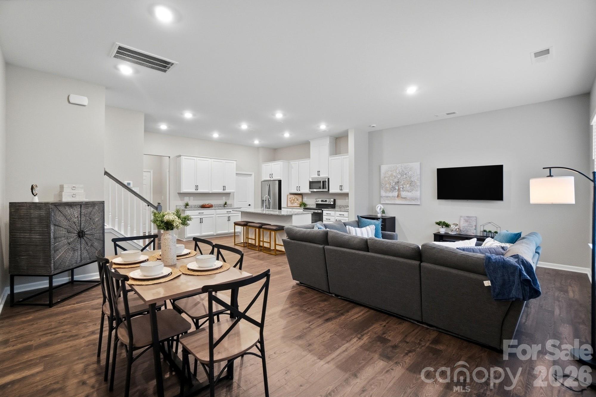 Welcome to 8928 Morning Mist Road in Charlotte, NC 28215, a spacious, low-maintenance townhome offering over 2,000 square feet of thoughtfully designed living space! The main level features an open-concept floor plan perfect for everyday living and entertaining. The expansive kitchen boasts granite countertops, stainless steel appliances, a large island ideal for gathering, and an oversized walk-in pantry. The kitchen flows seamlessly into the dining and living areas, creating a bright and functional layout. A convenient half bath and ample storage complete the downstairs level. Enjoy private parking with a two-car attached garage. Upstairs, you’ll find three spacious bedrooms plus a versatile loft and additional flex space, perfect for a home office, playroom, or media area. The generous primary suite offers dual closets and a spa-like bathroom featuring dual vanities, a large soaking tub, walk-in shower, and private water closet filled with natural light. The split-bedroom layout provides privacy, with two secondary bedrooms that include large walk-in closets and share a full bath. The laundry room is conveniently located upstairs. This beautifully designed townhome combines space, functionality, and low-maintenance living in a prime Charlotte/Harrisburg location. Don’t miss your opportunity to call this one home!