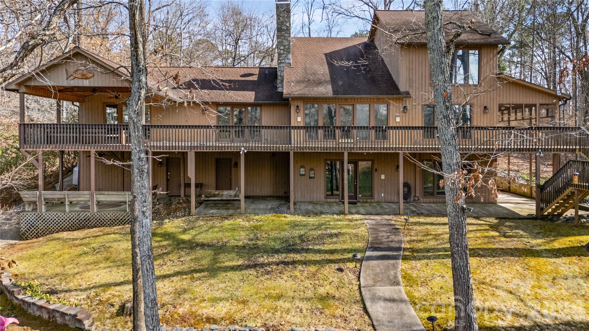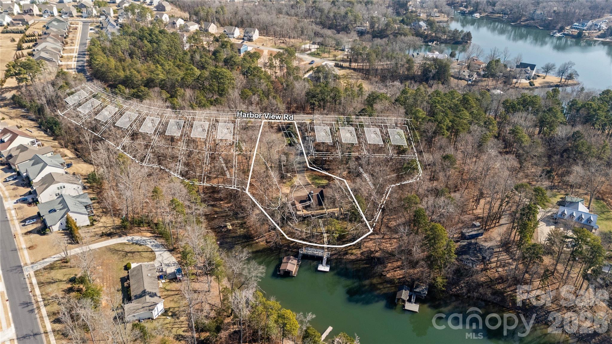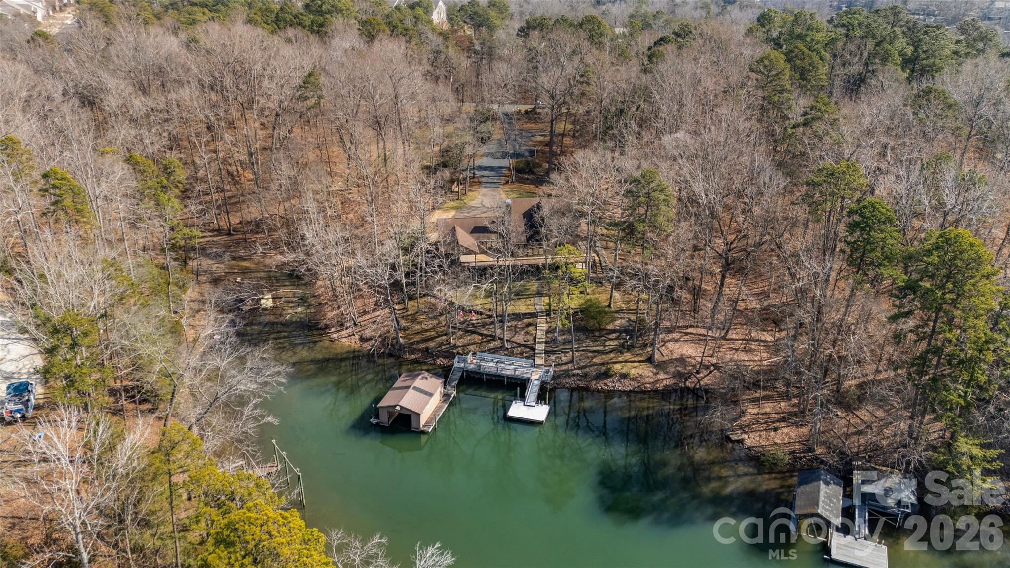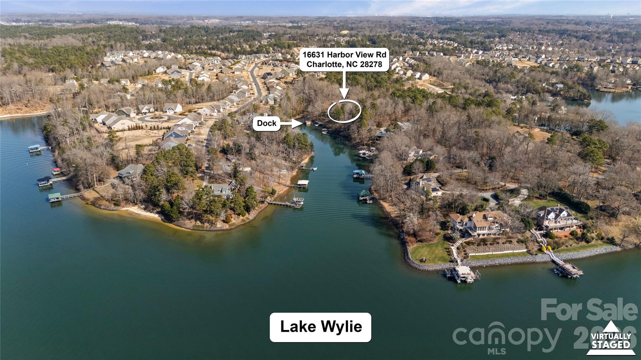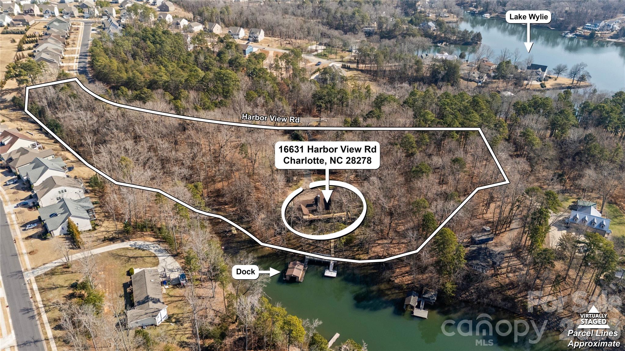Set on 5.79 private acres along the shores of Lake Wylie and just minutes from the energy of Charlotte, this rare waterfront estate offers the ultimate balance of seclusion and accessibility. Positioned inside a quiet, protected cove, the property delivers calm, usable water and main channel sunset views — a combination discerning lakefront buyers understand is increasingly difficult to find. Inside, a welcoming foyer opens to expansive living spaces defined by soaring ceilings, grand stone fireplaces, and walls of windows framing water views. The main-level primary suite is privately situated and generously scaled, featuring custom built-ins, stunning lake views, and direct access to the covered rear deck — an ideal setting for a future hot tub or screened retreat for year-round enjoyment. The primary bath includes an extraordinary 9x18 walk-in closet. Secondary bedrooms are thoughtfully positioned for privacy, while multiple flex spaces accommodate executive home offices, media rooms, fitness studios, or hobby areas. The lower level offers substantial storage capacity, perfectly suited for paddleboards, boating equipment, and all the essentials of lake living. Outdoor spaces are designed to embrace the setting, including a wraparound deck, screened porch, and lower-level patio that seamlessly extend entertaining and relaxation outdoors. Extensive private docking features covered boat storage and a swim platform. A powered, detached shed offers potential as a workshop or pub shed, and parking for 15+ vehicles provides exceptional convenience for gatherings. Large-acreage waterfront tracts within Charlotte city limits are increasingly scarce, making this offering not only a lifestyle acquisition but a strategic long-term hold. Whether preserved as a secluded legacy estate, enhanced into a multigenerational family compound, or thoughtfully expanded via development potential (subject to approvals), the flexibility here is nearly impossible to replicate in today’s market. All HVACs and water heater 4 years old. Whole house generator. Multiple membership options available at The Palisades CC. Conceptual renderings for 12 homesites on the adjacent parcels available to illustrate the vision for what this extraordinary property can become.