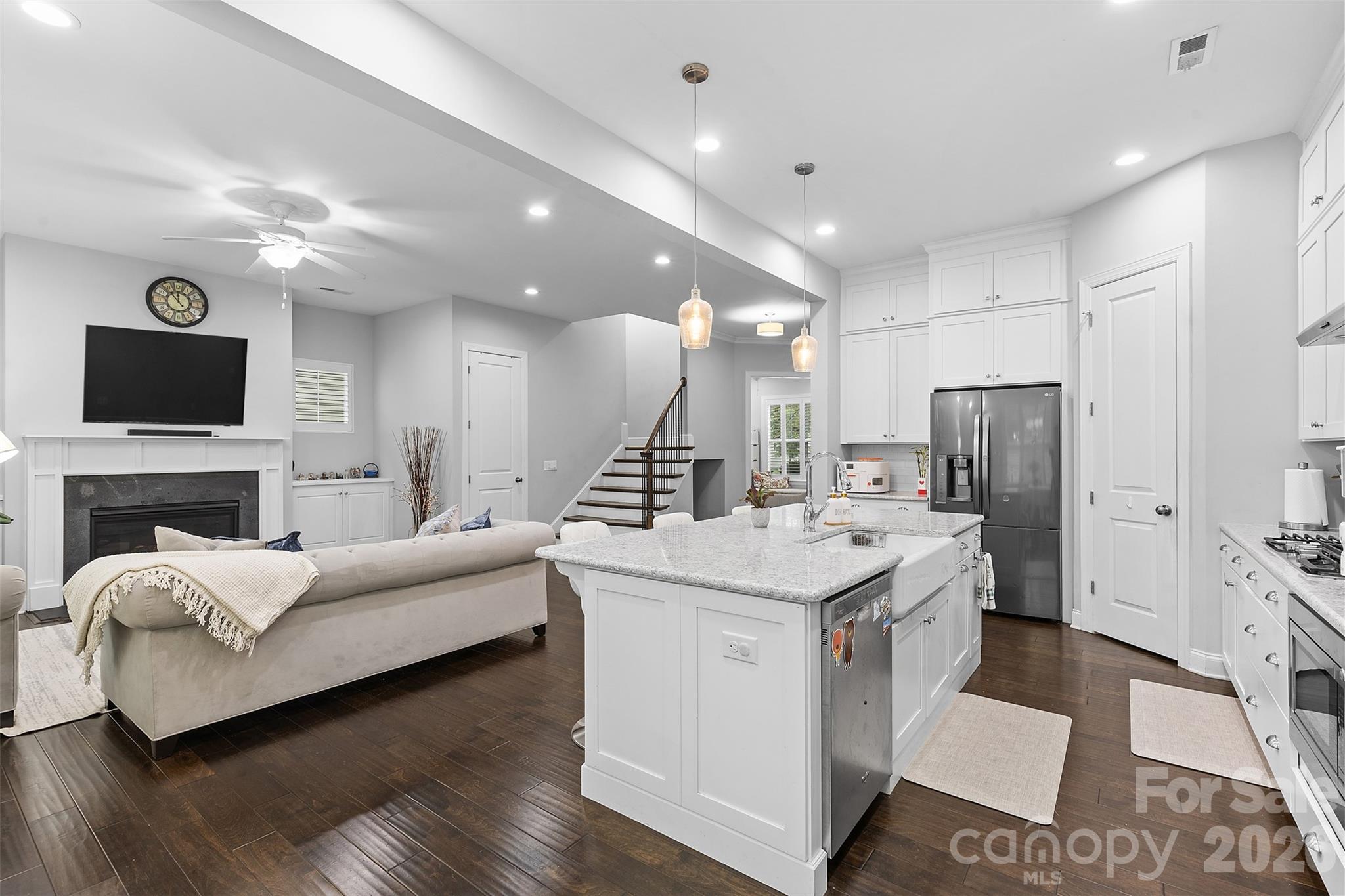 Step inside to a bright, open-concept floor plan filled with natural light, soaring ceilings, elegant built-ins, and a cozy gas fireplace that anchors the living space beautifully. The kitchen is truly the heart of the home — featuring a large center island, abundant cabinetry, and seamless flow into both dining and breakfast areas. Whether you’re hosting holidays or casual get-togethers, this layout was designed for connection. Designer lighting and smart switches add modern convenience and elevated style throughout.