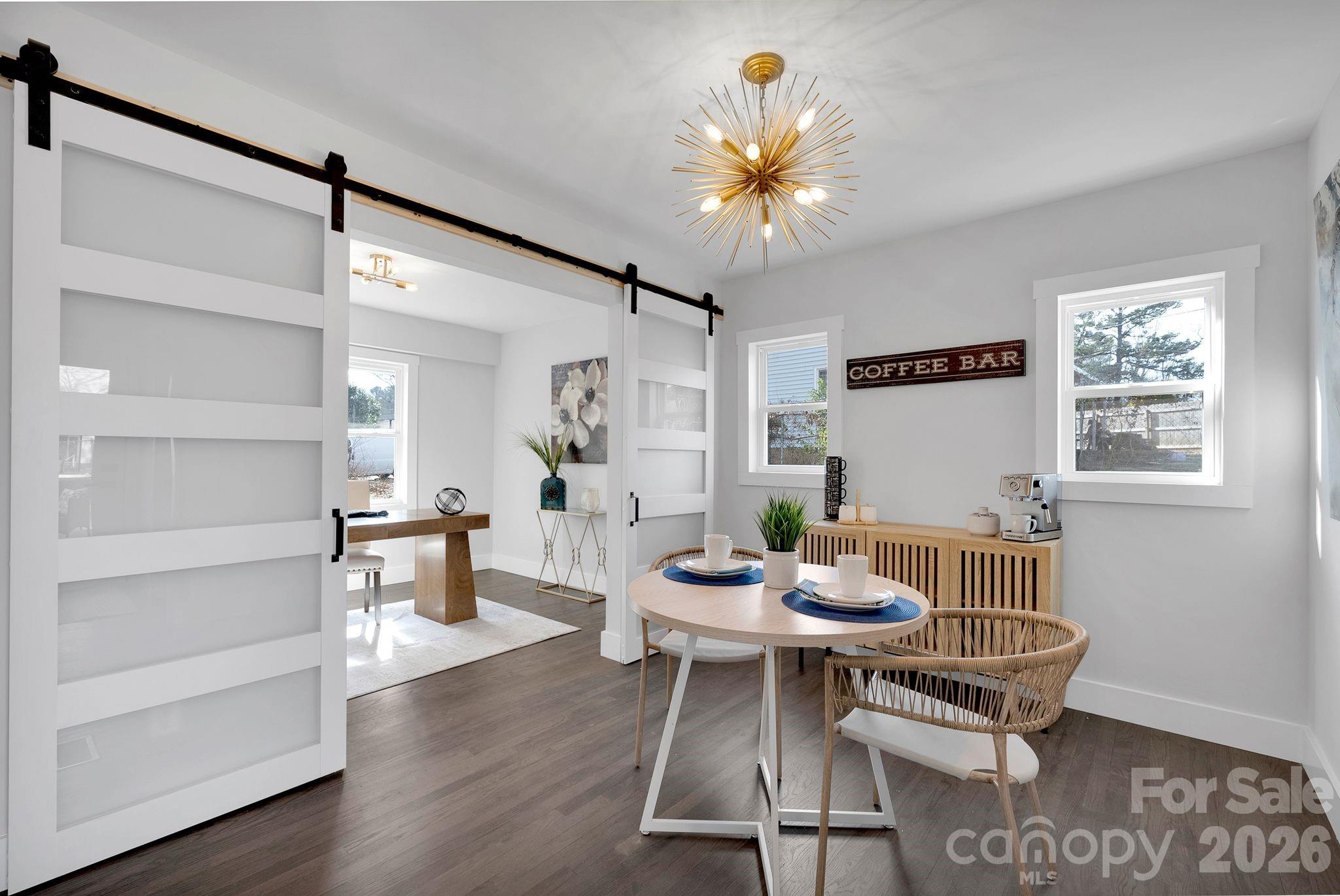 The redesigned kitchen shines with all-new cabinetry, countertops, and appliances, plus a stylish flex space with frosted glass barn doors — perfect for a home office, coffee bar, or creative studio. Both bathrooms have been completely remodeled with new vanities, tile floors, updated fixtures, and tile-surround tub/showers. The former half bath has been converted into a private full bath off the primary bedroom, giving the home a true suite-style layout.