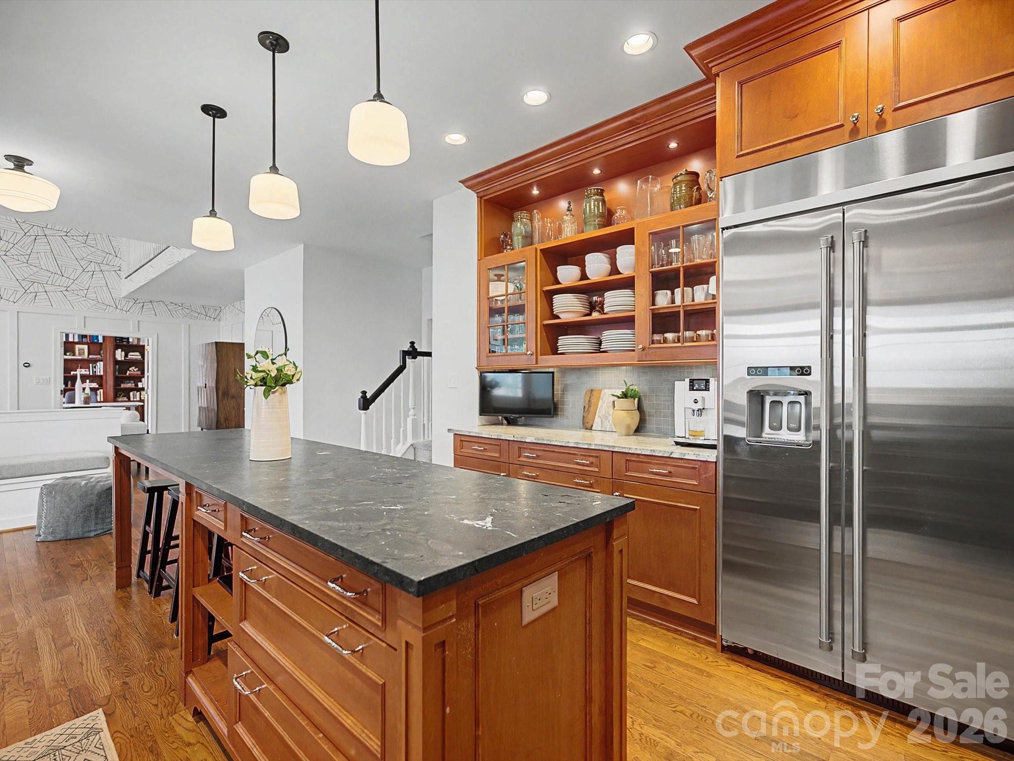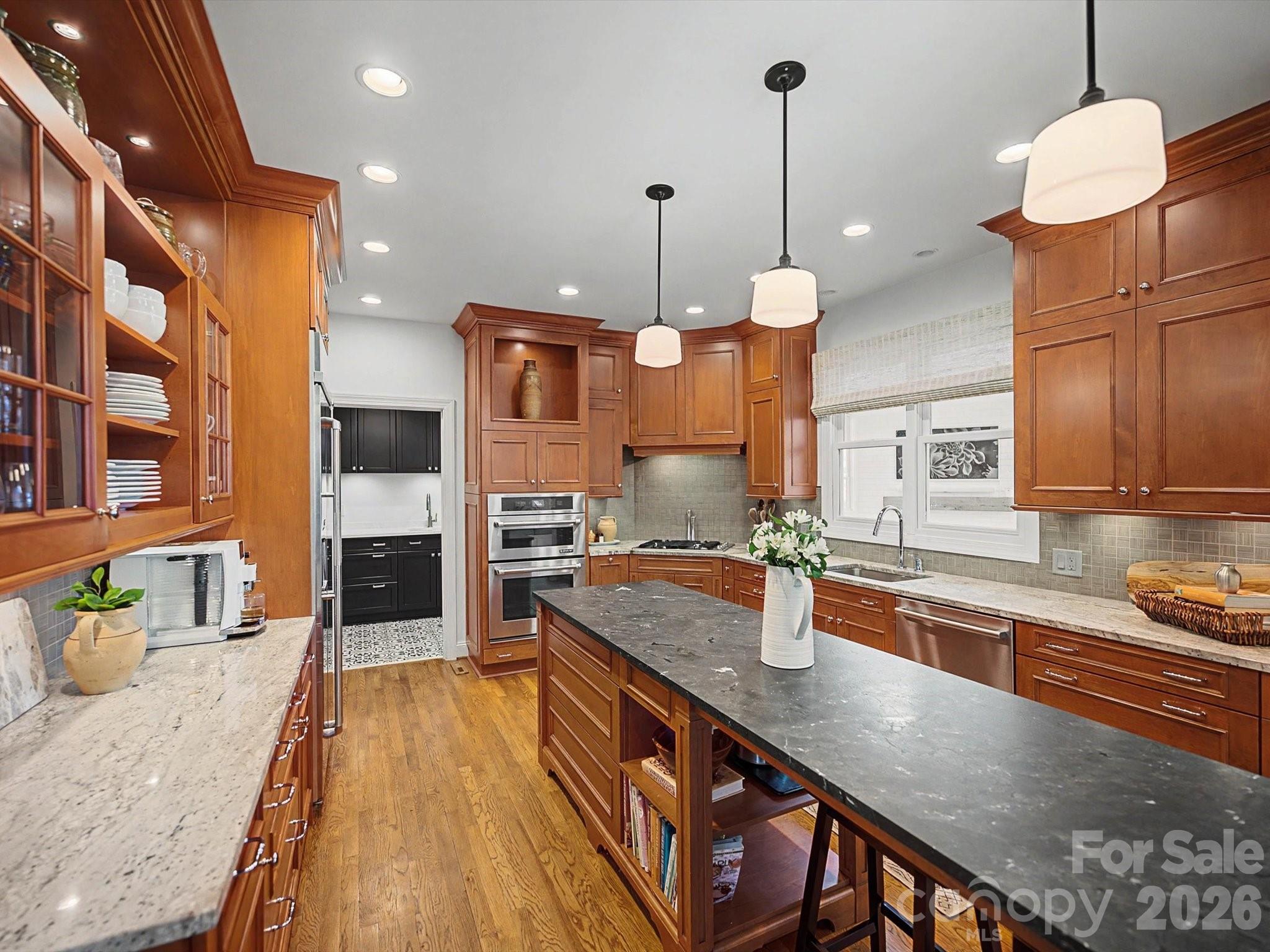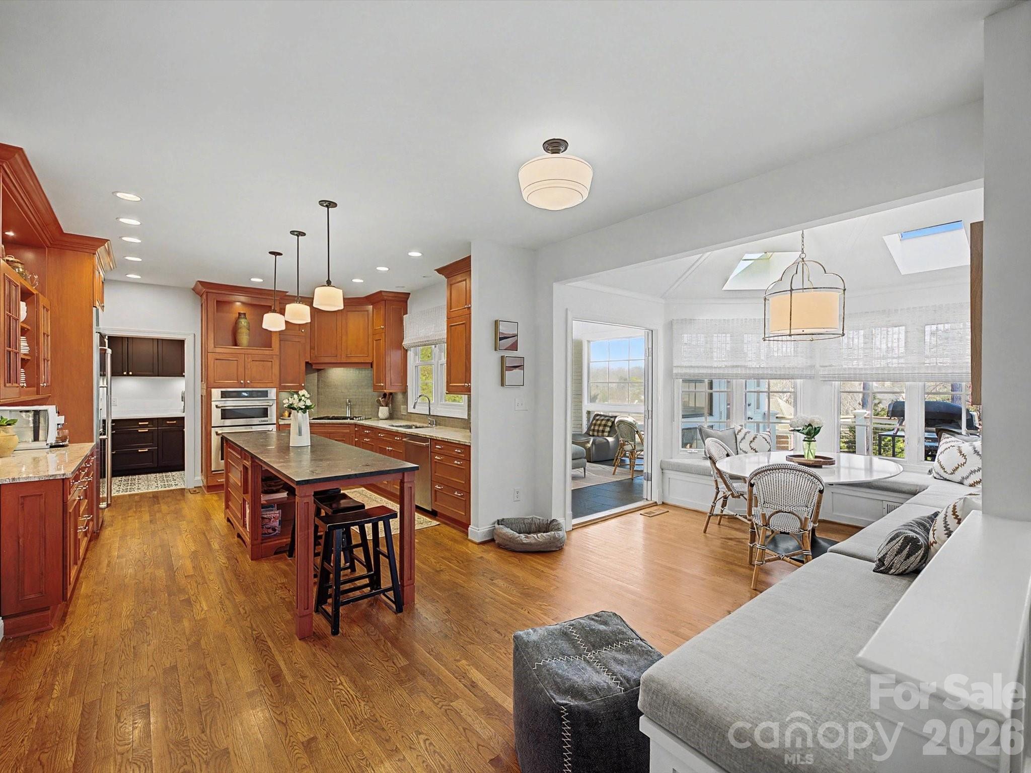The main level features expansive living areas and an open flow perfect for entertaining. Gleaming hardwood floors and heavy custom millwork create an atmosphere of warmth and sophistication throughout. The chef’s kitchen has been thoughtfully updated with designer finishes, offering plenty of cabinetry, premium appliances, and a large center island — ideal for both casual meals and large gatherings.