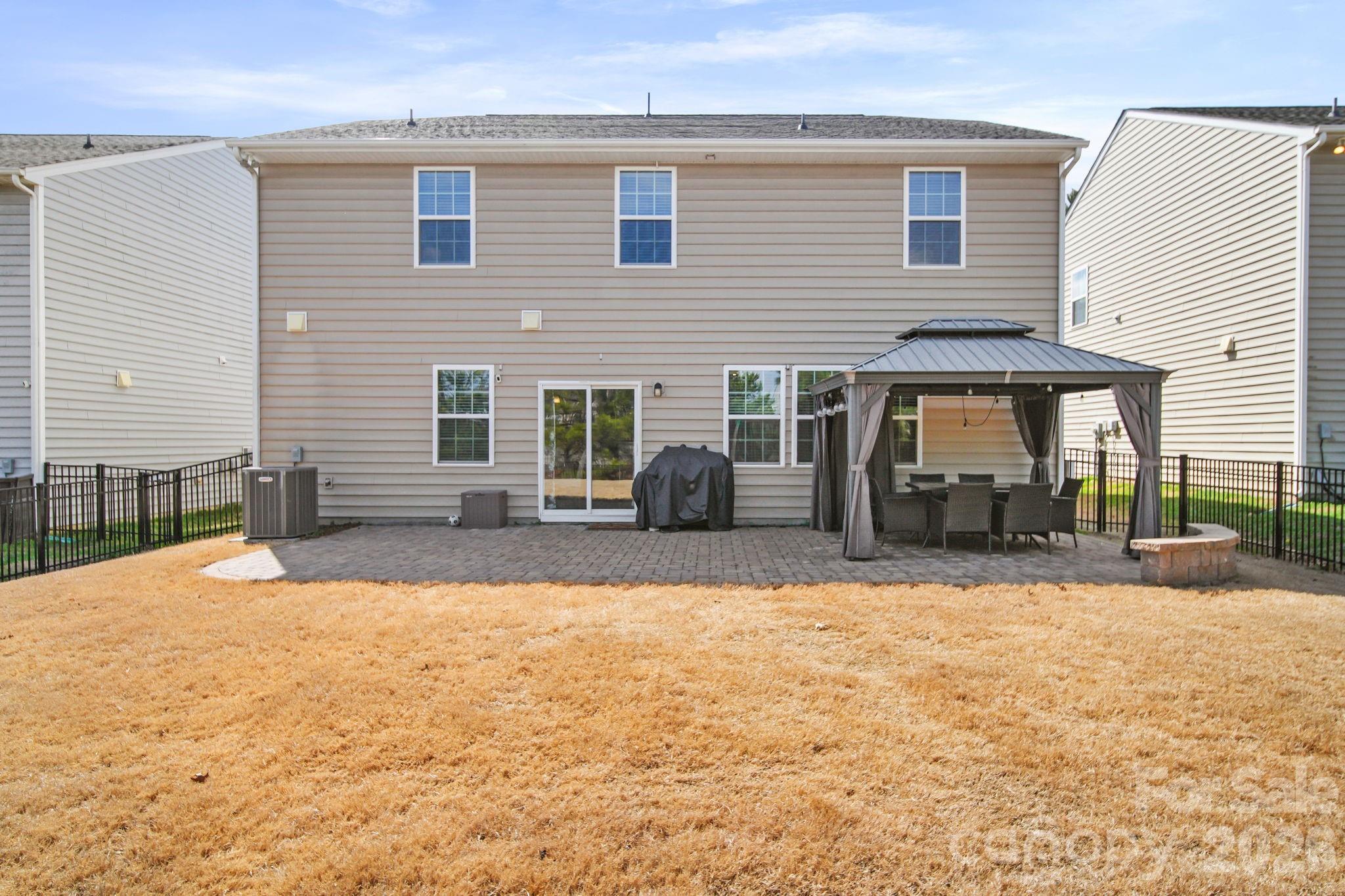 Spacious 4-bedroom home offering the ideal blend of modern design, functional living space, and exceptional outdoor entertaining areas. Featuring 9-foot ceilings, abundant natural light, and a highly desirable open-concept layout. Engineered wood flooring flows throughout most of the main level, creating warmth and continuity across the primary living spaces. The kitchen serves as the centerpiece of the home, showcasing granite countertops, stylish cabinetry, a spacious island, gas stove, and an impressive walk-in pantry. The seamless flow into the breakfast area, family room, and patio makes both everyday living and entertaining effortless. The family room offers a welcoming retreat centered around a cozy gas fireplace. A formal dining room provides flexibility for gatherings, while the dedicated office with French doors is ideal for working from home or creating a quiet flex space. Upstairs, the thoughtfully designed layout offers both privacy and versatility. The primary suite is a nice getaway space and features a dual-sink vanity, spacious walk-in shower, and generous walk-in closet. Three additional bedrooms, a versatile loft, full bath, and conveniently located laundry room provide ample space for family, guests, or hobbies. Step outside to a backyard designed for enjoyment and entertaining, featuring a full-length paver patio with built-in seating ledge, fully fenced yard, gazebo, and swingset. Gazebo and swingset convey. Additional highlights include a covered front porch, two-car garage, and peaceful setting facing treed common space. Located in the sought-after Chateau community offering pool, tennis courts, playground, and sidewalks — all within a short walk. Conveniently situated just minutes from restaurants, shopping, and major travel routes. https://listings.carolinahomephotos.com/sites/rzqjvjgm/unbranded