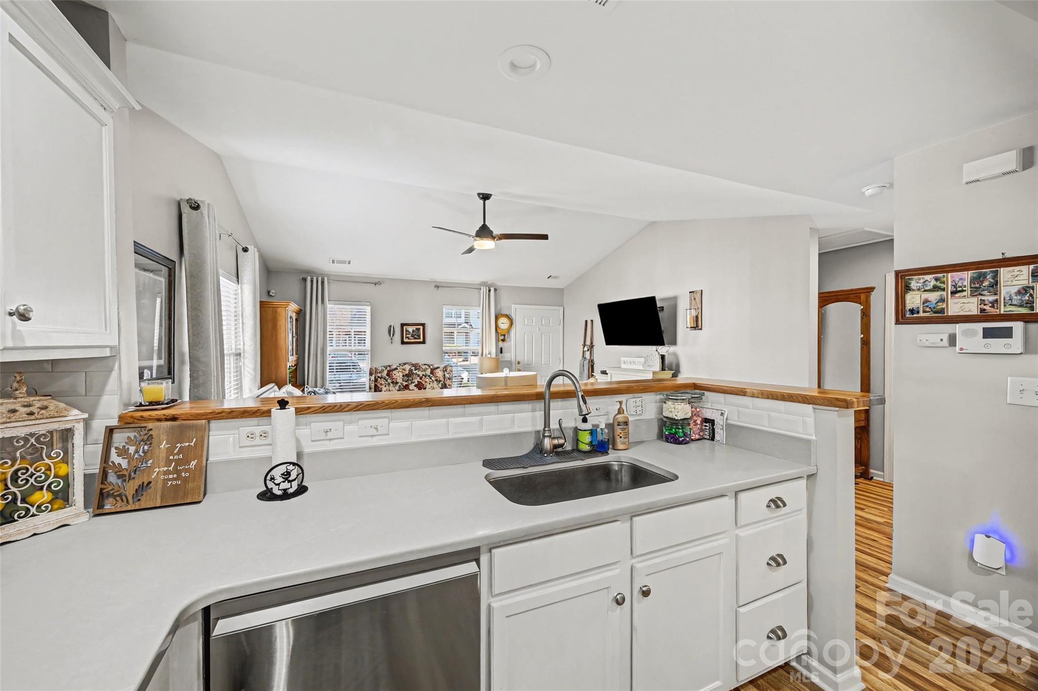 Welcome home to this beautifully updated Ranch END UNIT townhome in the highly desired Hanover Community in Indian Land! This 2-bedroom, 2-bath home features a renovated kitchen with butcher block countertops, quartz surfaces, stylish backsplash, and new laminate flooring that flows into the spacious family room. Vaulted ceilings in both the family room and primary suite enhance the spacious feel, while neutral tones and plentiful natural light create a bright, welcoming atmosphere. Step outside to a peaceful, private backyard with low-maintenance artificial turf or relax on the covered front porch. Enjoy unbeatable convenience with top-rated Indian Land schools, brand-new Costco and Target just across the street, plus shopping, dining, and quick access to the Ballantyne area. Make this beautiful townhome yours today! Washer, dryer and refrigerator will convey. Electric Fireplace and drapes will not convey.