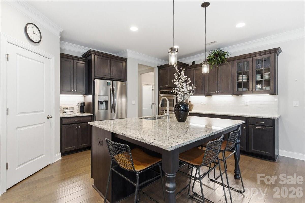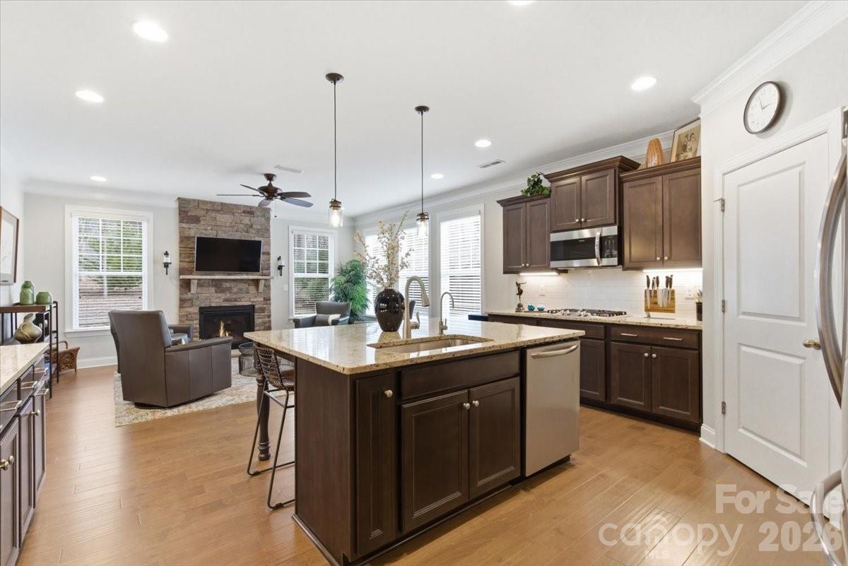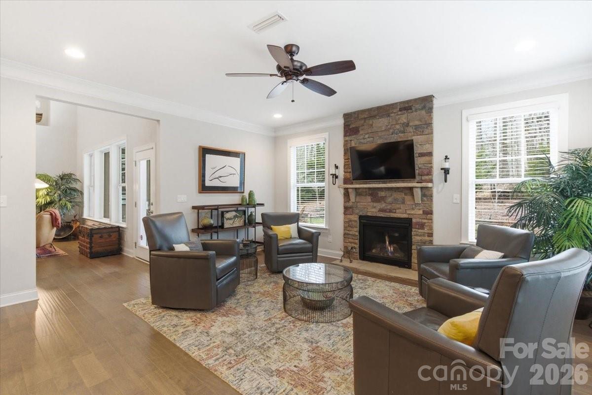 Stunning 3,300 sq ft home featuring 4 bedrooms (primary suite on 1st floor) and 3.5 baths, meticulously maintained with exceptional detail throughout. Heavy moldings, coffered ceilings in the dining room, and a soaring two-story great room create an elegant yet welcoming atmosphere. The functional, open floor plan is ideal for everyday living and entertaining. The gourmet kitchen offers a gas cooktop, double wall ovens, an oversized eat-in island, and opens seamlessly to a cozy keeping room with fireplace — perfect for cooking while staying connected with guests. Upstairs, you’ll find three generously sized bedrooms, all with walk-in closets. One bedroom features a private en-suite bath, while the other two share a Jack-and-Jill bathroom. Enjoy outdoor living on the covered rear stone patio with firepit, backing to a private HOA owned natural area. Ample storage throughout including a walk-in attic. Washer, dryer, two refrigerators, and wine fridge to remain. Assumable VA loan for qualified buyers at approximately 2.75%. Neighborhood amenities are exceptional and include: pool and clubhouse, pickleball courts, covered picnic pavilion, playground, lakeside recreation area with gazebo and paddleboat/canoe launch, walking trails, sidewalks, dog park, and more. Full irrigation system. Termite bond.