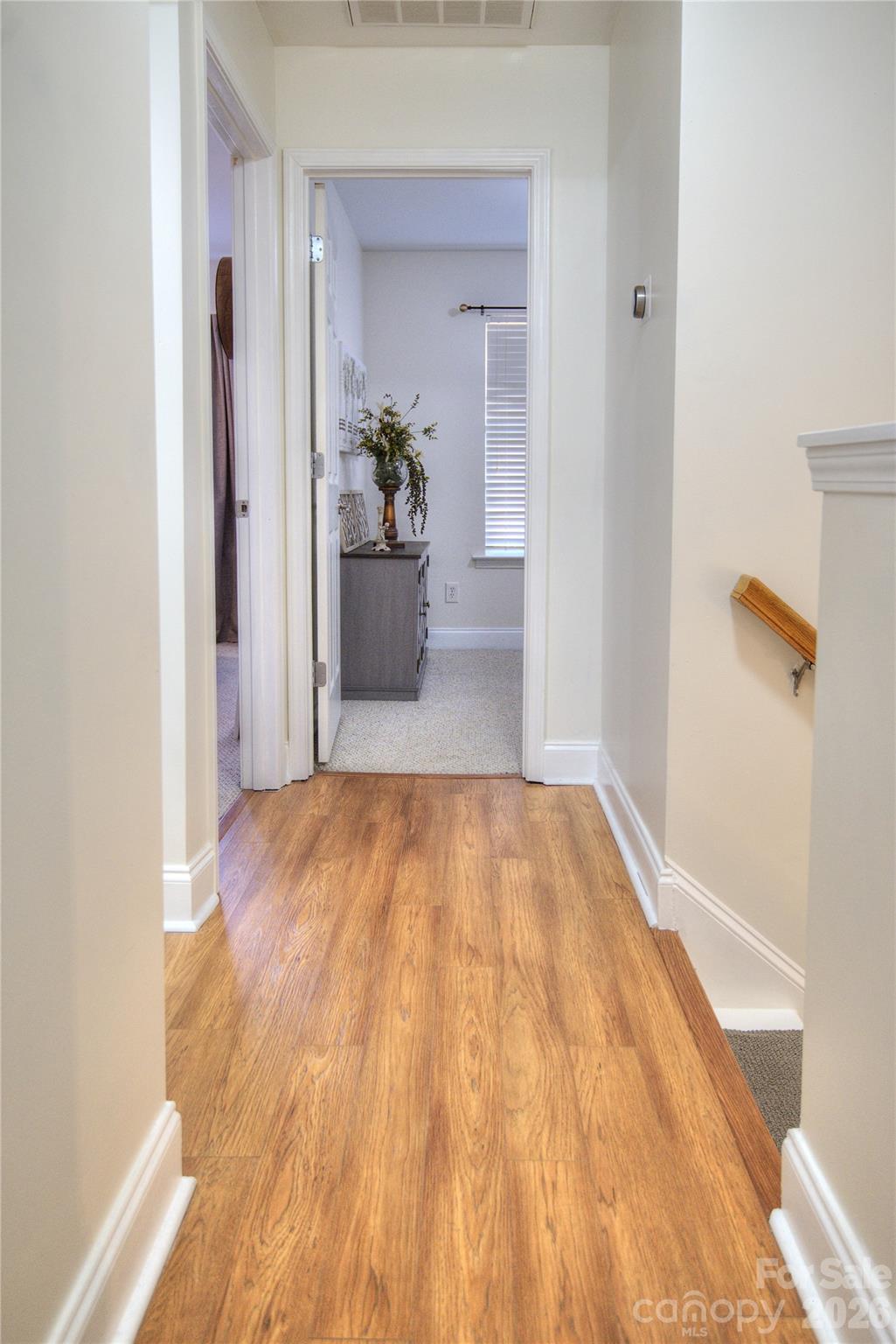 Upstairs, the primary bedroom offers a peaceful retreat with its vaulted ceiling, walk-in closet, and an attached bathroom. The owner thoughtfully added Pergo flooring to the hall and primary bedroom, enhancing comfort and style. The second floor overlooks the living room, with pretty, neutral paint throughout that makes decorating a breeze.