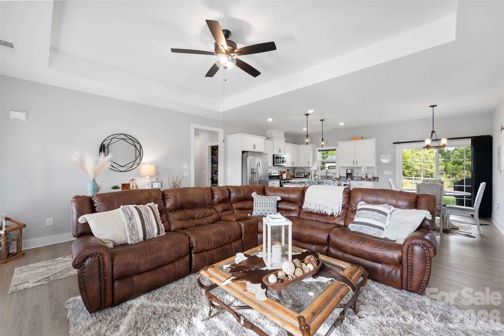 Step inside to an open-concept layout featuring tray ceilings, granite countertops, a tile backsplash, and an oversized walk-in shower—all complemented by modern finishes throughout. The expansive living area flows effortlessly into the kitchen, creating an ideal space for both entertaining and everyday living.