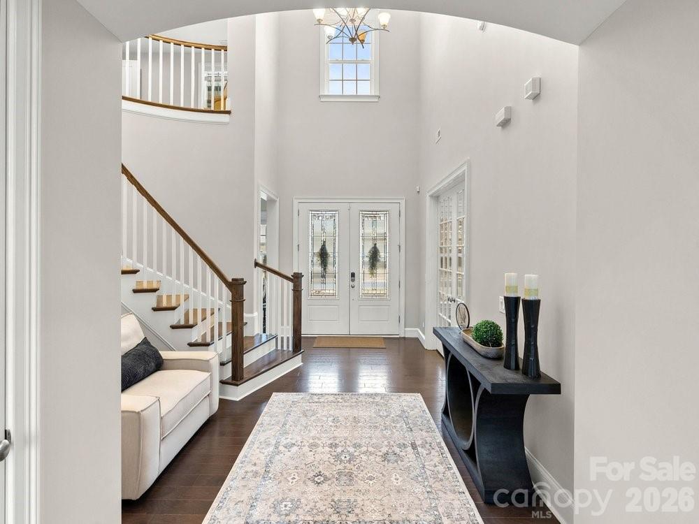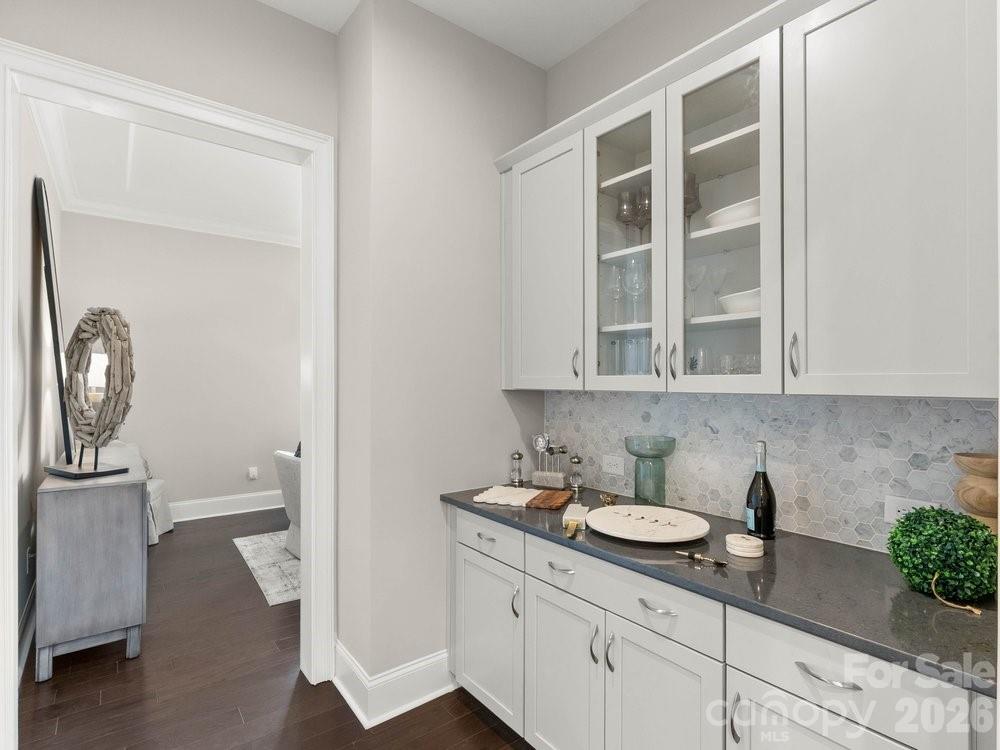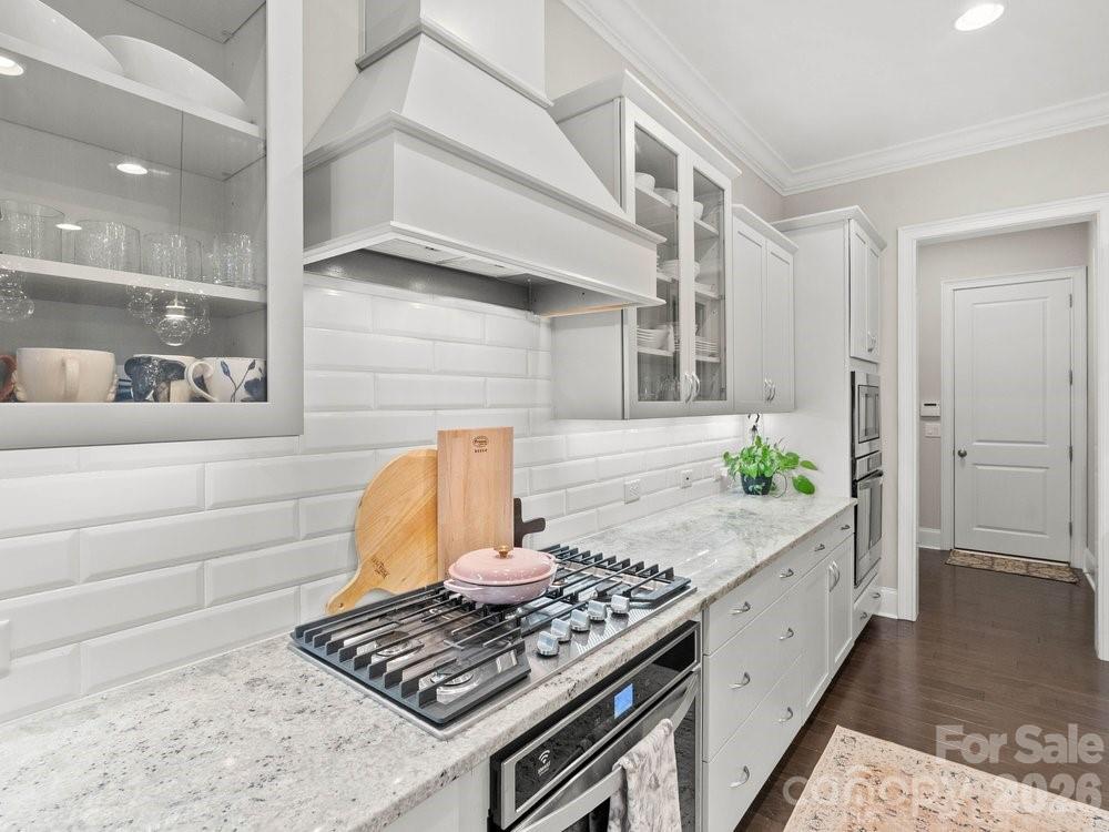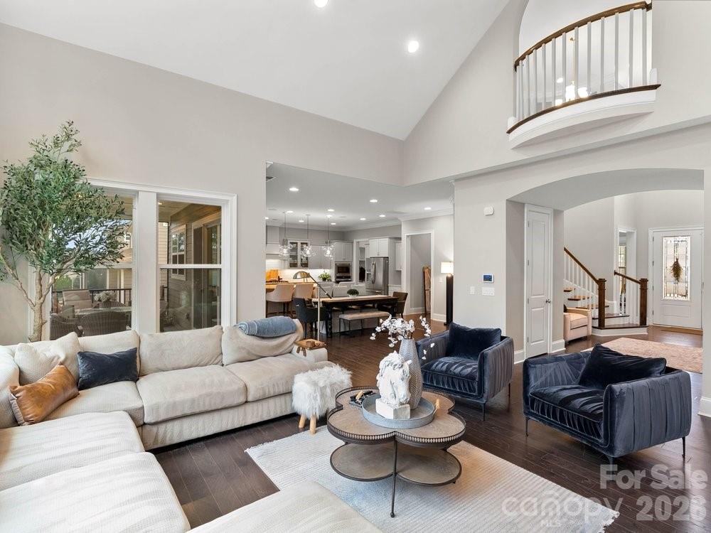 The vaulted great room is filled with natural light from floor to ceiling windows and anchored by a striking stone fireplace. Just beyond, the chef’s kitchen is truly the heart of the home with a wooden hood vent, gas cooktop, quartz countertops, cabinet under lighting, and an oversized island perfect for gathering. A butler’s pantry with glass cabinetry and custom backsplash connects the kitchen to the formal dining room, creating a seamless space for entertaining. Step outside to the expansive screened porch with Trex decking, overlooking a private backyard complete with a paver patio and built in outdoor grill.