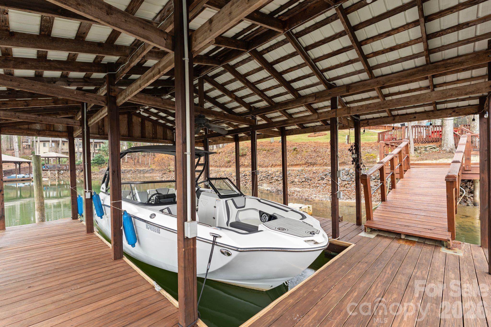 Welcome to this beautiful lakeside retreat nestled on 2.66 acres offering 400' of Lake Norman shoreline. This 5-bedroom, 3-bath ranch home with a fully finished walk-out basement offers a thoughtful blend of comfort, space, and modern updates. Refined landscaping, a new deck, and inviting curb appeal set the tone upon arrival. Inside, the open-concept main level flows seamlessly from the kitchen to the living room, featuring refinished hardwood floors, stainless steel appliances, and a spacious kitchen island ideal for everyday living and entertaining. The main level includes a primary suite, guest bedroom, full bath, a sunroom/office, and laundry room, providing true one-level living convenience. The fully finished lower level expands the living space with a large bonus room featuring a wood-burning fireplace, 3 additional bedrooms, and flexible areas for recreation or gatherings. Multiple storage rooms including a wet storage area, ideal for waterfront living needs making lake days easier. Outdoor spaces are designed to maximize the lake lifestyle, offering a main-level deck, covered lower patio, dedicated fire pit seating area, and a covered dock with boat lift. The 2.66-acre lot provides additional usable land with potential space for future storage buildings, RV parking, or a detached garage - the possibilities are endless. A rare opportunity to enjoy peaceful Lake Norman living with room to relax, entertain, and create lasting memories.