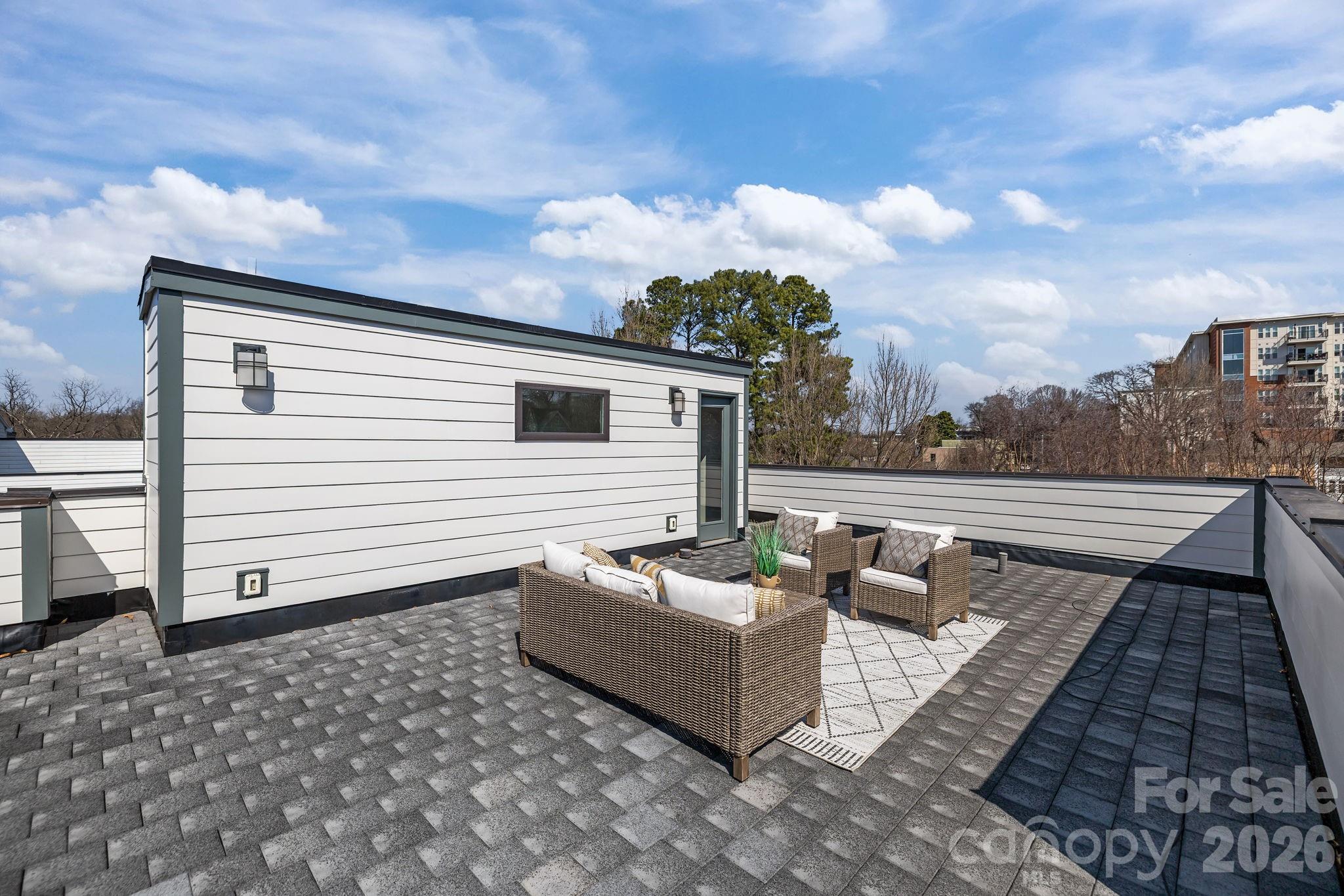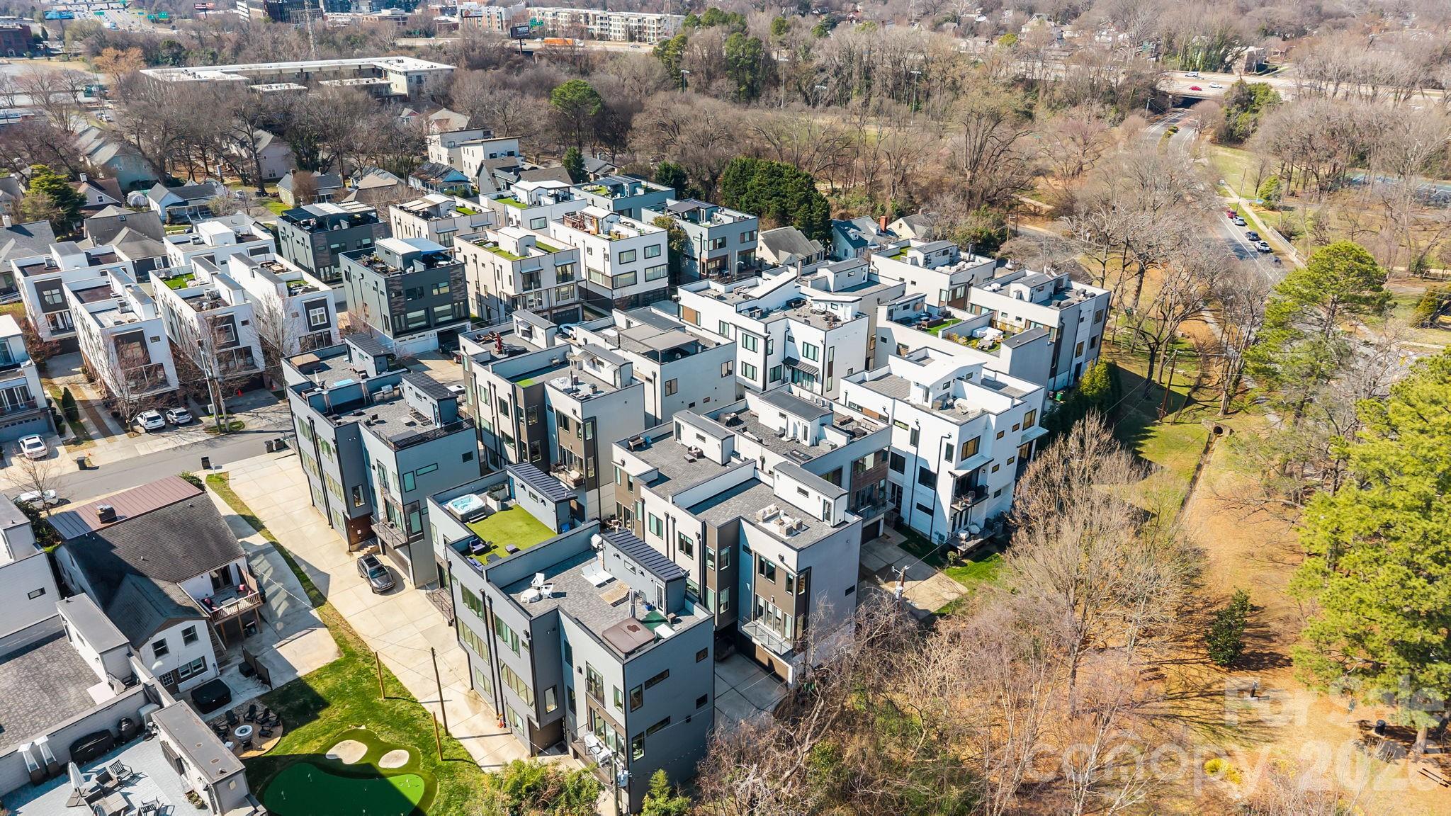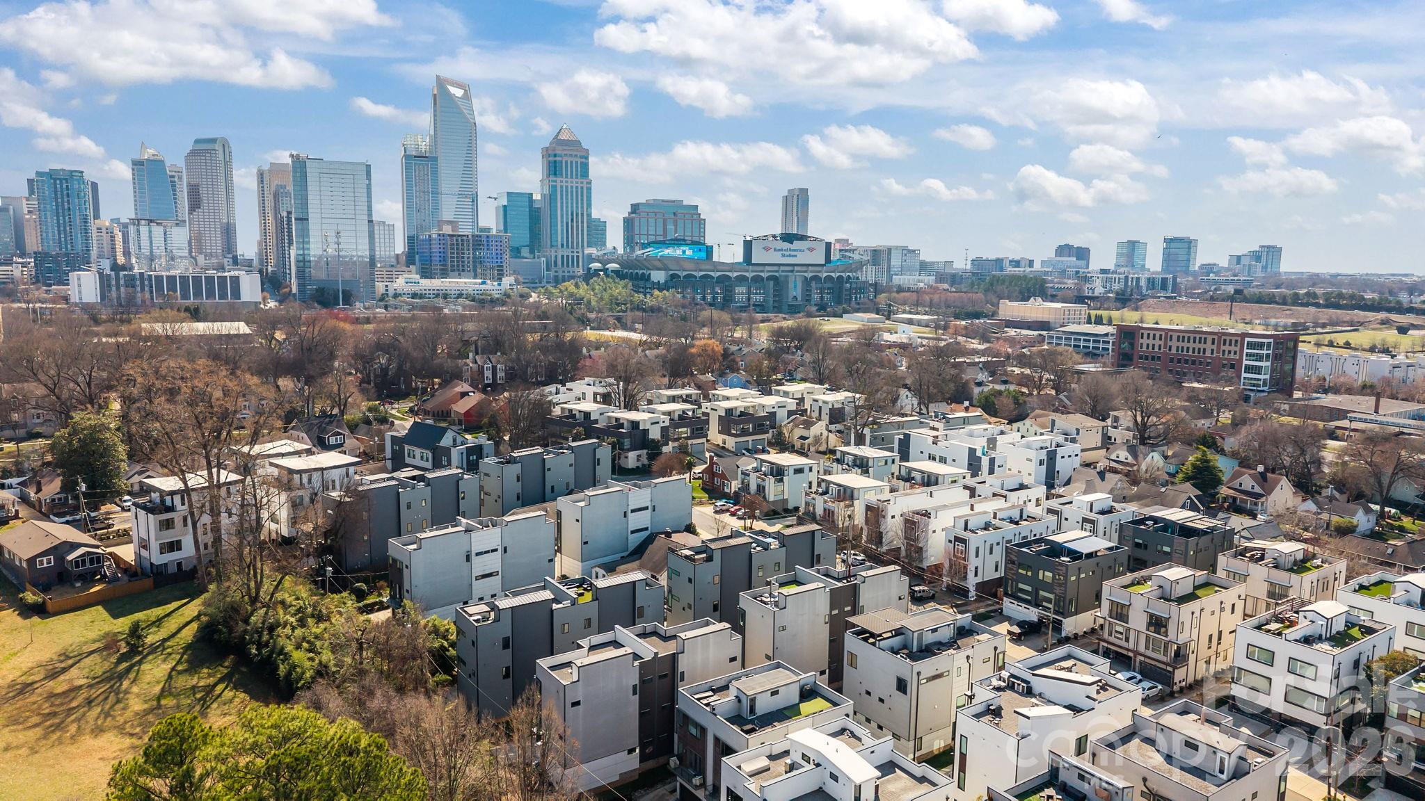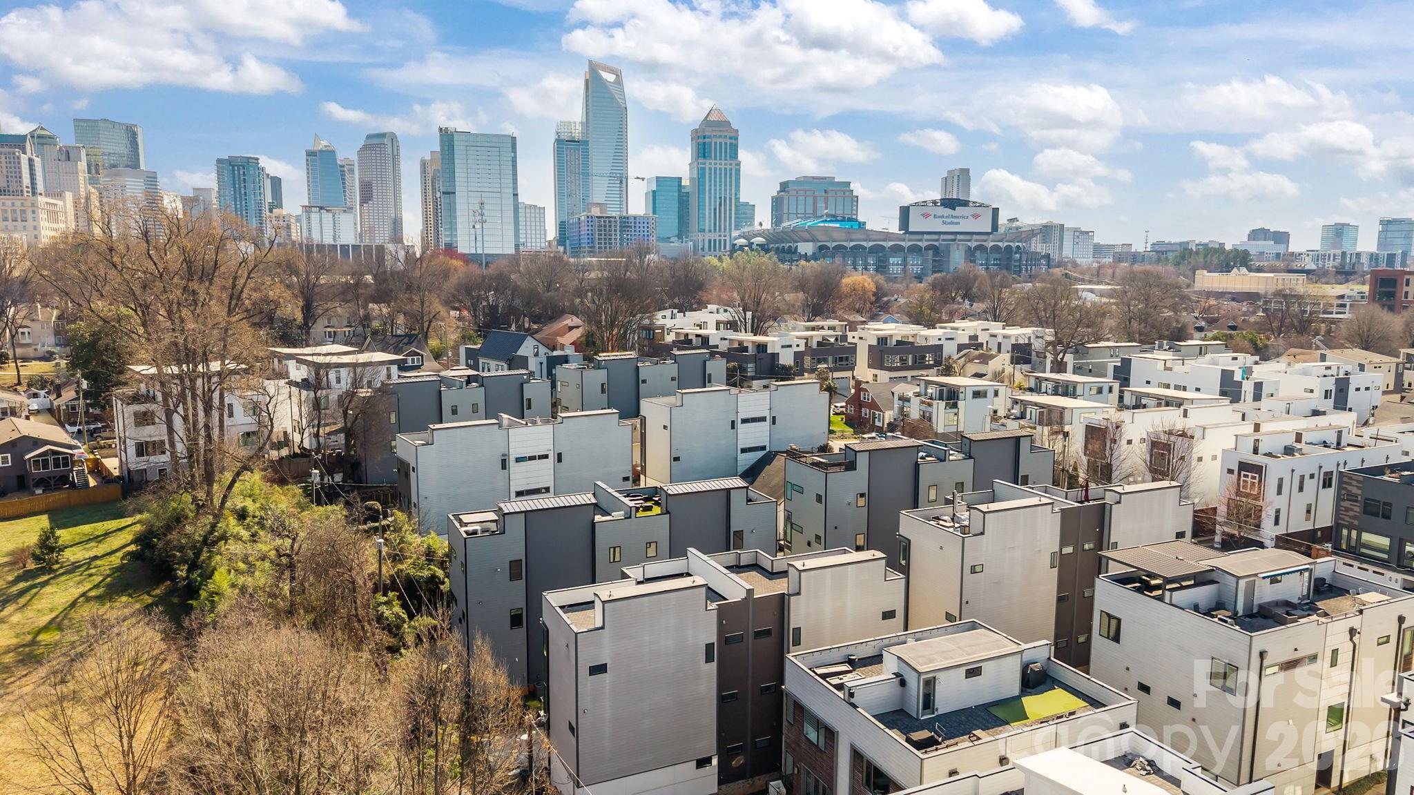 Ultimate Uptown living at its finest at Luxity Terraces in Charlotte’s highly desirable Third Ward. This move-in-ready private END residence features 3 spacious bedrooms, 3 full bathrooms, lovely powder room, and a private two-car garage — a rare Uptown advantage. The home’s hardwood floors flow seamlessly through the kitchen, living, dining, and hallways, while 10-foot ceilings enhance the open, light-filled layout. The kitchen and full baths are appointed with quartz countertops, custom cabinetry, and stainless steel appliances, combining sophistication and functionality, and full baths feature tiled floors and showers with the powder room accented in warm hardwood. A private rooftop terrace provides sweeping Uptown skyline views, offering the perfect setting for entertaining or relaxing above the city. Expansive windows frame serene views of Frazier Park, creating a rare sense of privacy and tranquility in the heart of the city. Just steps from Charlotte’s premier dining, cultural attractions, and professional sports venues, this home delivers the ideal balance of vibrant city life and peaceful retreat. With its exceptional finishes, thoughtful design, generous scale, and unbeatable location, opportunities like this are rare — a home that offers both elevated lifestyle and enduring value. Homes of this caliber attract immediate attention; act now to secure one of Uptown’s most remarkable residences. FRESHLY PAINTED INTERIOR 2026. Water and sewer included
