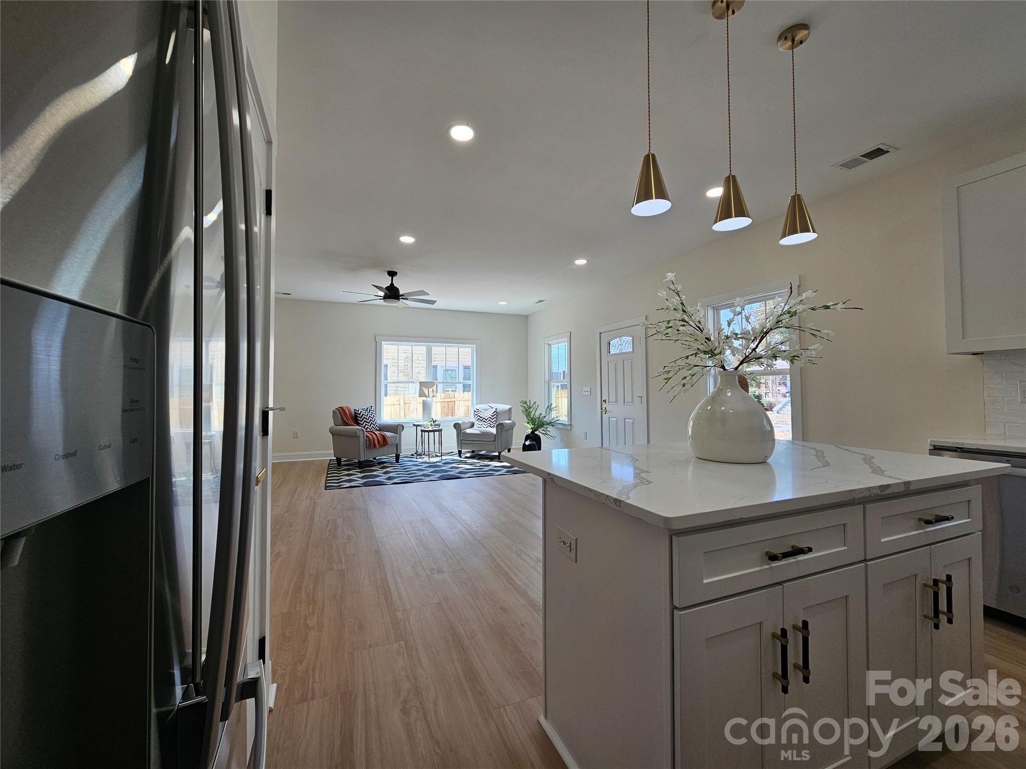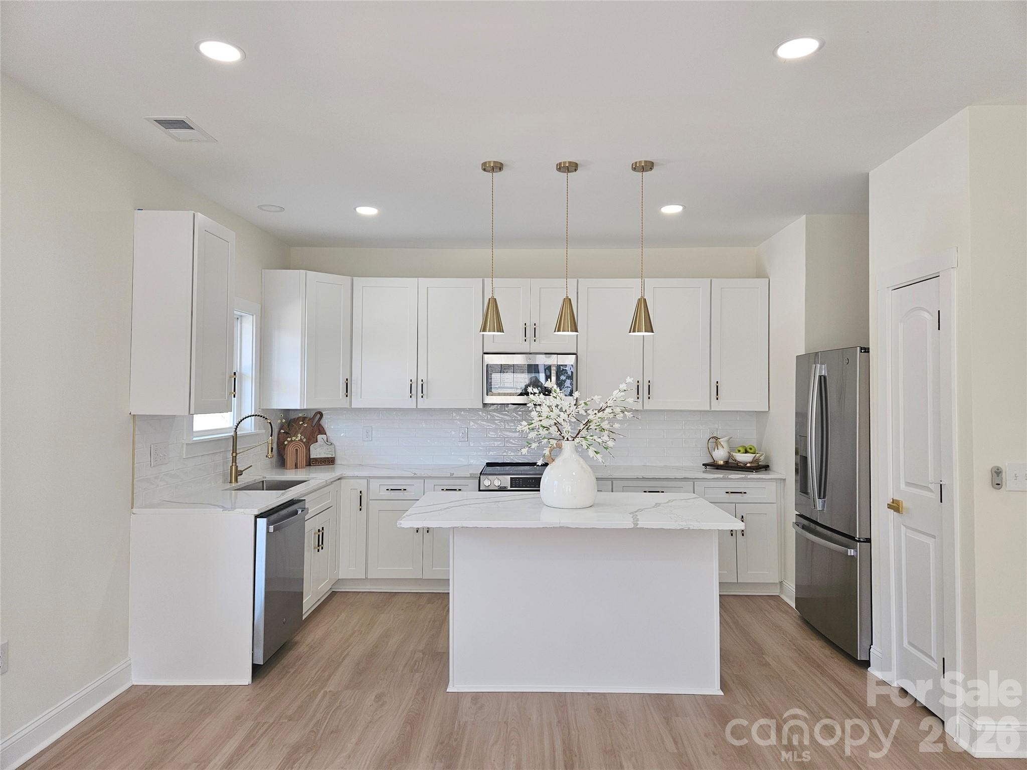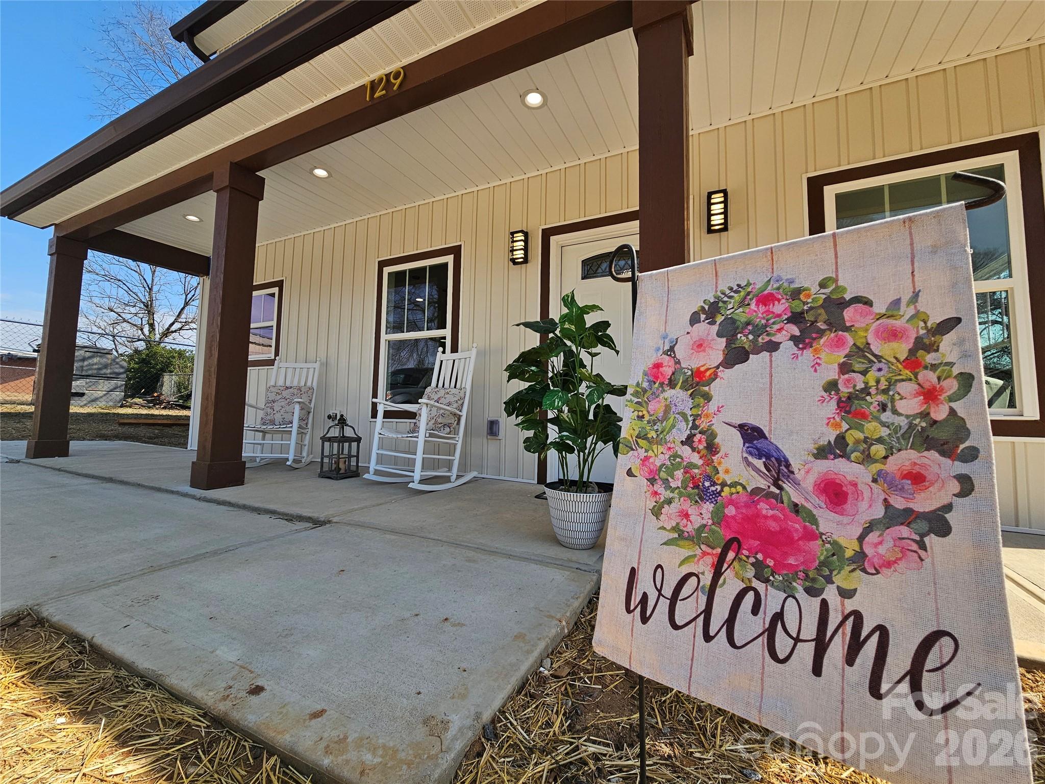 Brand new home offering nearly 1,500 sq. ft. with 3 bedrooms and 2.5 bathrooms. Inviting front porch perfect for rocking chairs, plus a private rear porch overlooking the backyard—ideal for spring family grilling! The open interior features 10’ ceilings and waterproof luxury vinyl plank flooring throughout, creating a spacious feel. Beautiful kitchen featuring quartz countertops, a center island, white tile backsplash, 42” cabinetry, modern pendant lighting, and stainless steel appliances—including refrigerator, stove, microwave, and dishwasher! Bathrooms include tile flooring, quartz countertops, and tiled showers, with a beautiful glass enclosure in the primary suite. The extended driveway fits up to 6 vehicles, plus additional rear-yard access for extra parking flexibility. A unique, move-in ready home your family will love.