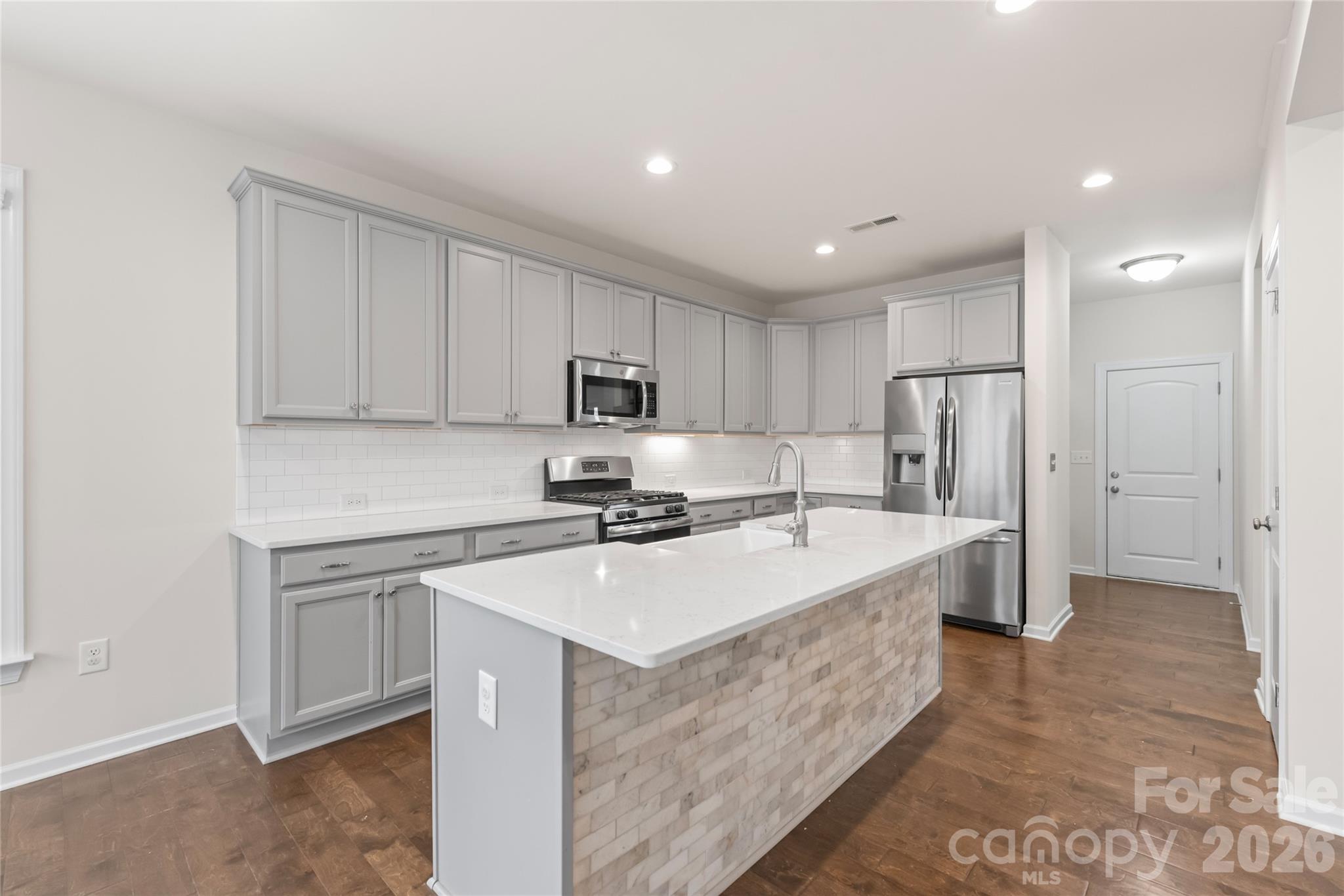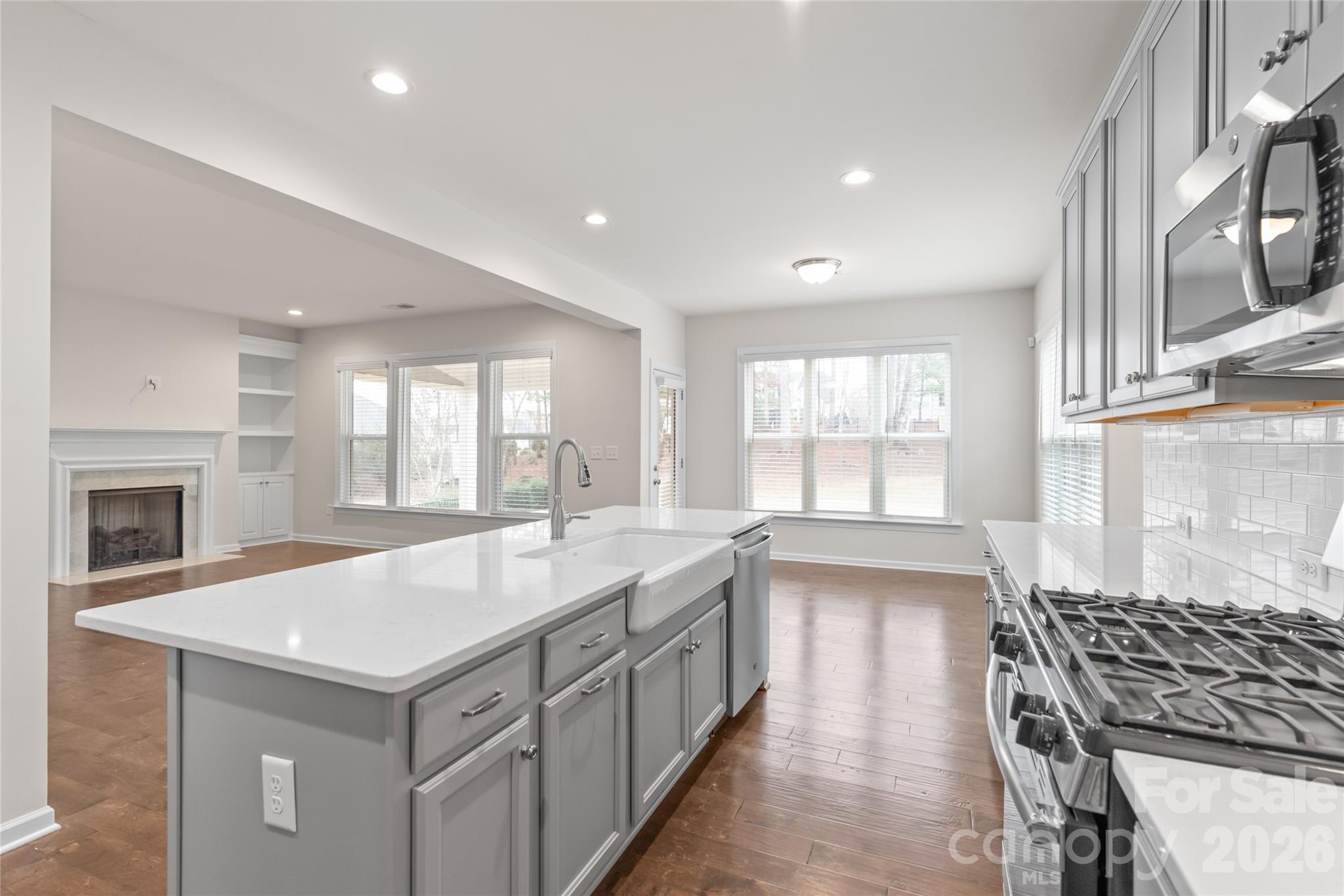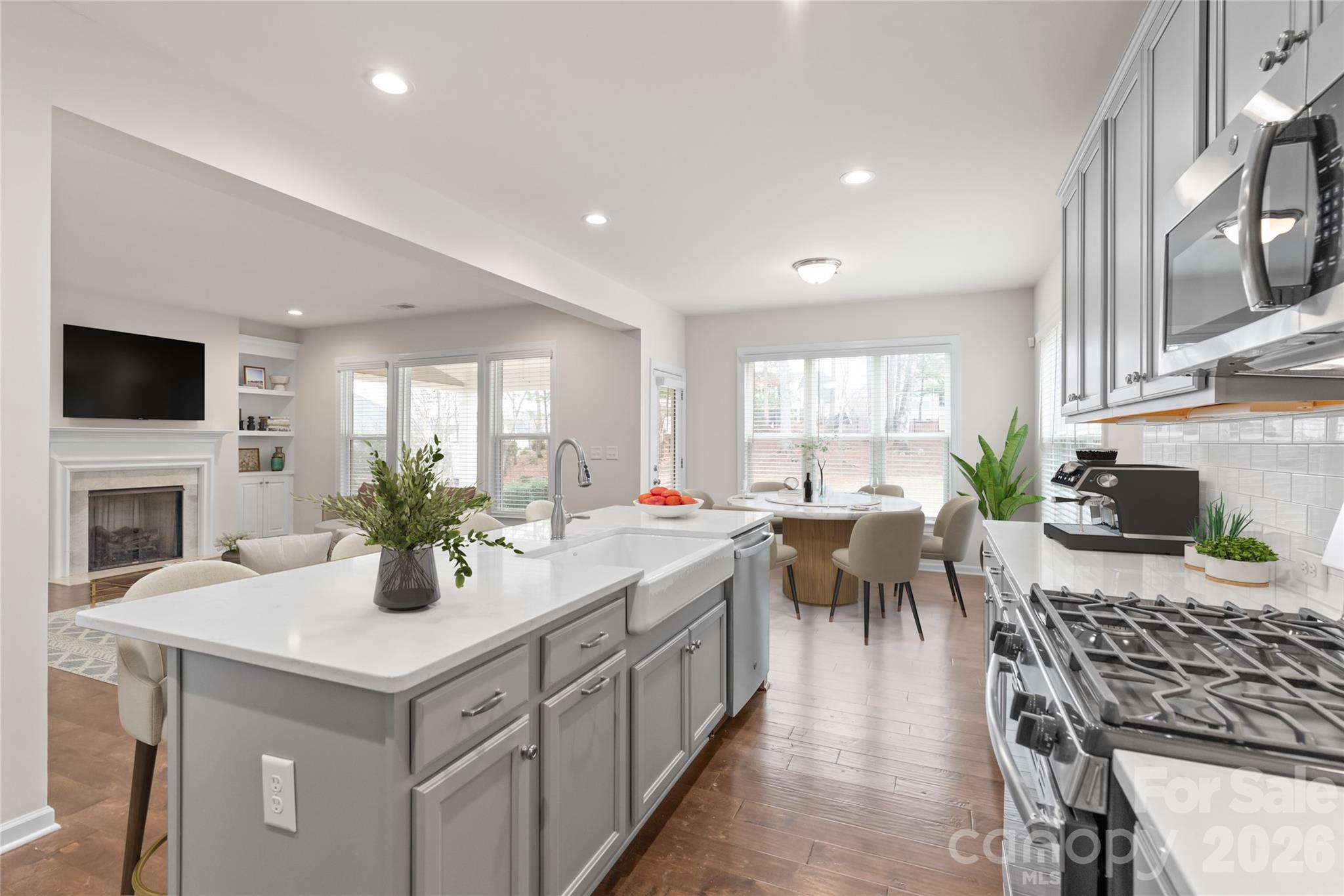 The kitchen is the heart of the home, complete with a large island, gas range, stainless appliances (refrigerator and washer/dryer included), pantry, and breakfast area overlooking the fenced backyard.