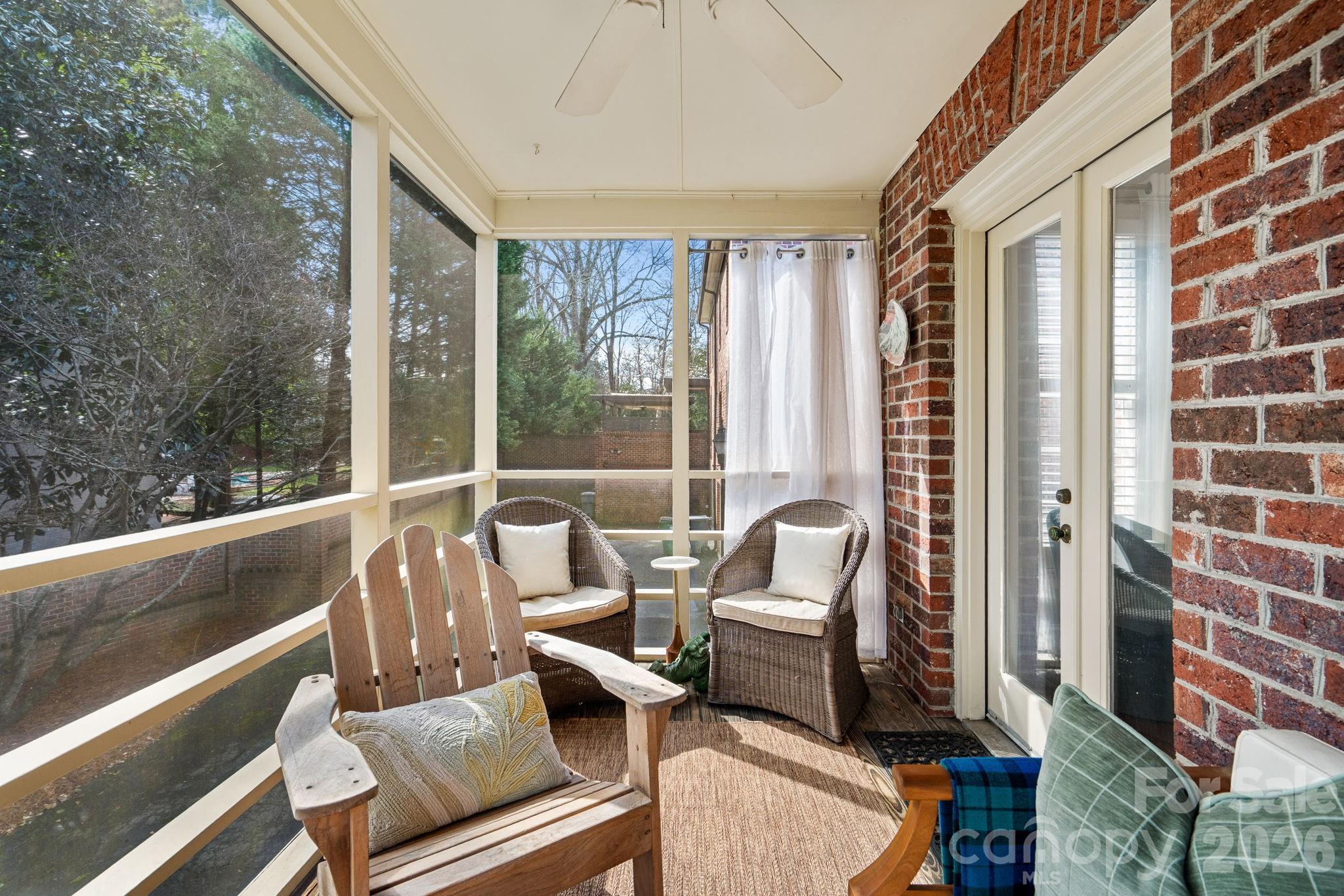Welcome home to this classic brick townhome! Oozing with charm, this home boasts high ceilings and incredible natural light on three sides thanks to being a desirable end unit. Its placement at the back of the community is a quiet haven backing up to trees and single family homes beyond. The screened porch off the family room feels like a private treehouse perch! The stairwell is dramatic with a soaring ceiling, and skylights flooding it with sunlight. Yet the home feels warm and inviting, and offers traditional molding details, and plenty of wall space for the art collector in you! The owner has lovingly updated throughout with Farrow and Ball paint colors, upgraded countertops, new lighting and plumbing fixtures, and new tile floors in the upstairs bathrooms. You will find plantation shutters, decorative brass vent covers, and updated door hardware. The hardwood floors are gleaming. Upstairs holds two bedrooms, including the primary, and each has a walk-in closet and ensuite bathroom. On the lower level you will find a third bedroom, currently used as an office. There is a third full bath located in the hallway connecting the garage with the living spaces. Upgrade notes; Porch roof replaced 2019. Most updates completed in 2021 such as paint, tile, countertops, new kitchen sink, plumbing fixtures, carpet replacement, lighting, floor refinishing, new skylights, and epoxy floor in garage. .