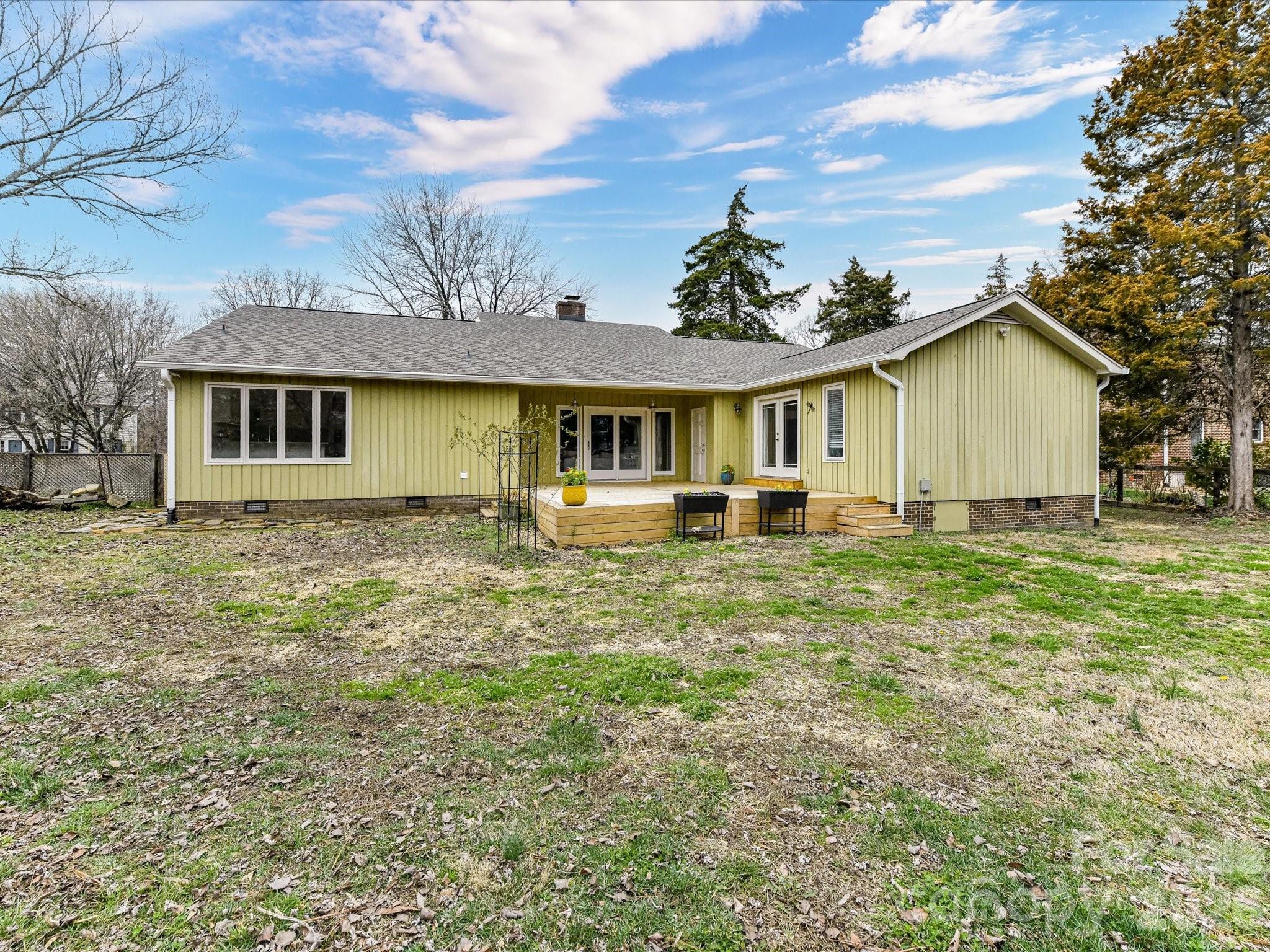 Welcome to this stunning mid-century modern ranch in Autumnwood. Filled with natural light, this home showcases timeless design—vaulted ceilings, floor-to-ceiling windows, rich hardwood floors, and a striking brick wood-burning fireplace that anchors the open living space. The bright, updated kitchen features wood-look tile flooring, granite countertops, white cabinetry, newer stainless steel appliances, and large windows overlooking the peaceful backyard. A convenient laundry room just off the kitchen (washer and dryer included) adds everyday ease. The spacious primary suite offers direct access to the new deck, a custom walk-in closet, and a beautifully renovated ensuite with tile flooring, an updated vanity, and a frameless glass shower. A secondary bedroom includes a walk-in closet with custom built-ins, while the third bedroom is generously sized with abundant natural light and its own walk-in closet—perfect as a bedroom or home office. The hall bath features tile and ample storage. Enjoy morning coffee or evening dining on the deck overlooking the fully fenced backyard, and savor fresh fruit from your own front-yard trees. Major updates include a new roof (2025) and HVAC (2023). Ideally located near the greenway, Lynx, shopping, dining, and with easy access to I-85 and Uptown, this home perfectly blends classic mid-century charm with modern updates and everyday convenience.