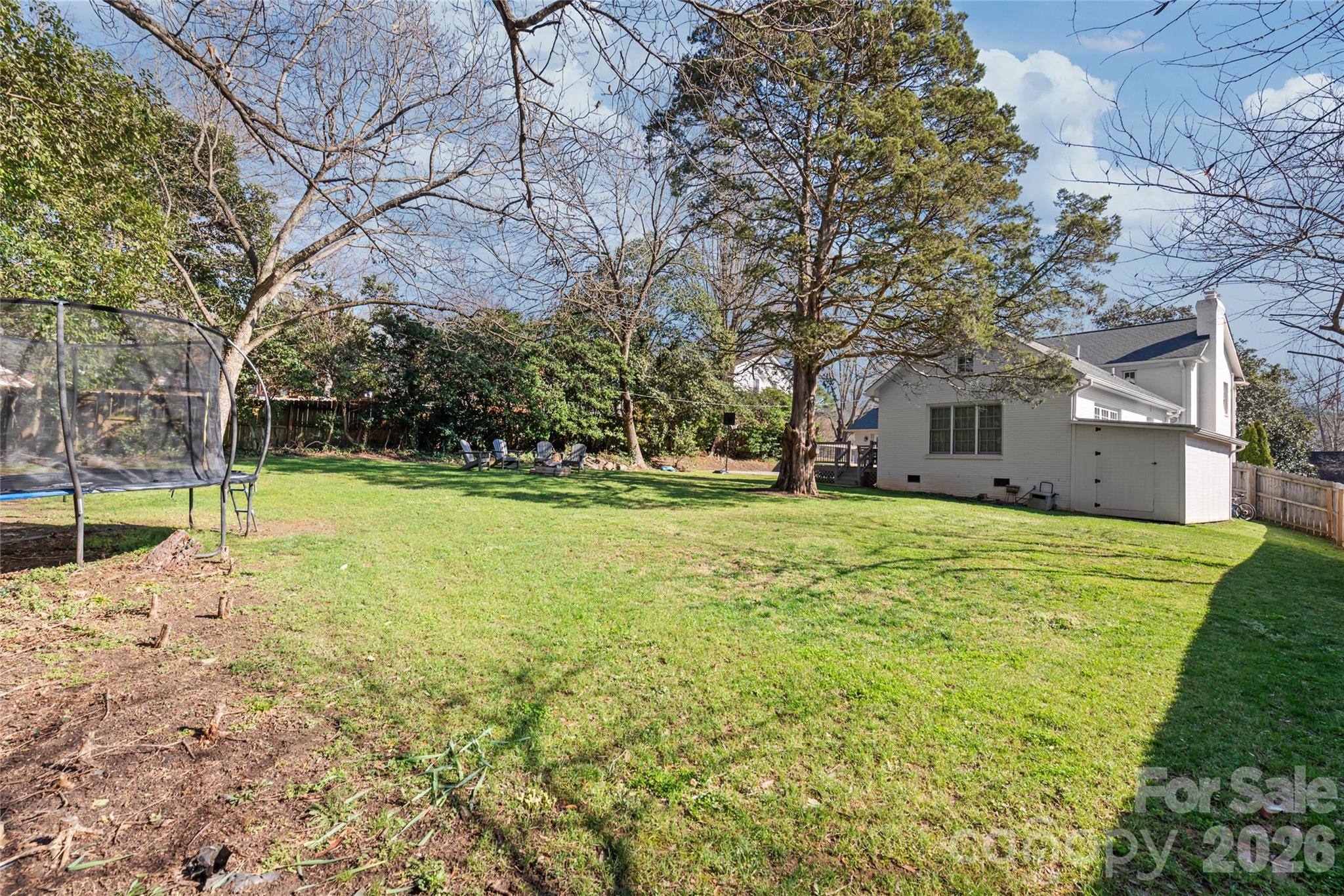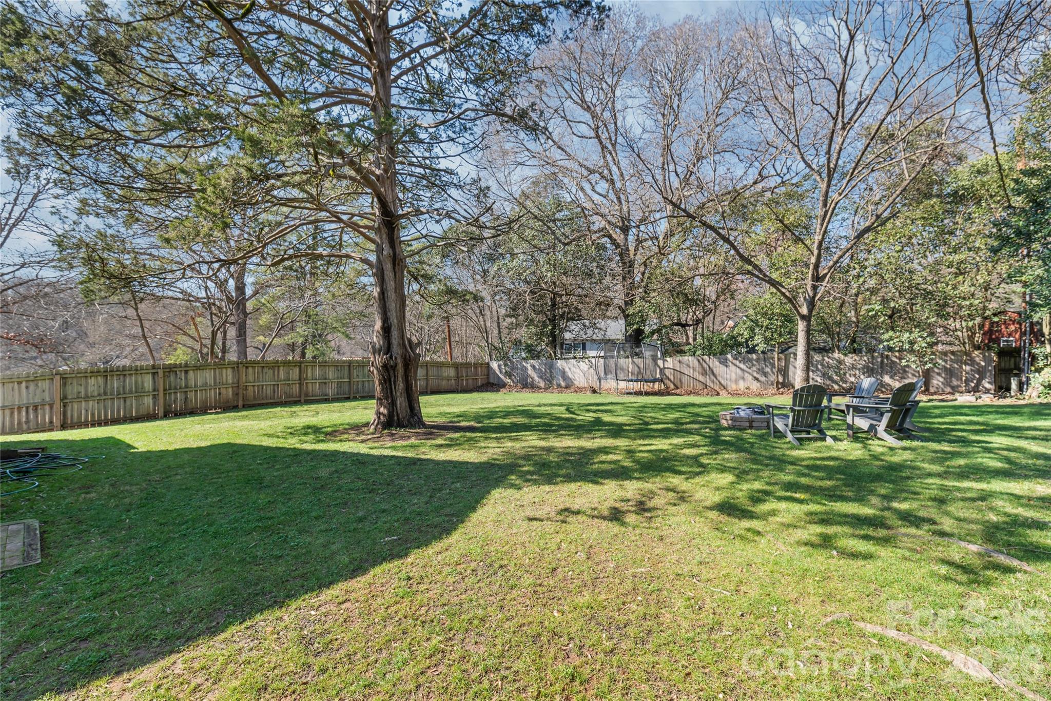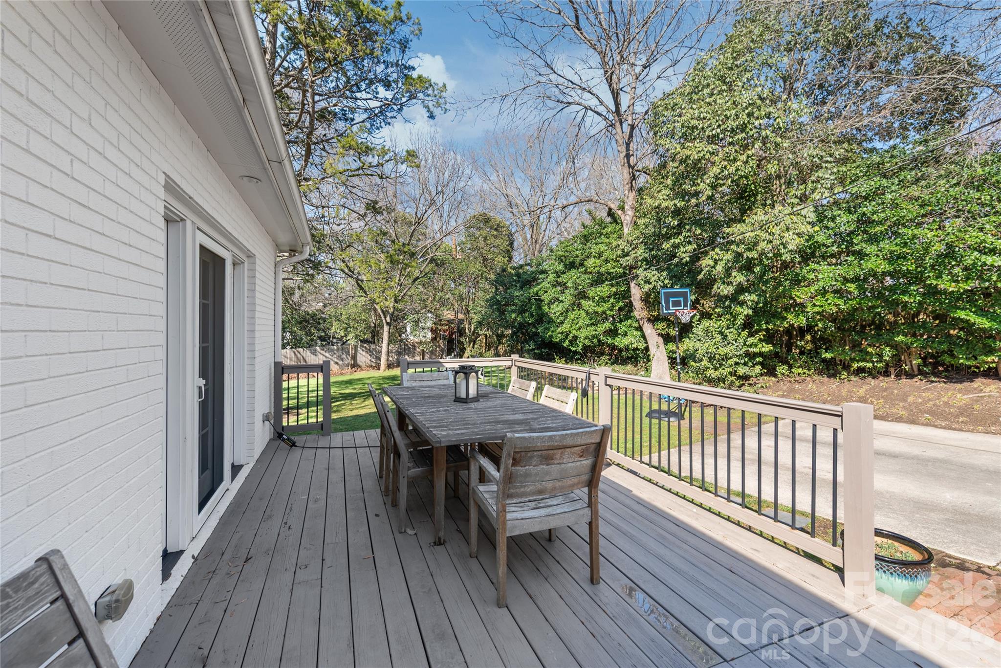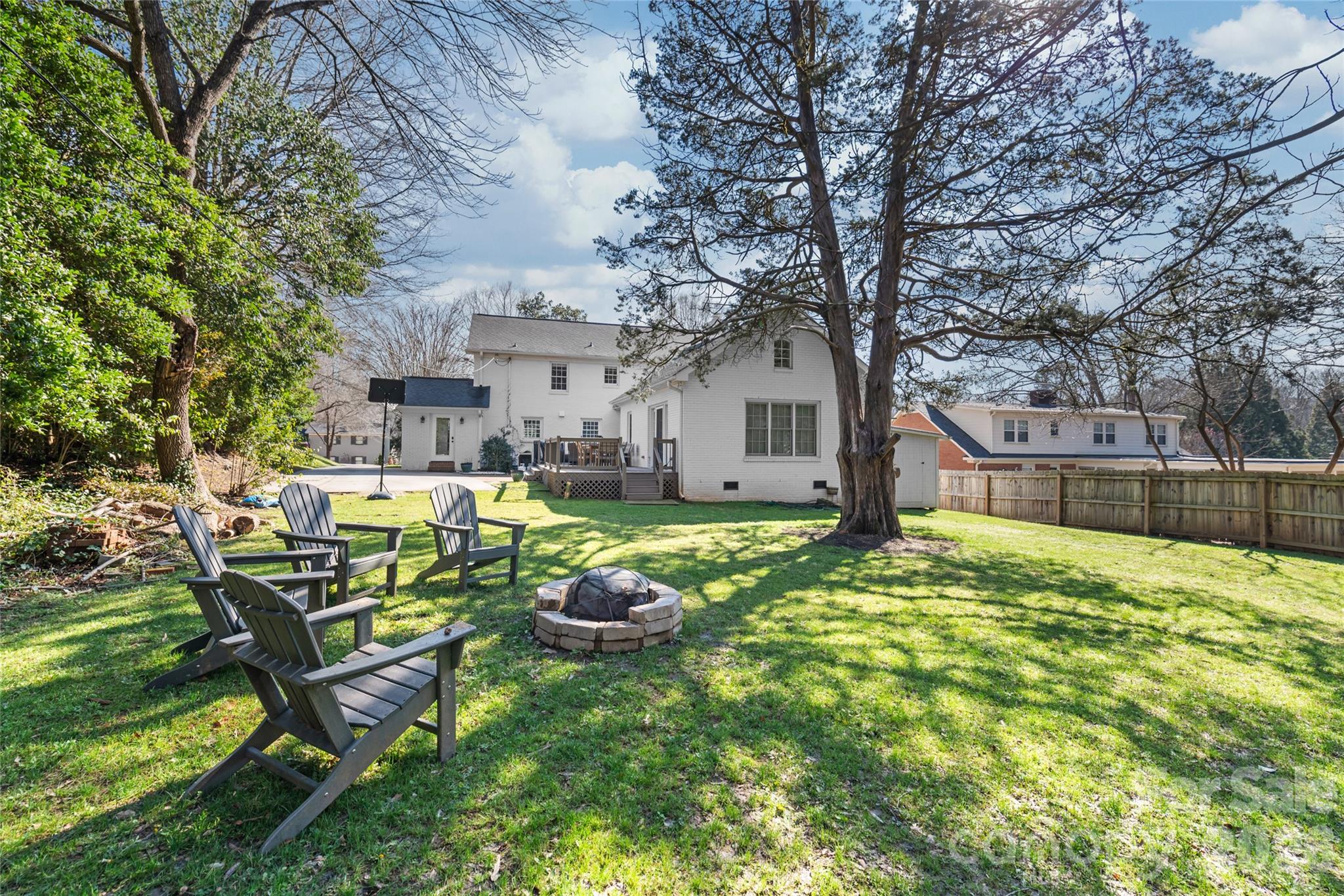 Deck overlooks a flat shaded back yard just waiting for smores night around the firepit.