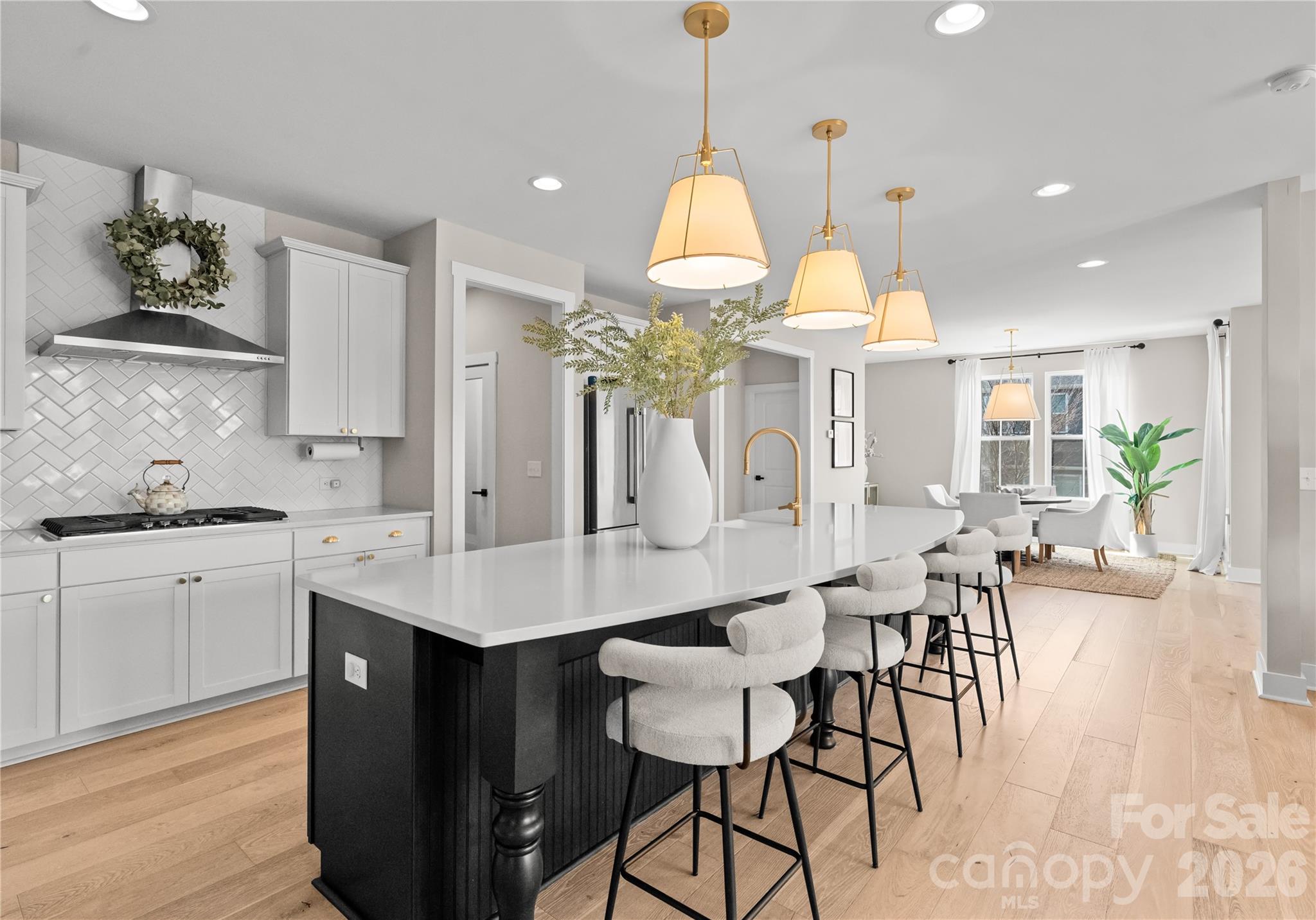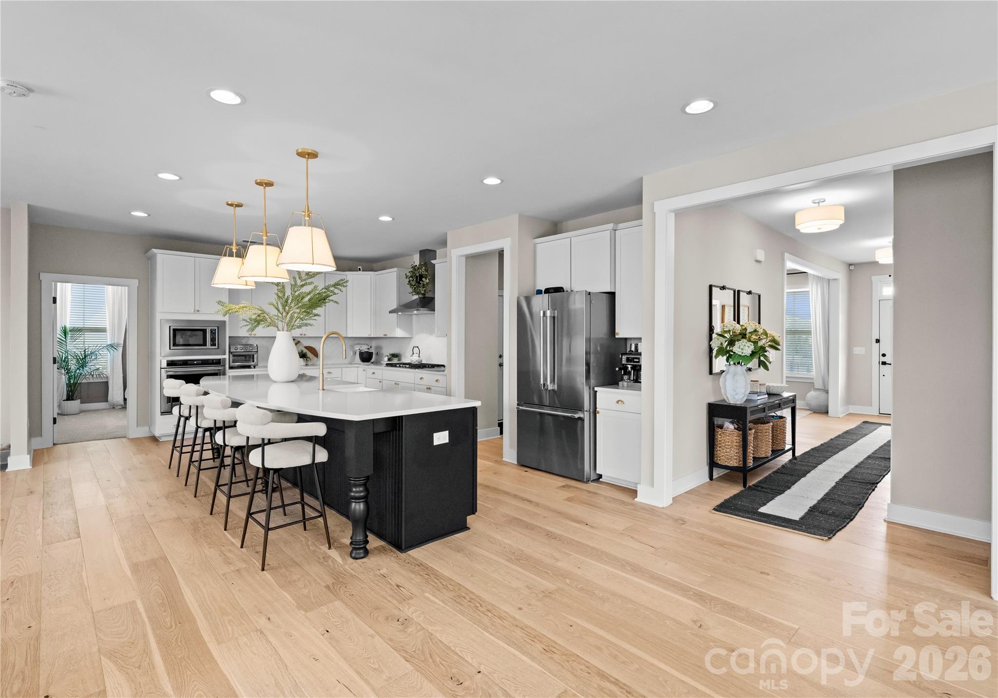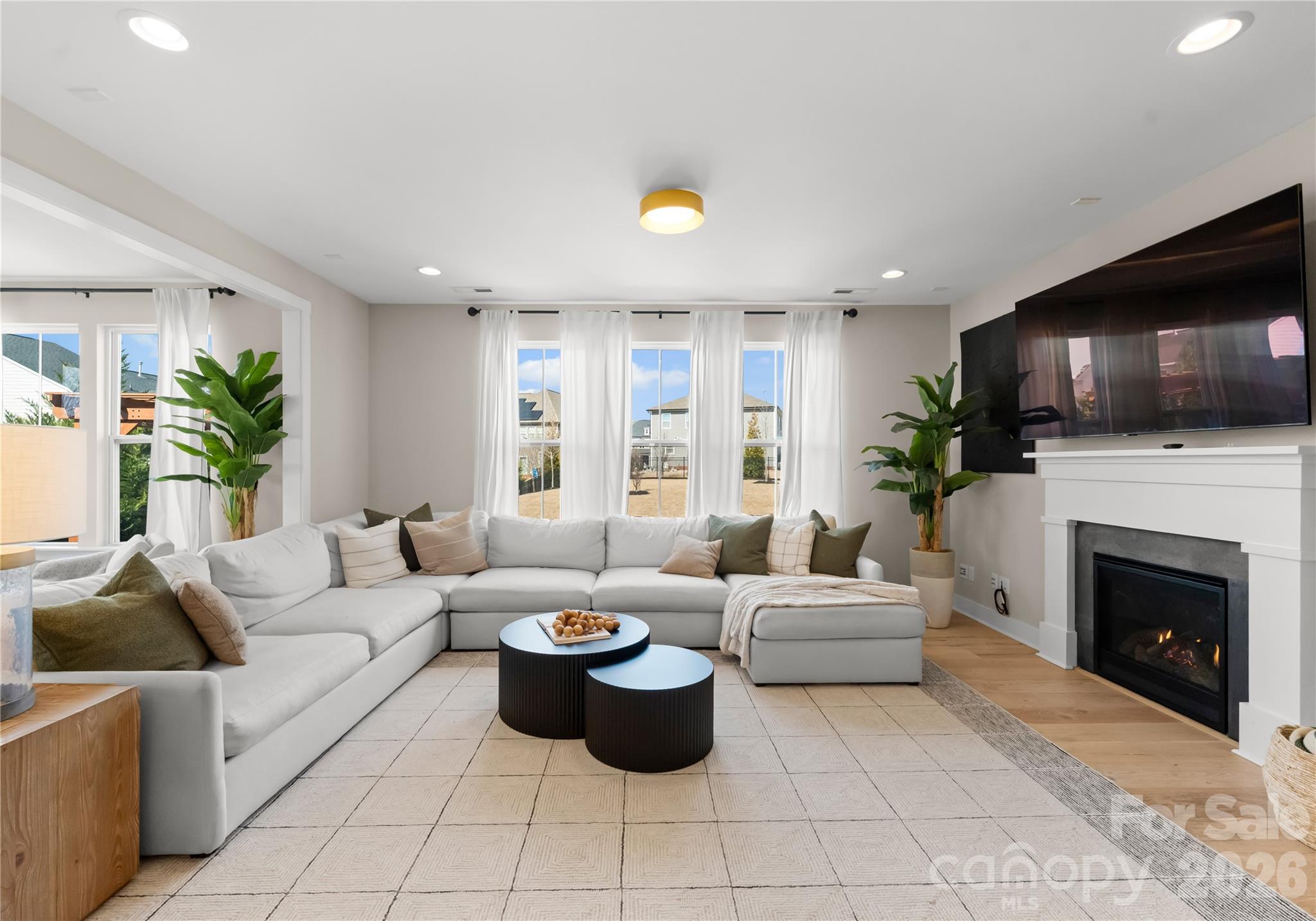 At the heart of the home, the chef’s kitchen is designed for both entertaining and everyday living. Featuring an oversized island, generous cabinetry, and seamless flow into the open living area, this space naturally brings people together. The living room is anchored by a fireplace and surrounded by windows that fill the home with beautiful natural light.