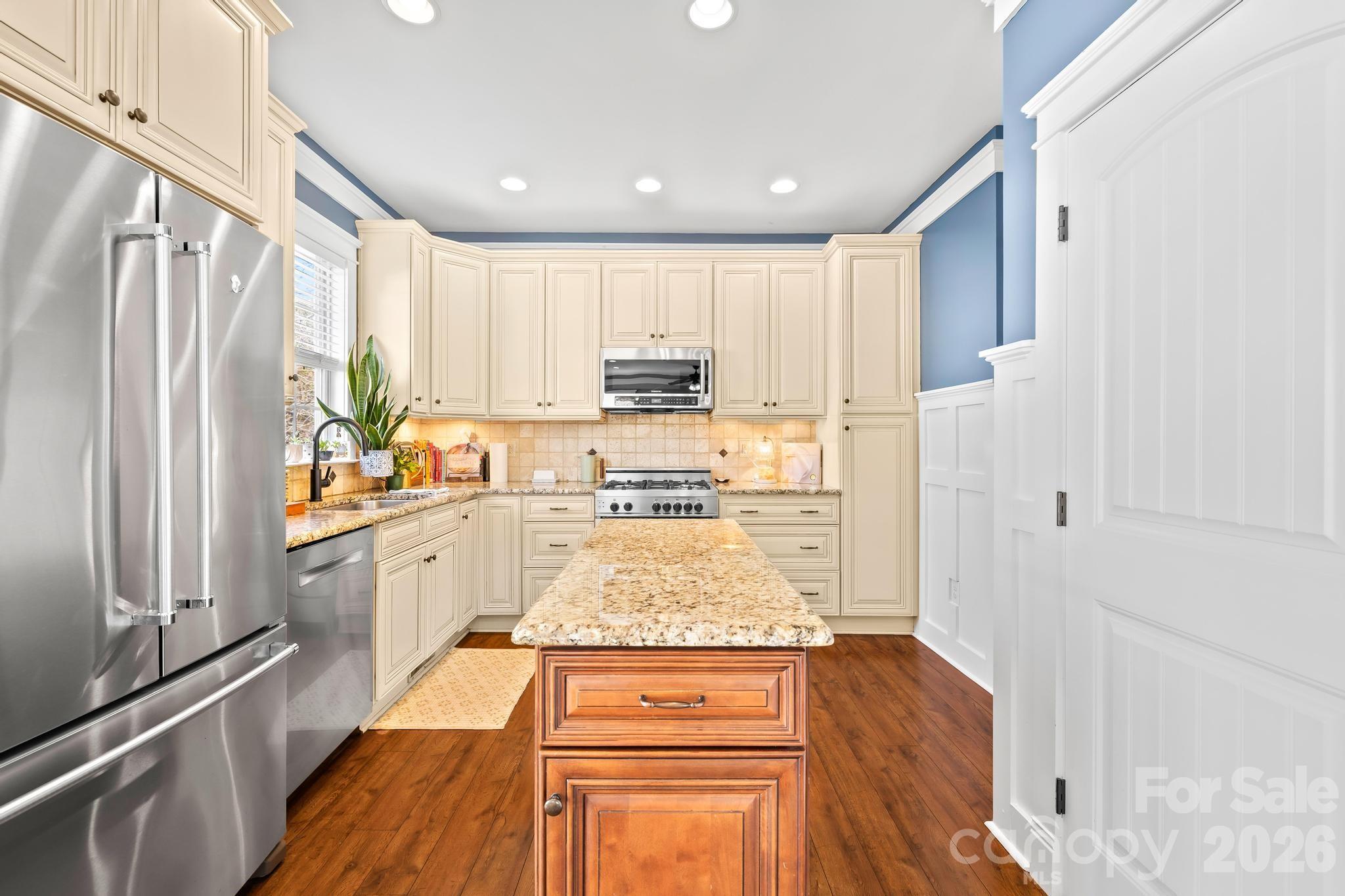 The upgraded kitchen features extensive molding and wainscoting, granite countertops, a Bertazzoni gas range, 42” custom cream rubbed cabinets with soft-close drawers, and a sunny breakfast area that flows seamlessly into the spacious family room with a cozy gas fireplace.