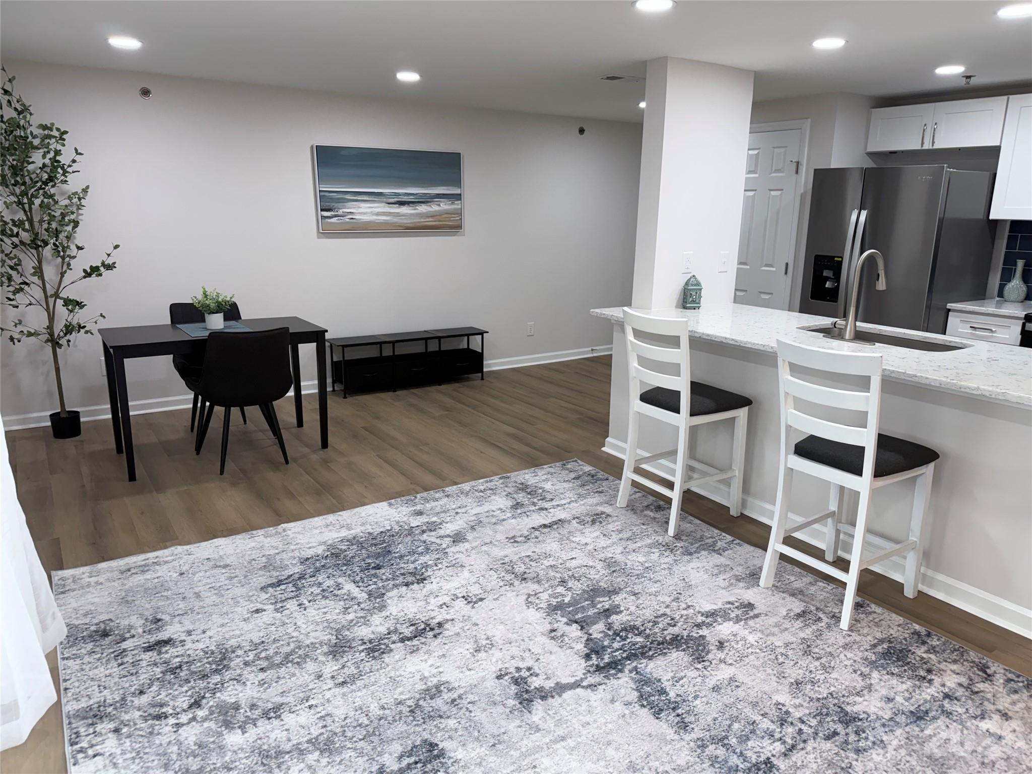 High-end finishes and refined luxury with no expense spared! This roomy all-new three-bedroom condo, which has been fully renovated, exhibits sophisticated design and upscale finishes. Offering a turnkey opportunity for its next owner, with fresh paint, luxury vinyl flooring and updated lighting throughout giving it a fresh modern appeal. The open, airy floor plan is perfect for entertaining and offers a seamless flow between the living, dining, and kitchen areas. The kitchen includes stunning quartz countertops, new white shaker soft close cabinets, subway tile backsplash, and brand-new stainless steel Whirlpool appliances. Two large sliding glass doors leading to a balcony bring in tons of natural light. Additional enhancements to note include all new windows, window blinds, HVAC system replaced in 2026, and new stackable washer and dryer included. The two full bathrooms have been remodeled with new shower tiles, bathtub, mirrors and vanities. Premium location, located in the University area, convenient to UNCC, Concord Mills, IKEA Boulevard, many shopping and dining options, and offers easy access to highways, public transit and the Blue Line.