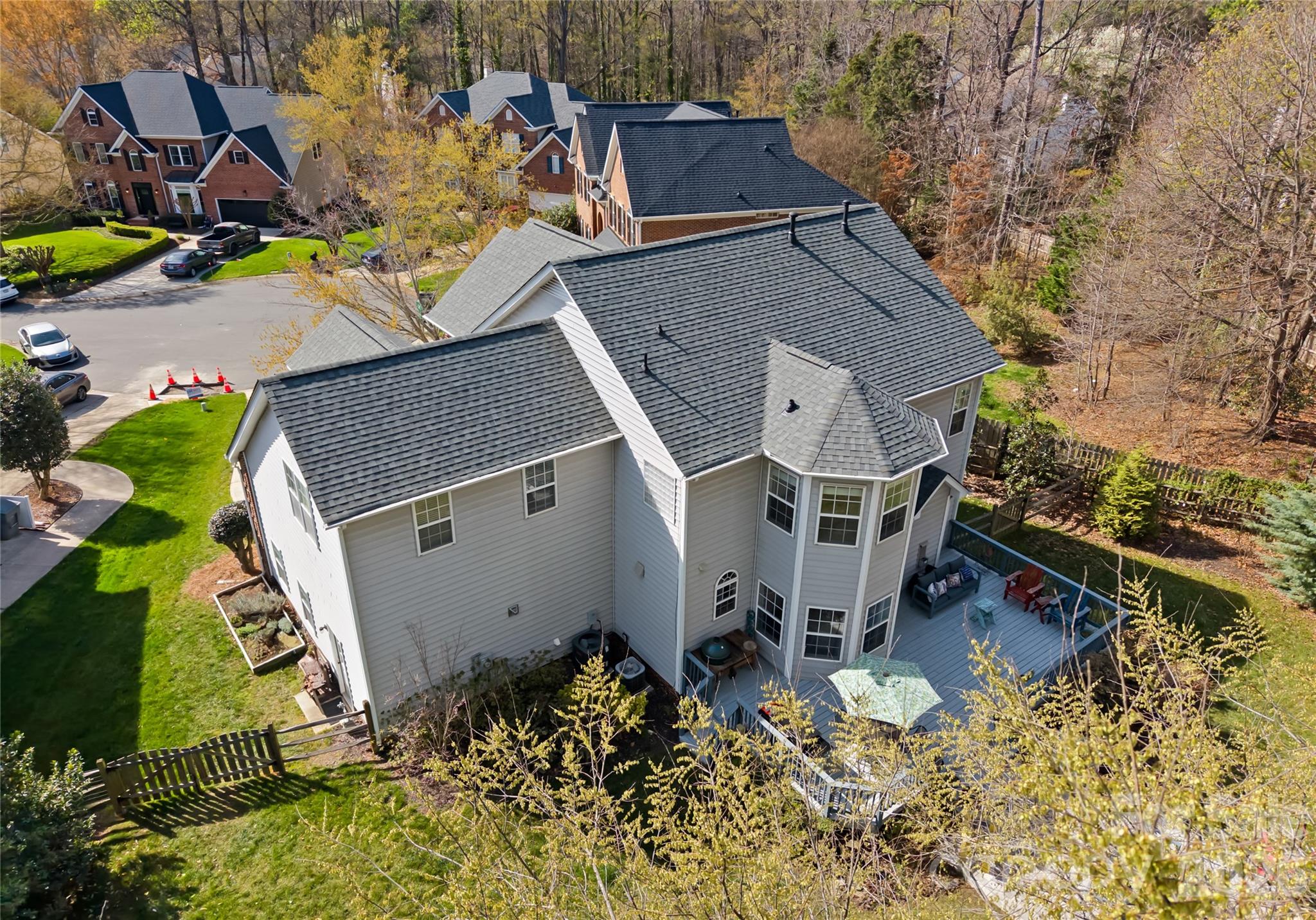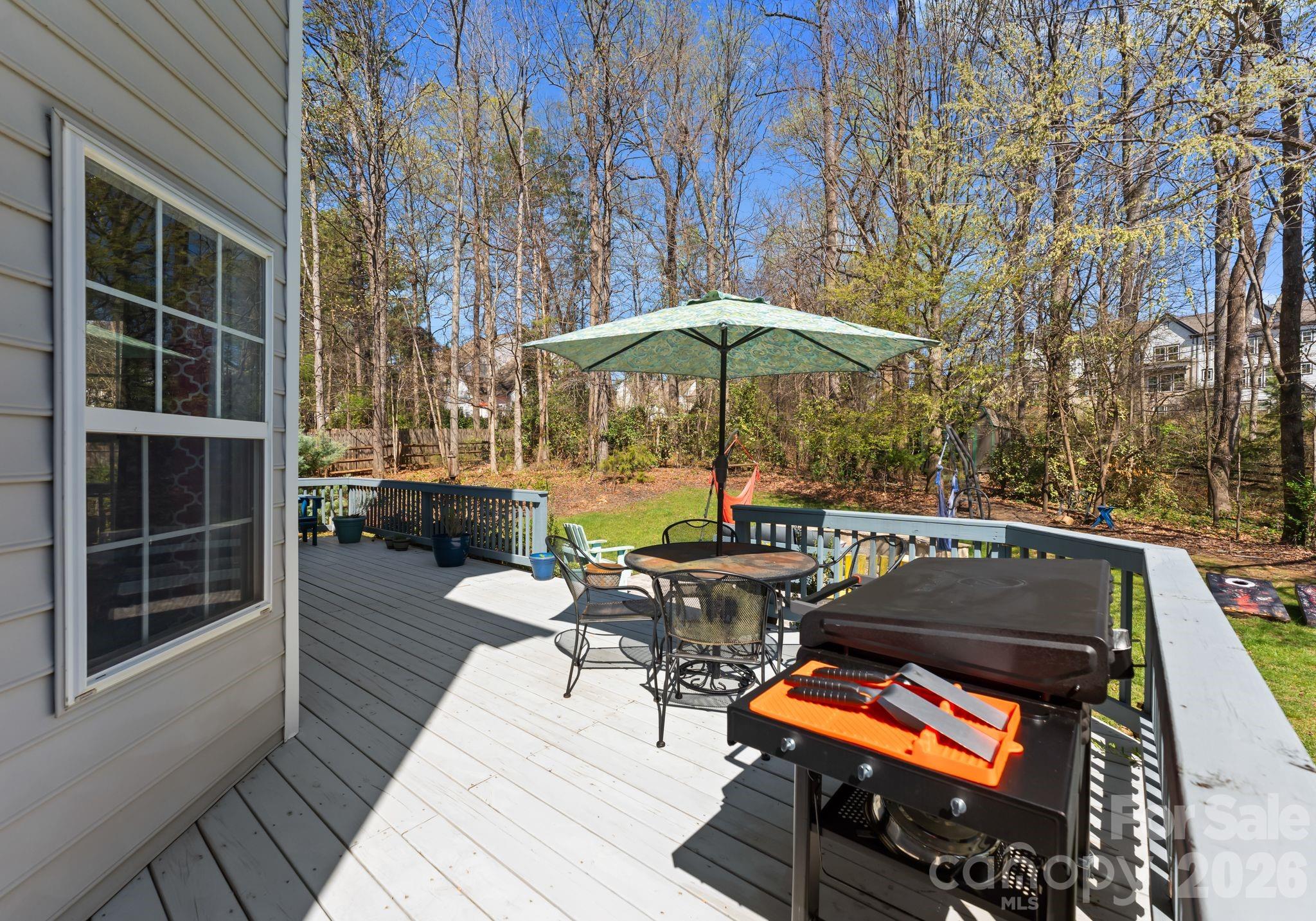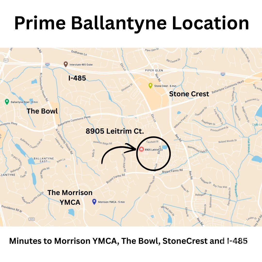 Immaculate cul-de-sac home on one of the largest and most private lots in the neighborhood. Nestled on a beautifully wooded 0.55-acre homesite, this meticulously maintained 4-bedroom residence offers over 2,800 square feet of light-filled living space, combining comfort, timeless updates, and exceptional privacy. From the moment you enter, you will notice the pride of ownership throughout. Warm hardwood floors, elegant details, and abundant natural light create a welcoming atmosphere perfect for both everyday living and entertaining. The spacious kitchen features white cabinetry, granite countertops, stainless steel appliances, ceramic tile backsplash, and a large center island, all opening to a bright breakfast area set within a stunning two-story turret style bay window, surrounded by windows overlooking the peaceful backyard. This inviting space flows seamlessly into the family room with fireplace, creating the perfect setting for gatherings and relaxed evenings at home. Upstairs, the primary suite offers a true retreat, complete with a generous bedroom and a sun-filled sitting area surrounded by windows, ideal for a reading nook, home office, or quiet lounge. Plantation shutters and ceiling fans throughout the home add comfort and timeless style. Step outside to enjoy the large back deck with gas hookup for grilling, perfect for entertaining or relaxing while overlooking the private wooded backyard. The backyard also includes a permitted storage shed offering additional space for tools, equipment, or hobbies. Brand new roof installed 2/2026. Ideally located in Ballantyne, this home offers exceptional convenience and lifestyle amenities. Enjoy walking distance to the Morrison Family YMCA and just minutes from The Bowl at Ballantyne, Stonecrest shopping and dining, and quick access to I-485 for easy commuting throughout Charlotte. With its meticulous upkeep, spacious layout, and rare oversized lot, this home offers a unique opportunity to enjoy privacy and comfort in a highly desirable Charlotte location. Homes offering this level of care and one of the largest lots in the neighborhood rarely become available.