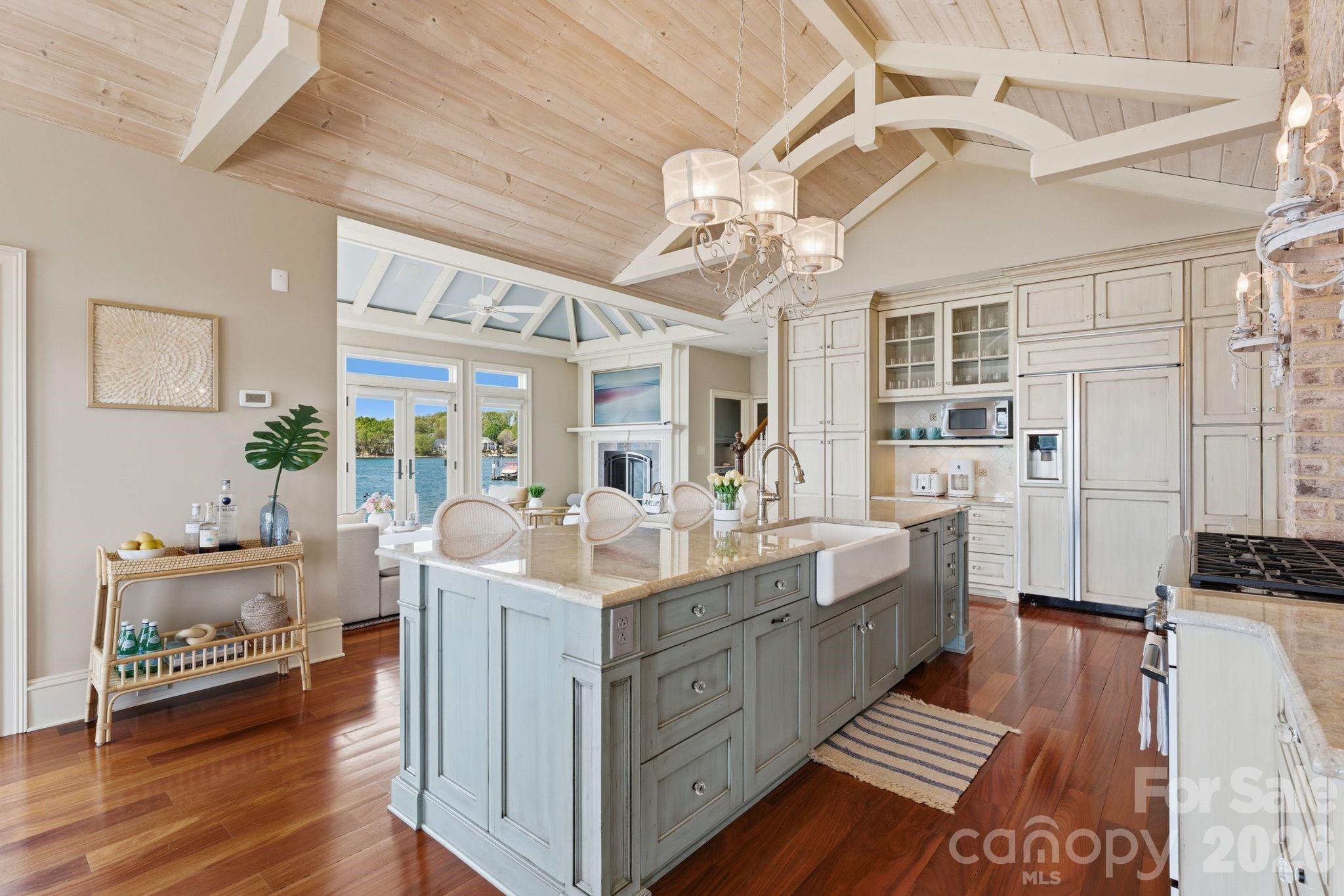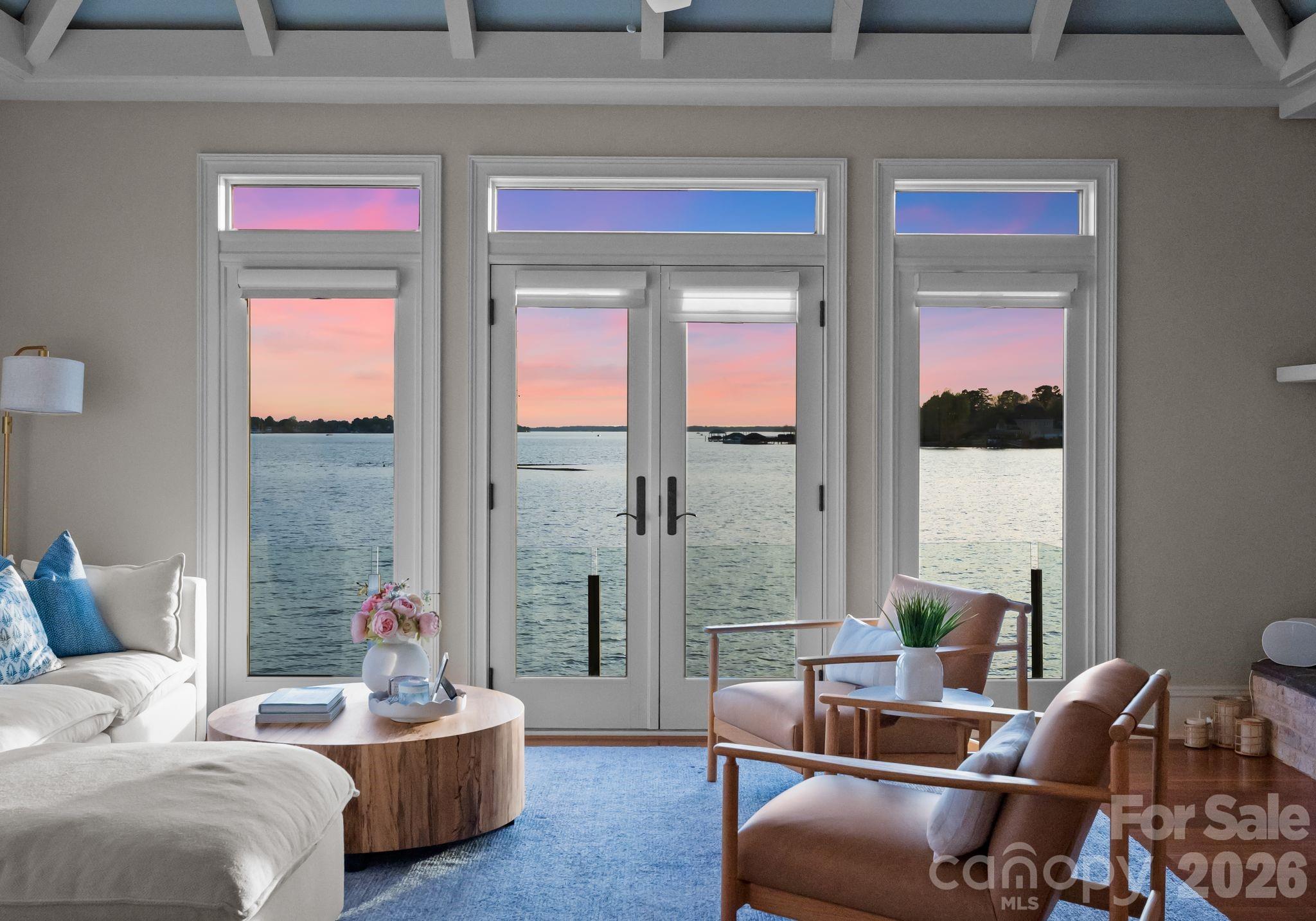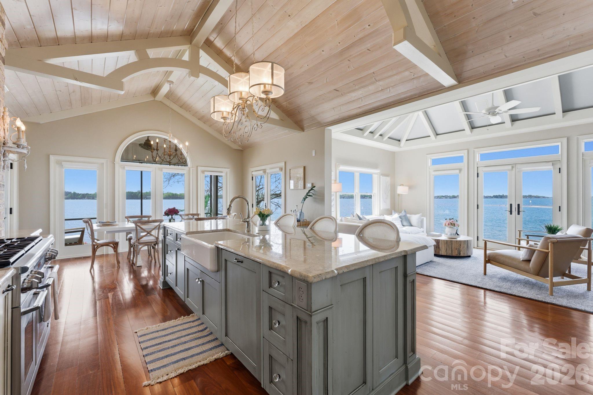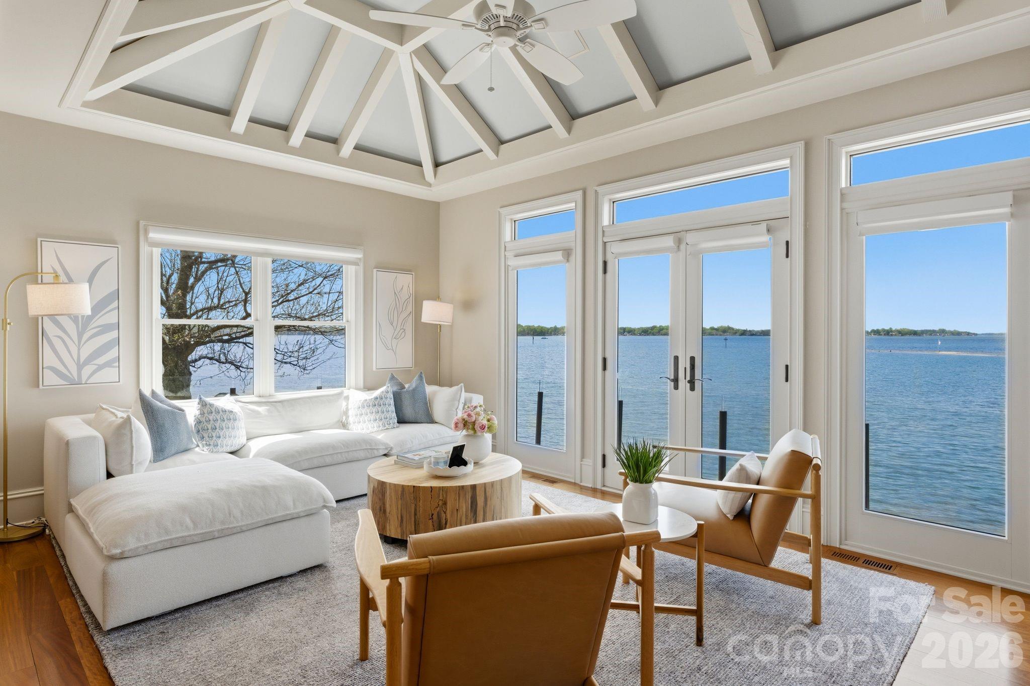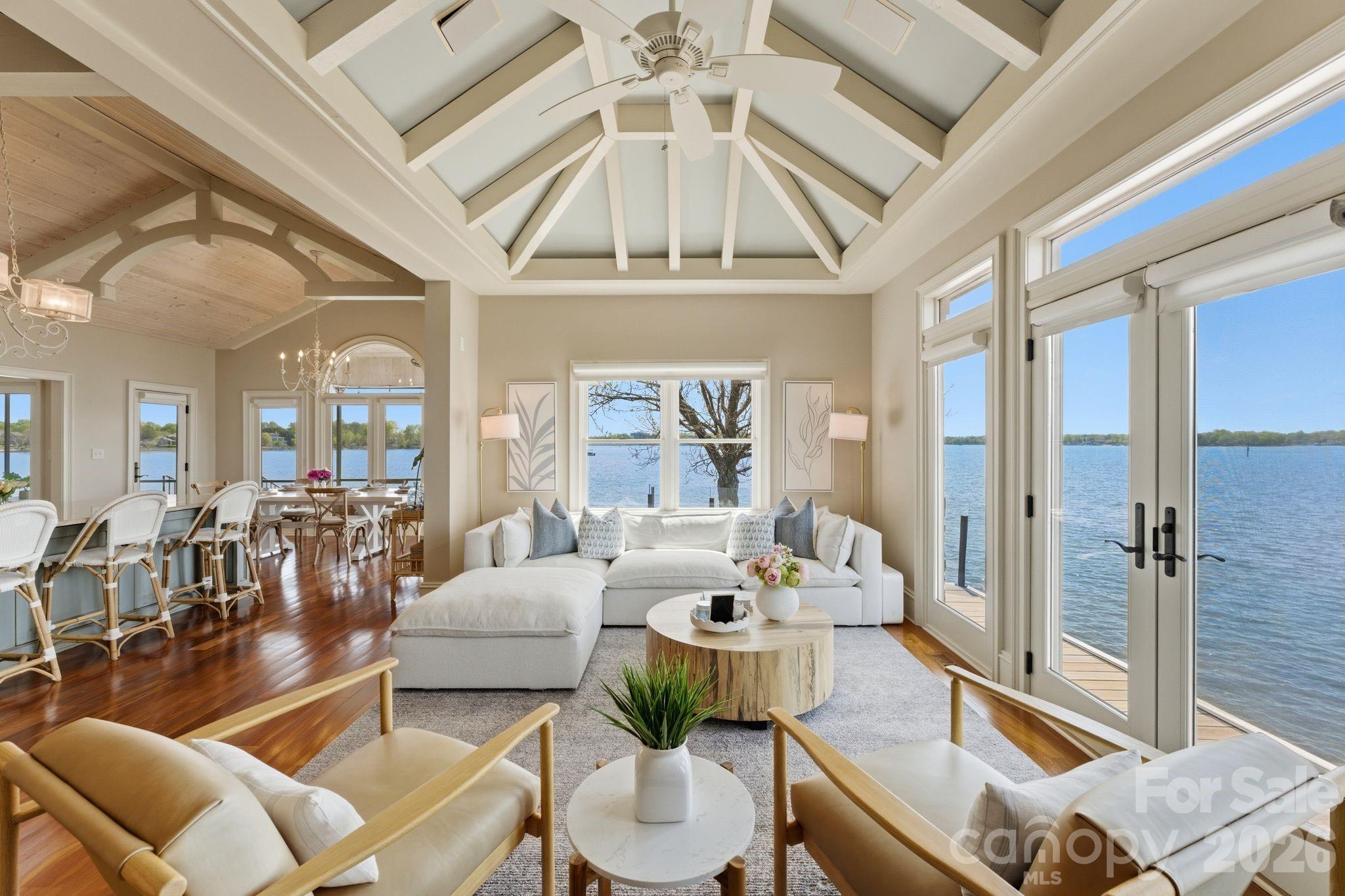 This property could be a set in a Nicholas Sparks or Nancy Meyers rom-com. The most charming stone clad home nestled on 720 feet of waterfront on the desirable Langtree peninsula. Minutes to all the shopping and dining at Birkdale Village. Renovated to the studs in 2015, the interior is as special as the exterior. Every room is full of light and astonishing water views. Vaulted tongue & groove ceilings with custom beams, island seating, marble counters. Spacious screened porch & deck. Dock w/ composite decking can accommodate 4 boats. HOA amenities offer pool, tennis/pickleball courts, boat ramp & storage. Present owners added HVAC to the garage and created a bunkroom. Nothing required to use as a garage again--this space is not included in the heated living area listed. This property is one of the most unique and charming properties on Lake Norman. Some furniture may be available for purchase.