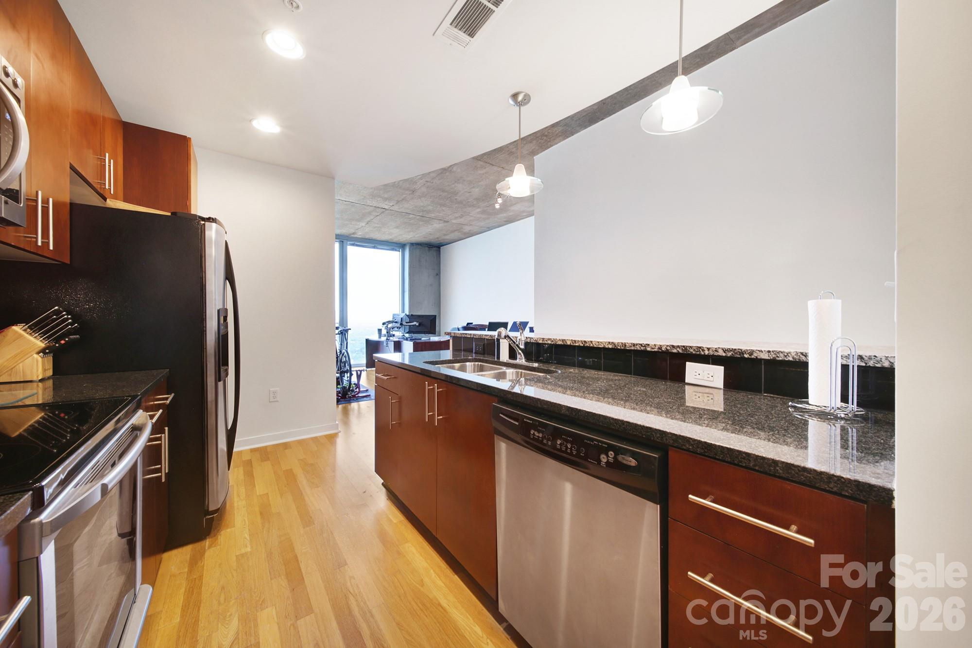 RARE AND SOUGHT AFTER RENTAL CERTIFICATE FOR INVESTORS IS AVAILABLE FOR THIS UNIT. Or make this your home. Ready for high-rise condo living in the heart of Uptown Charlotte?! This 1BD/1BA on 31st floor has spectacular, unobstructed views! It features hardwoods throughout kitchen, living room & hallway, and granite, tile back-splash and Stainless Steel appliances in kitchen. Spacious bedroom with huge window view, and granite w/tile shower in bath. The patio faces the sunset/mountain view for miles. One reserved parking space in garage. Fabulous outdoor entertaining space includes a huge pool, gorgeous fireplace with built-in TV, courtyard & gas grill. Other amenities include 24-hr concierge, Amazon Package Hub, state-of-the-art fitness center and yoga room, theater room, Sky Club w/bar, billiards, pool table. Walk to local restaurants, theater, galleries, retail, sporting events, & nightlife! Unit freshly painted on 3/15/2026! NOTE ON SQUARE FOOTAGE: Unit has been professionally measured (737 SF). Other 1B/1B units may be using builder SF (791) which measures from exterior walls, not interior walls, so you'll note the delta. Water, Sewer, trash and google fiber included in the HOA. All appliances included make this an easy choice.
