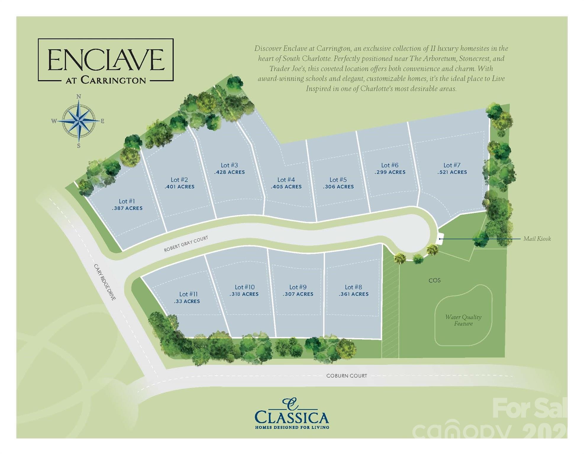 Discover South Charlotte's newest luxury community - Enclave at Carrington! Enclave at Carrington is an exclusive community featuring 11 premium homesites in one of South Charlotte’s most desirable locations. Enclave at Carrington blends serenity and convenience, offering a rare opportunity to build your dream home in a quiet, private setting while staying close to everything you love about South Charlotte - world-class shopping, fine dining, miles of greenway trails, and beautiful parks. Minutes from Stonecrest, Ballantyne, SouthPark, Arboretum, Waverly, and Rea Farms!