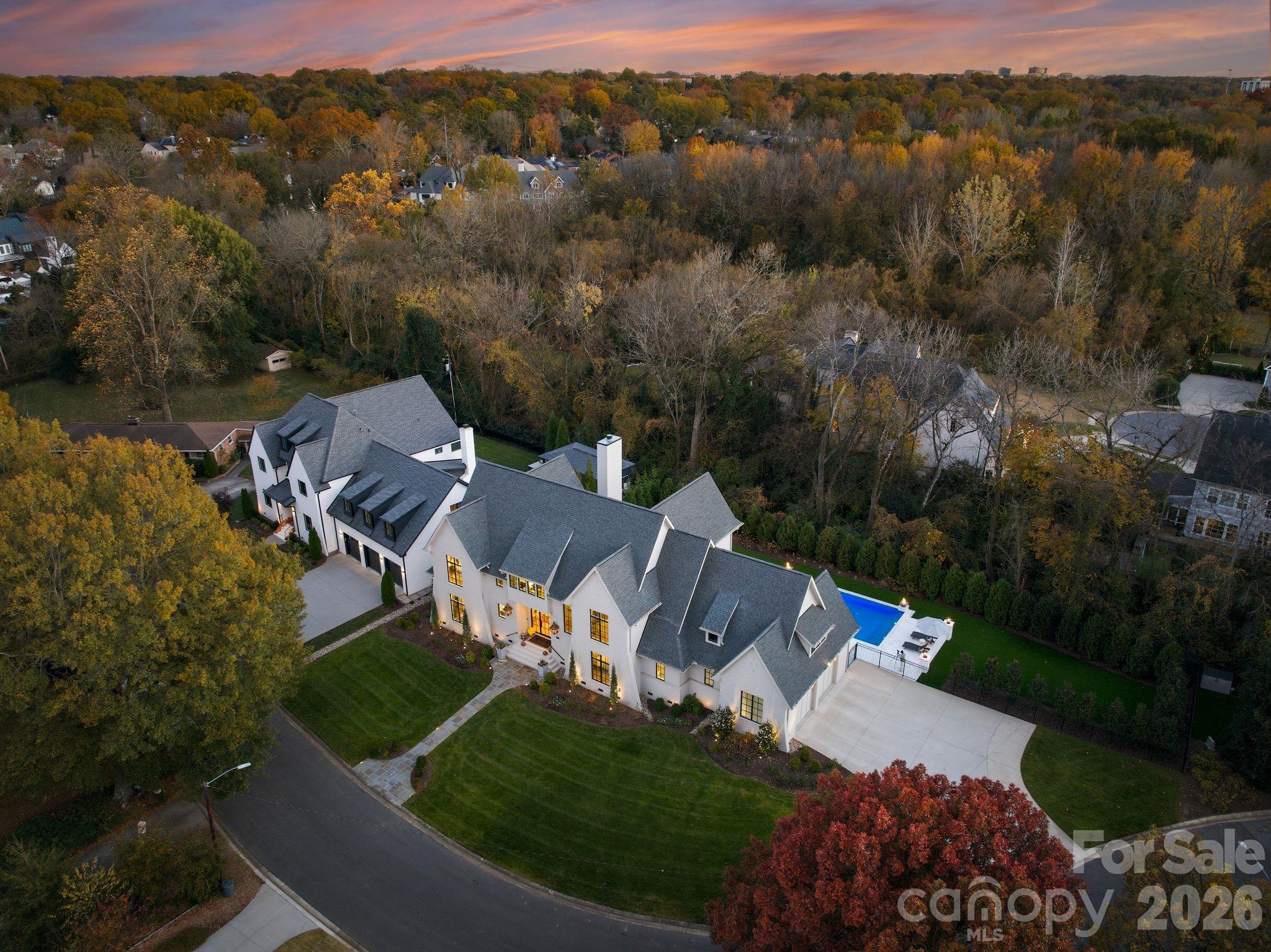 Welcome to an extraordinary modern estate, completed in 2023, in the heart of Myers Park, where refined architecture and modern elegance converge. A grand, light-filled interior unfolds through an expansive open floor plan, anchored by a main-level primary suite and private guest retreat, each designed with a sense of quiet luxury. The primary sanctuary is complemented by a spa-caliber bath, featuring a sculptural soaking tub, marble walk-in shower, dual vanities, and an impeccably designed bespoke dressing room. The culinary space is both striking and functional, centered around a statement white oak island with luminous quartz surfaces and appointed with a suite of professional-grade appliances by Thermador, Wolf, and Sub-Zero. White oak floors extend throughout, while soaring vaulted and coffered ceilings, tailored millwork, and curated designer lighting create a layered and sophisticated aesthetic. Walls of glass invite abundant natural light, enhancing the home’s seamless flow and sense of scale. Upstairs, four beautifully appointed bedrooms are complemented by a private study, media lounge, and a flexible fitness or wellness space. Designed for elevated living and effortless entertaining, the covered outdoor terrace features a built in grill, beverage refrigerator, ice maker, fireplace, and integrated heating for year-round enjoyment. The grounds have been transformed with animal friendly turf, a 90-foot in-ground heated saltwater, Pebble Tec, Infinity edge swimming pool, surrounded by sandblasted textured marble and exquisite fire bowls adding a touch of elegance. Home equipped with a WHOLE HOUSE GENERATOR and fully integrated with a Control4 smart home system, offering a seamless and intuitive living experience. Welcome Home! Please see attached features for complete list of extraordinary details!