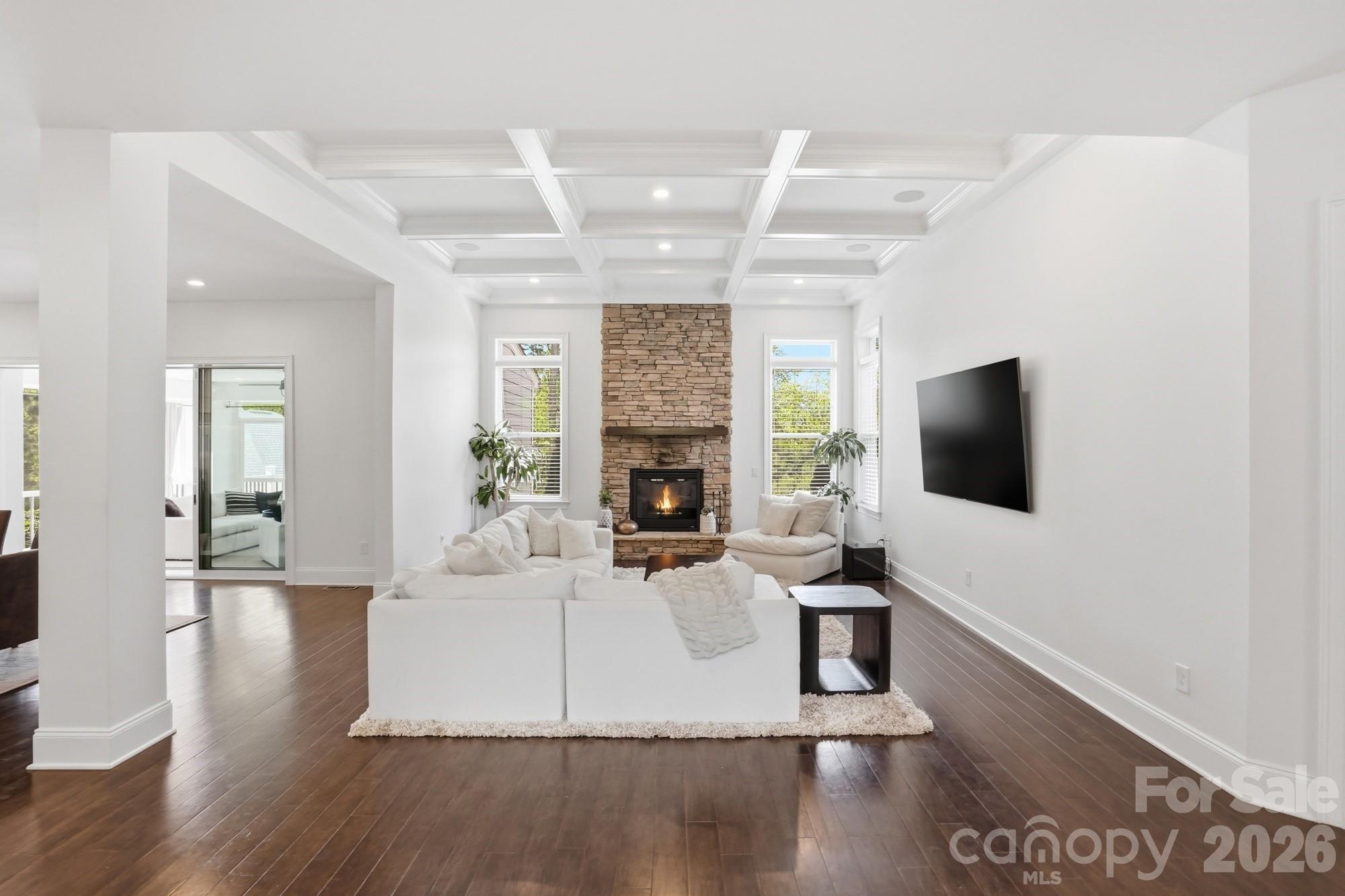 Open concept living with expansive gathering spaces and seamless indoor outdoor flow. Chef’s kitchen features double stacked cabinetry, oversized island with 3 inch quartz, prep sink, dual beverage drawers, JennAir Obsidian refrigerator, dishwasher, microwave, and range, plus Viking double oven. Sliding glass pocket doors open to a screened porch with fireplace.