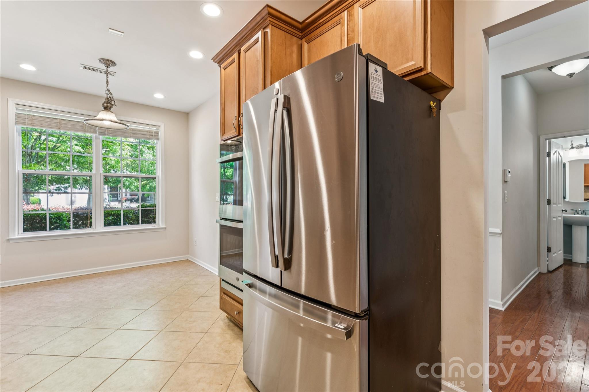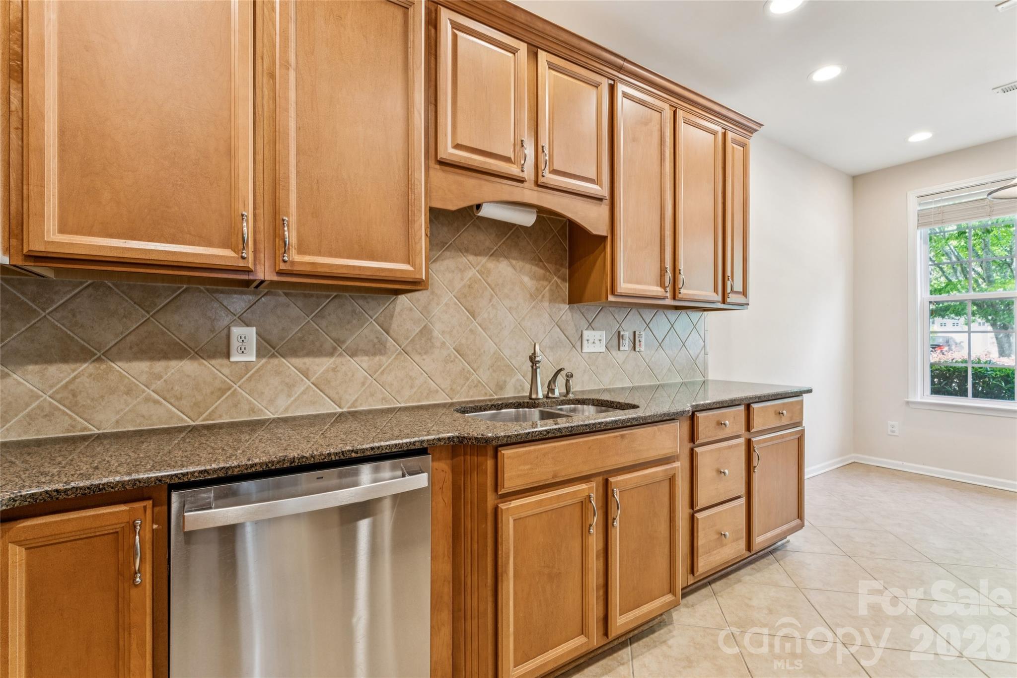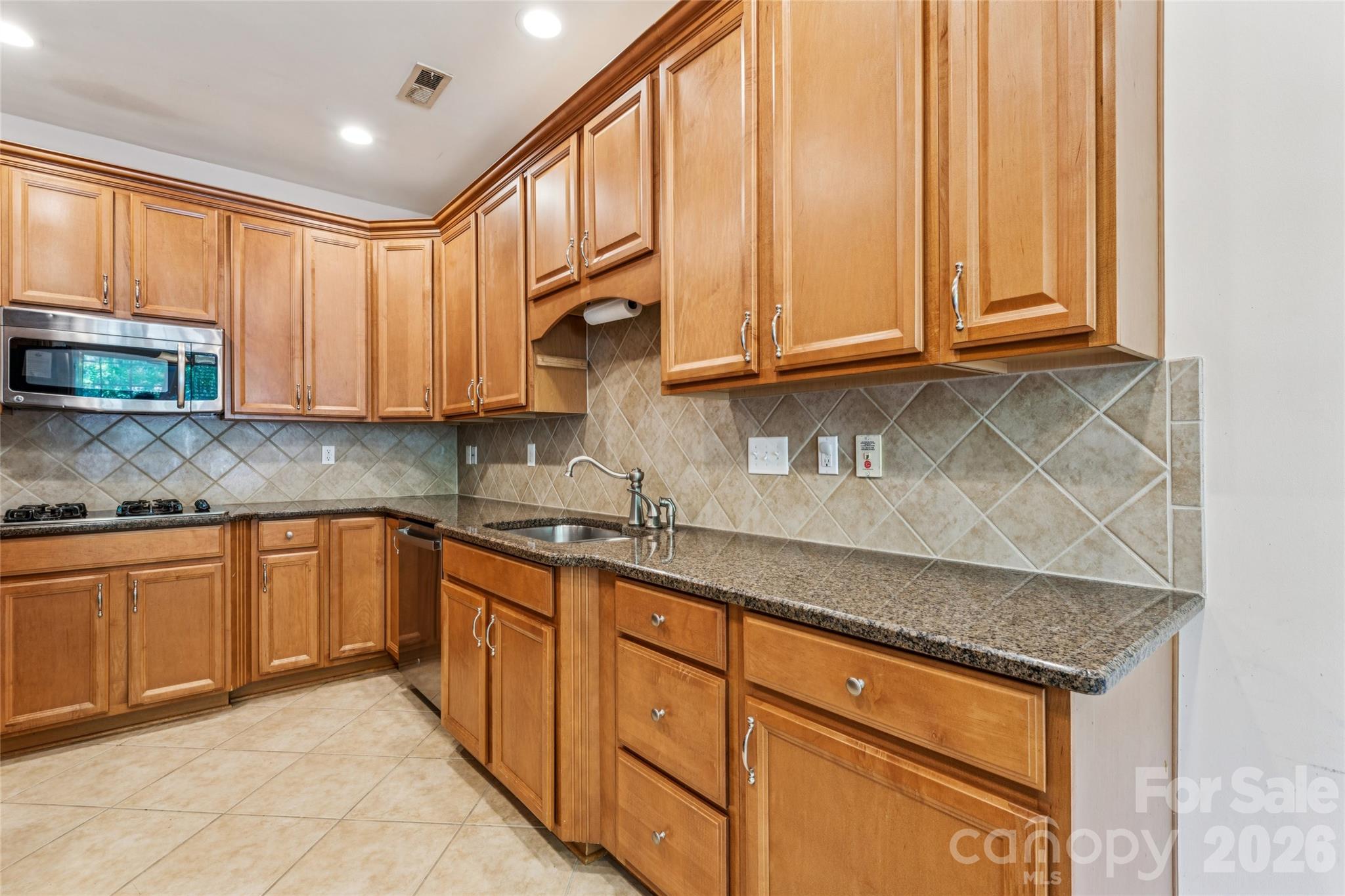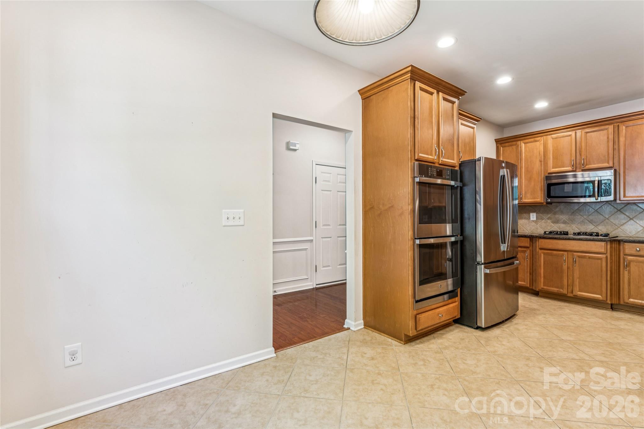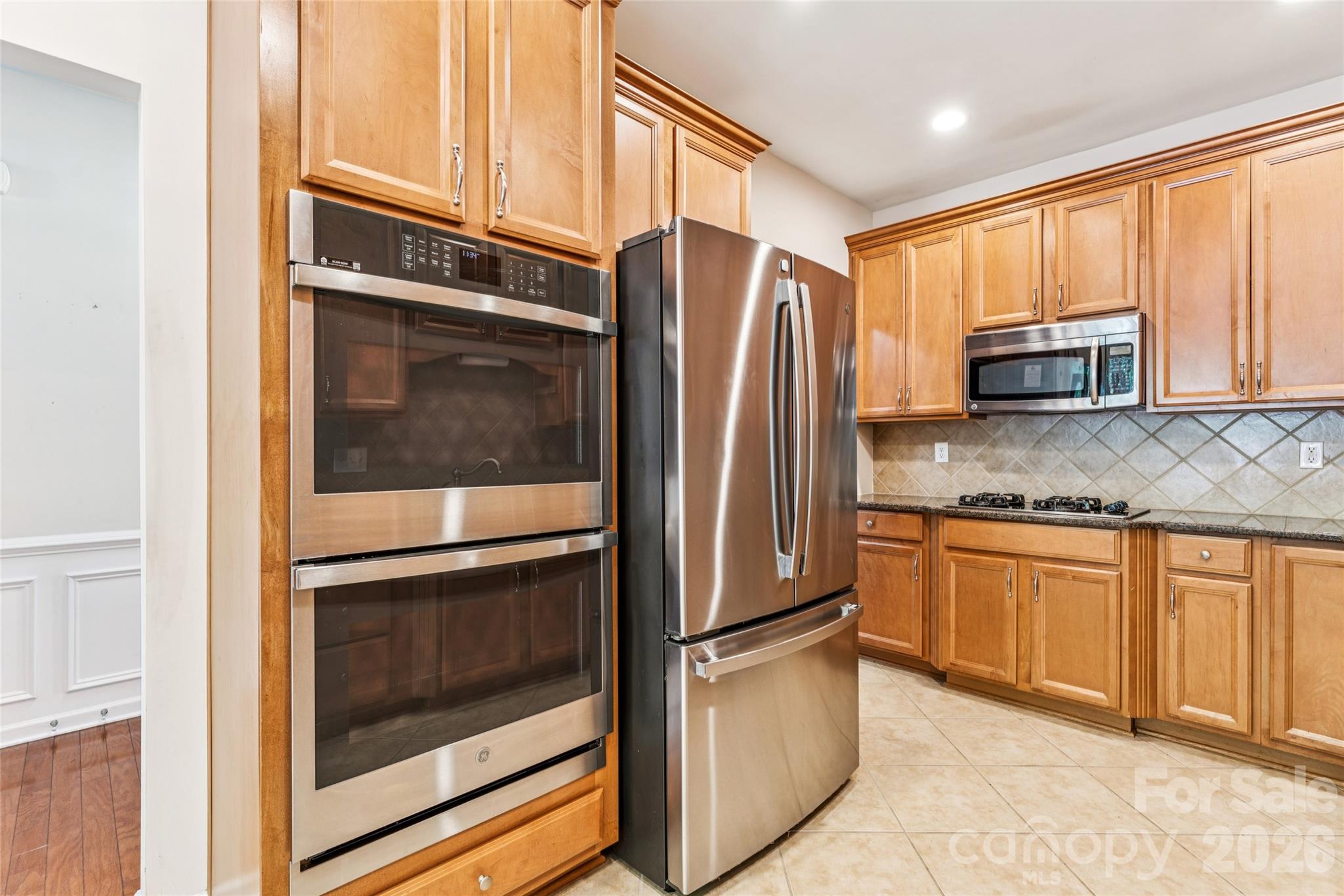 The kitchen is well-appointed with ceramic tile flooring, granite countertops, maple cabinetry, a gas cooktop, double ovens, and stainless steel appliances—ready for both everyday living and hosting.
