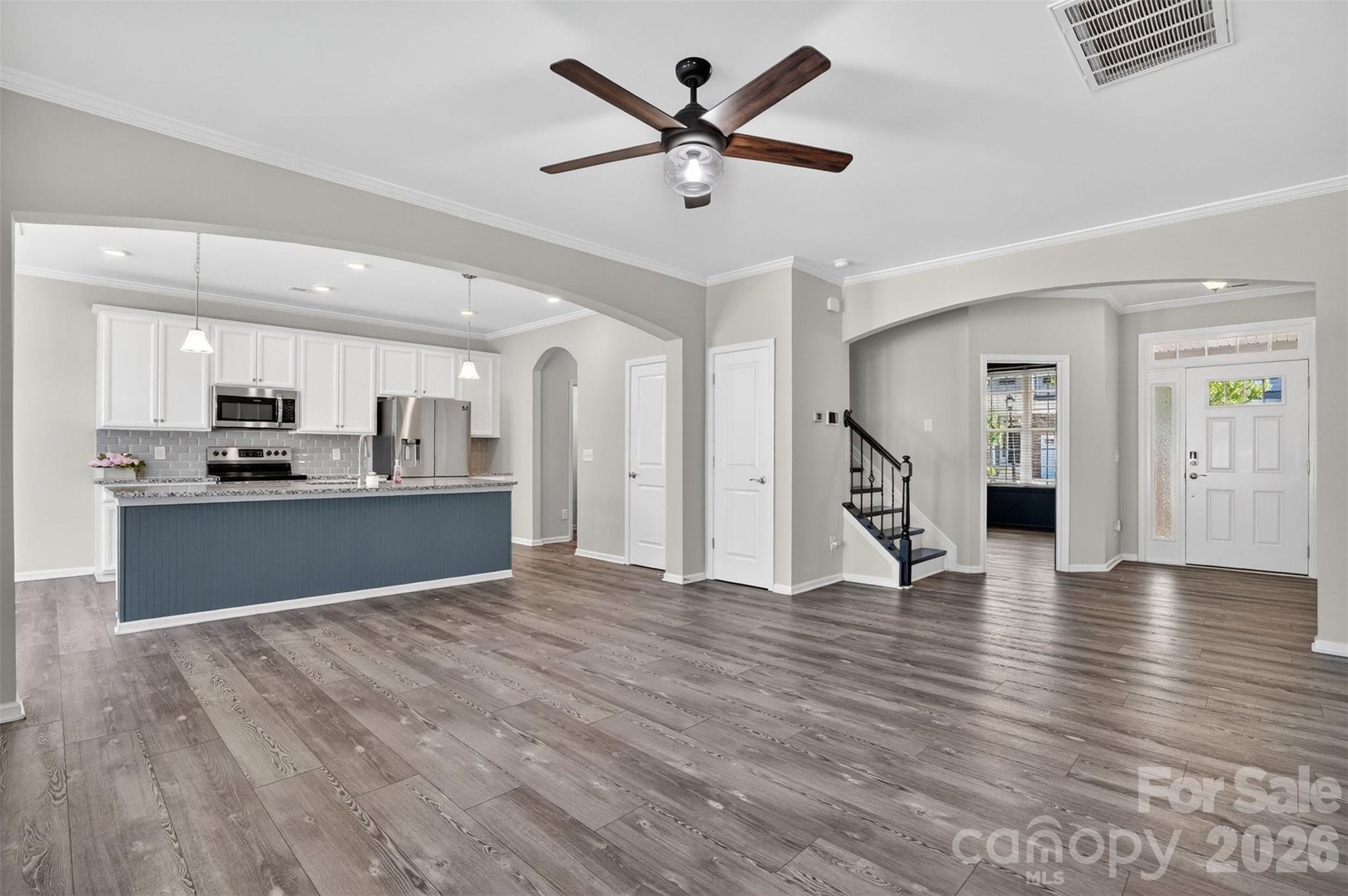 The main level features a versatile bedroom or home office and an open-concept design that seamlessly connects the great room, dining area, and kitchen—perfect for both everyday living and entertaining. The kitchen showcases granite countertops, a classic subway tile backsplash, and flows effortlessly into the main living spaces. Luxury vinyl plank flooring and elegant transitional archways add style and continuity throughout. Step outside to a privately fenced patio, ideal for relaxing or hosting, complete with an electric SunSetter awning.