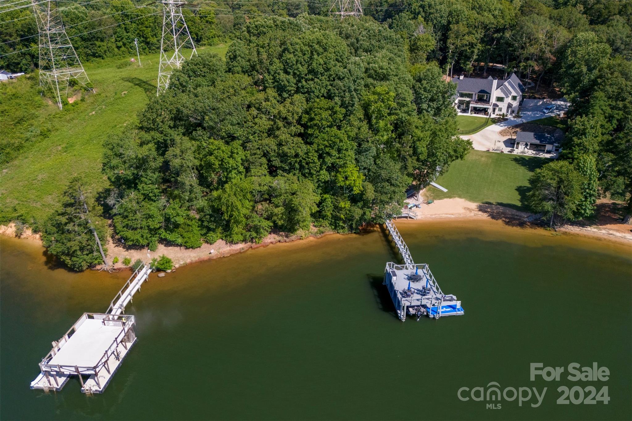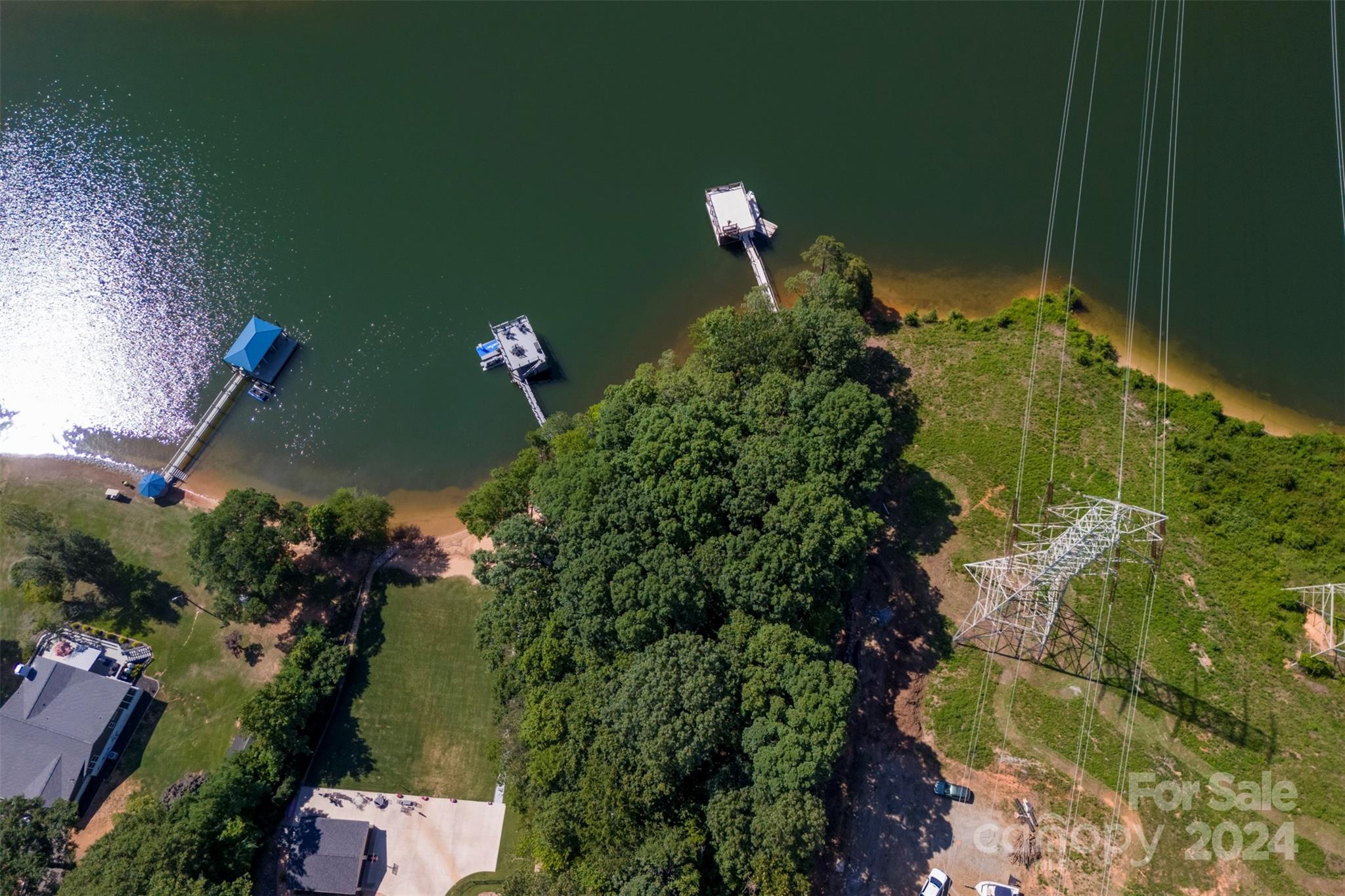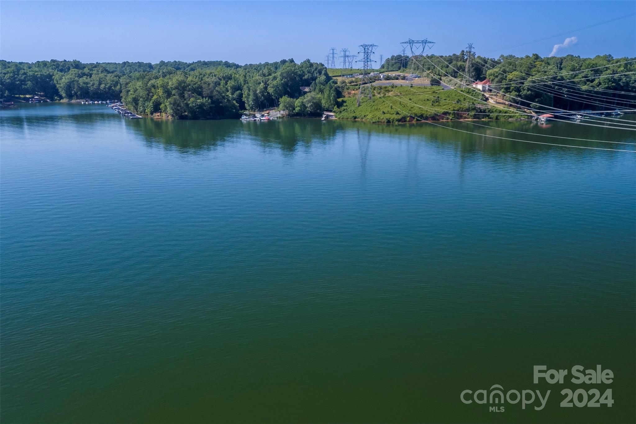 7.31 Acres 400+ feet of water frontage with Main Channel View two tiered pier with jet ski ramp 3 small cabin style buildings with bunk beds (see photos) covered outside kitchen, outside bathroom and shower 1 acre + or- suitable for building See building lay out. 6 + or - acres are under power line Very unique property with many possibilities