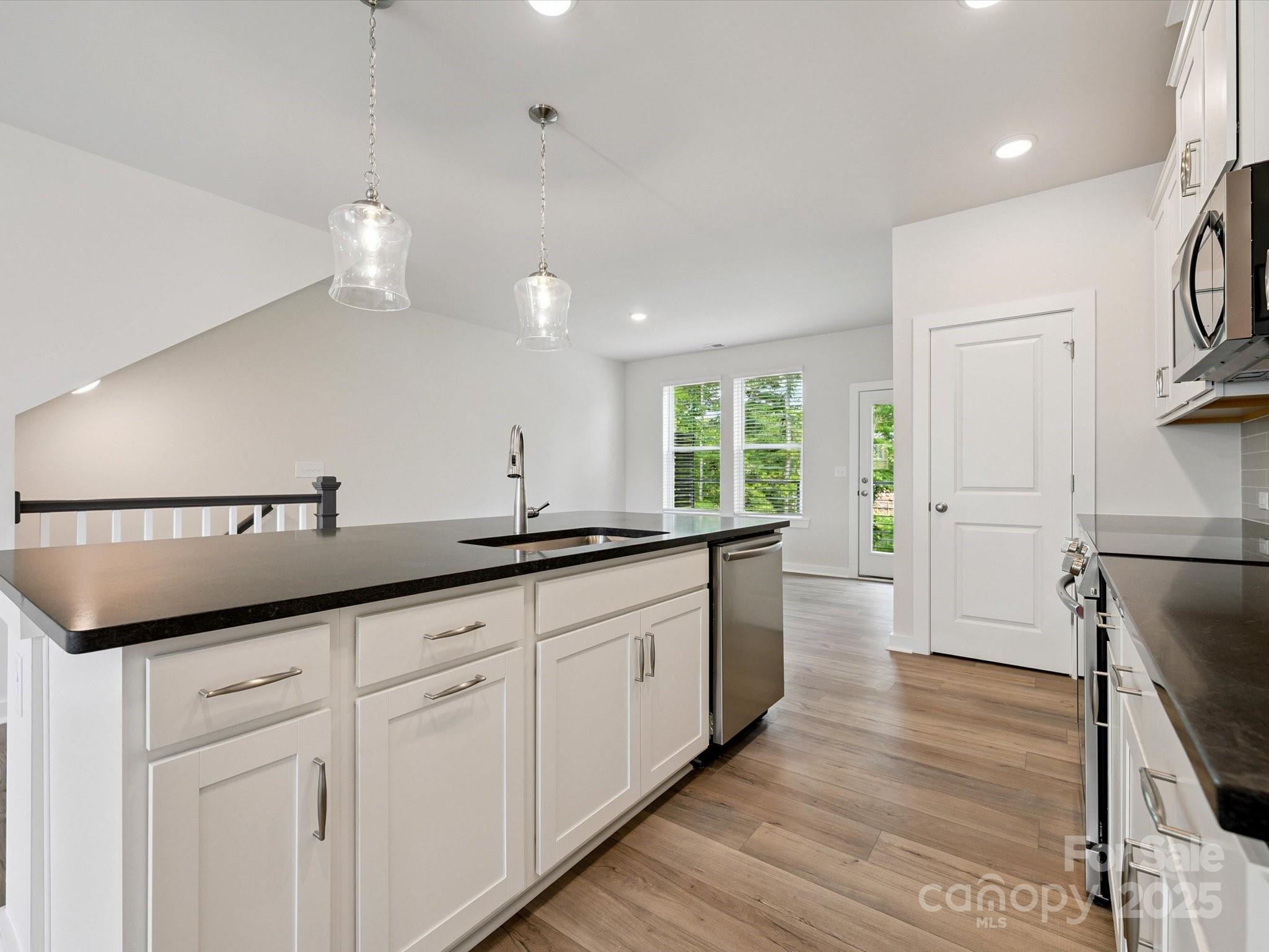 This three-story interior townhome offers a seamless blend of modern design and practicality. This three bedroom, three and a half bath home includes a a private bedroom with its own bath on the first floor, offering a comfortable space for guests or remote work. The main level’s open-concept layout is anchored by a contemporary kitchen, where contrasting finishes create an inviting focal point. On the top floor, the owner’s suite features a spacious closet and bathroom, accompanied by a third bedroom and conveniently placed laundry for effortless living.