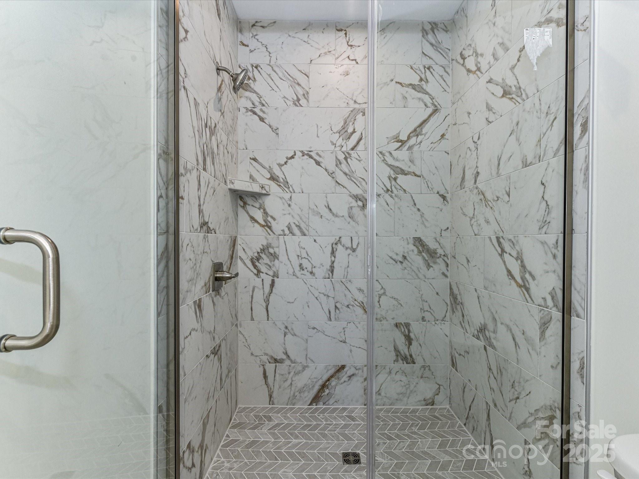 Primary suite with large energy efficient windows, huge walk-in closet, and spa-inspired en suite bath. Primary bath designed with wood toned cabinetry and marble look oversized tile at shower.