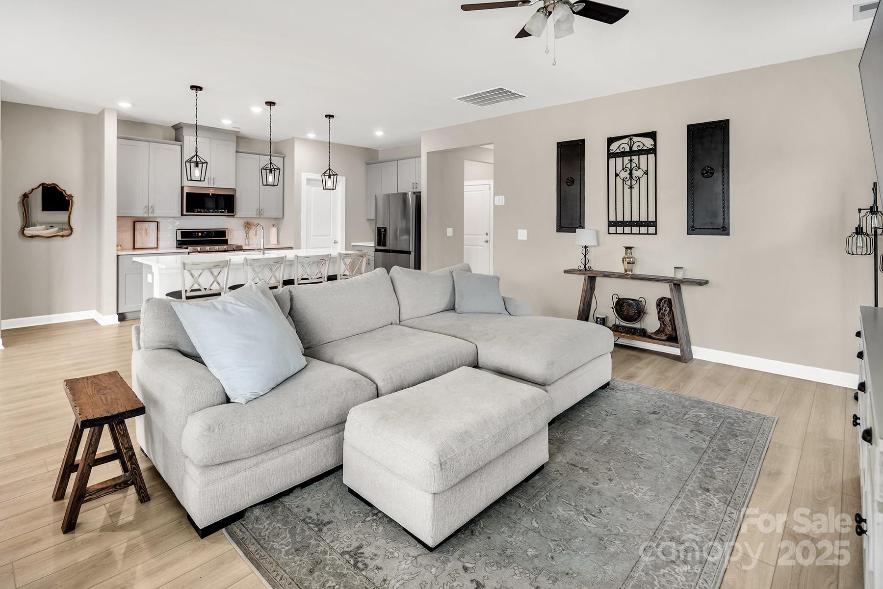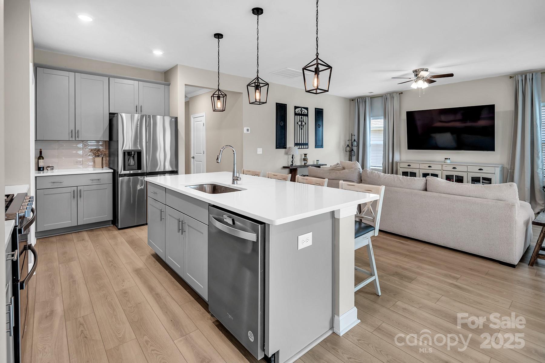 Step into style and comfort with this better-than-new ranch home that checks every box! Immaculate and beautifully upgraded, this 3-bed, 2-bath gem offers a bright, open floorplan with a split-bedroom layout for added privacy. At the heart of the home is a spacious family room and a welcoming dining area—ideal for both everyday living and entertaining. The showstopping kitchen features a large center island with seating, quartz countertops, sleek gray cabinetry, walk-in pantry and top-of-the-line stainless steel appliances, including a 5-burner gas range & double oven. The serene primary suite boasts a tray ceiling, spa-like en suite bath with dual vanities, oversized tile shower, and a massive walk-in closet. Designer lighting and luxury vinyl plank flooring run throughout. Two generous secondary bedrooms share a full bath. Step outside to a fully fenced backyard with a covered patio, extended stone paver area & a large storage shed- all in a community w/pool, pavilion & picnic area! Seller is offering $4,000 in buyer closing cost credit with agreeable offer!!!