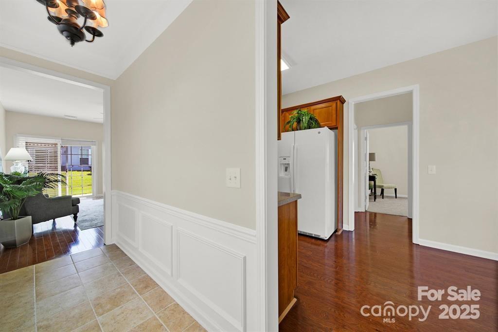 Welcome home to this cozy 2-bedroom, 2-bath Brookside floor plan featuring fresh paint throughout and new carpet in the bedrooms! Step inside to a welcoming foyer highlighted by elegant wainscoting and crown molding. To the right, the eat-in kitchen offers electric appliances, range, microwave, and refrigerator just a couple of years old, plus a tile backsplash, pantry, and sunny dining area overlooking the front porch.