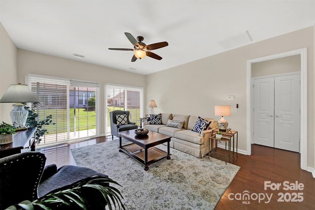 The great room features a ceiling fan and sliding glass doors leading to the rear patio with a retractable awning and garden bed, perfect for relaxing or entertaining. You’ll also appreciate the updated fixtures throughout and an HVAC system equipped with a HALO air purifier for improved indoor air quality.