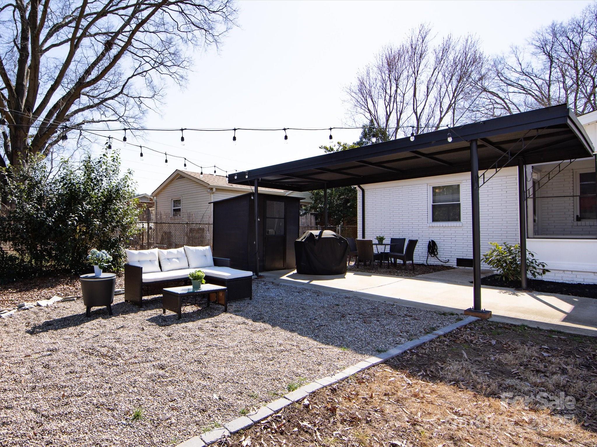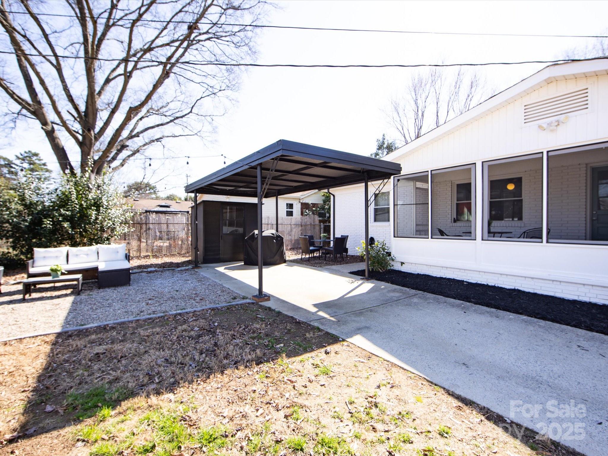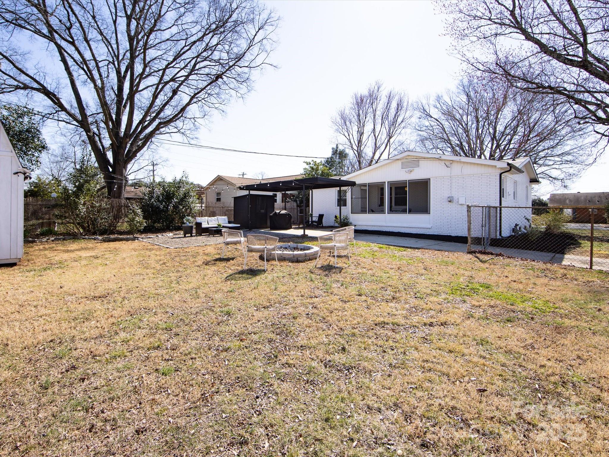 Newly Updated Ranch Home! Gorgeous painted brick exterior with stylish black finishes. Open floor plan with a renovated kitchen. Painted cabinets, tiled floor & backsplash, SS appliances, and granite counters. Separate laundry room. Three spacious bedrooms with one having an en-suite bathroom. Hall bathroom has a brand new tiled shower with new bath fixtures. Stylish vanity with a new mirror, lighting, and fan. Screened-in porch with an updated ceiling and painted floor. Incredible large and flat backyard that is fully fenced-in. String light covered area for entertaining, convenient car port, fire pit, and large storage shed. Extra parking on the driveway and ample street parking for visitors. New Roof (2025). Incredible location that is minutes away from 74, Uptown, Plaza Midwood, Cotswold Retail, Matthews, and Costco. Great value for a move-in ready home that is near the city.