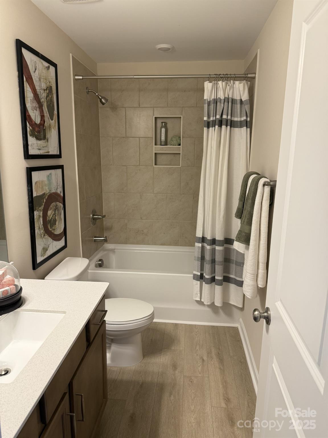 Don't miss out on this two-story townhome! It includes three bedrooms, two bathrooms, and one powder room. Immediately inside the entrance is an open concept great room which flows directly into the eat-in kitchen featuring a large island perfect for entertaining. Upstairs, the primary suite features a walk-in closet, a boxed ceiling, and dual vanities in the bathroom. A laundry closet is located just outside of the primary suite for ultimate convenience. Two secondary bedrooms and one full bathroom are also located upstairs. Just inside the entrance of the one-car garage you'll find a bench and cubby system ideal for keeping things organized.