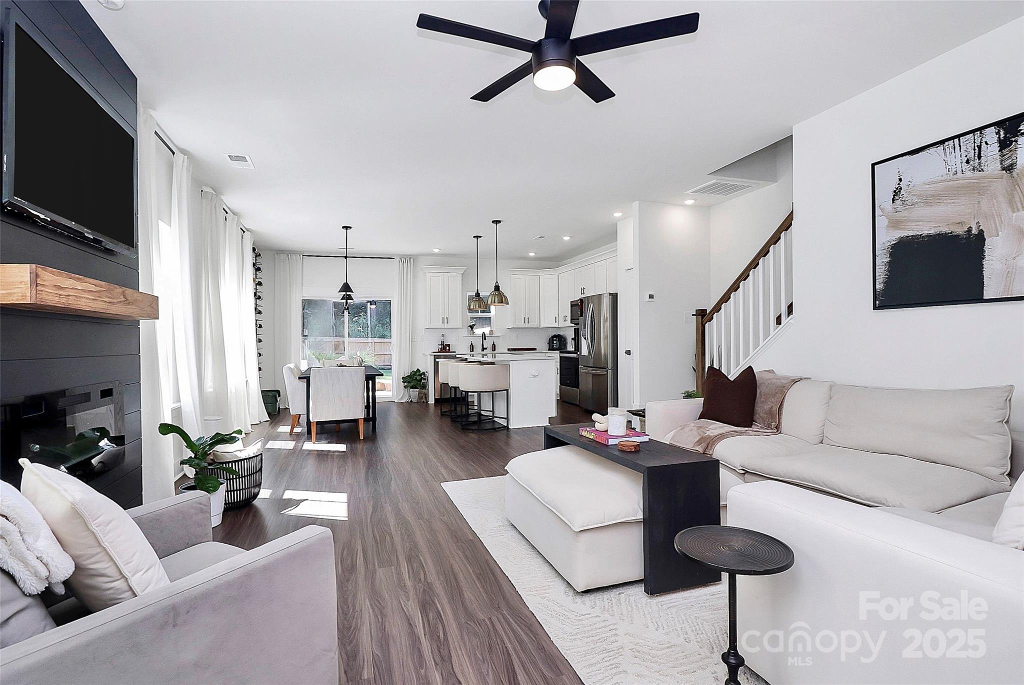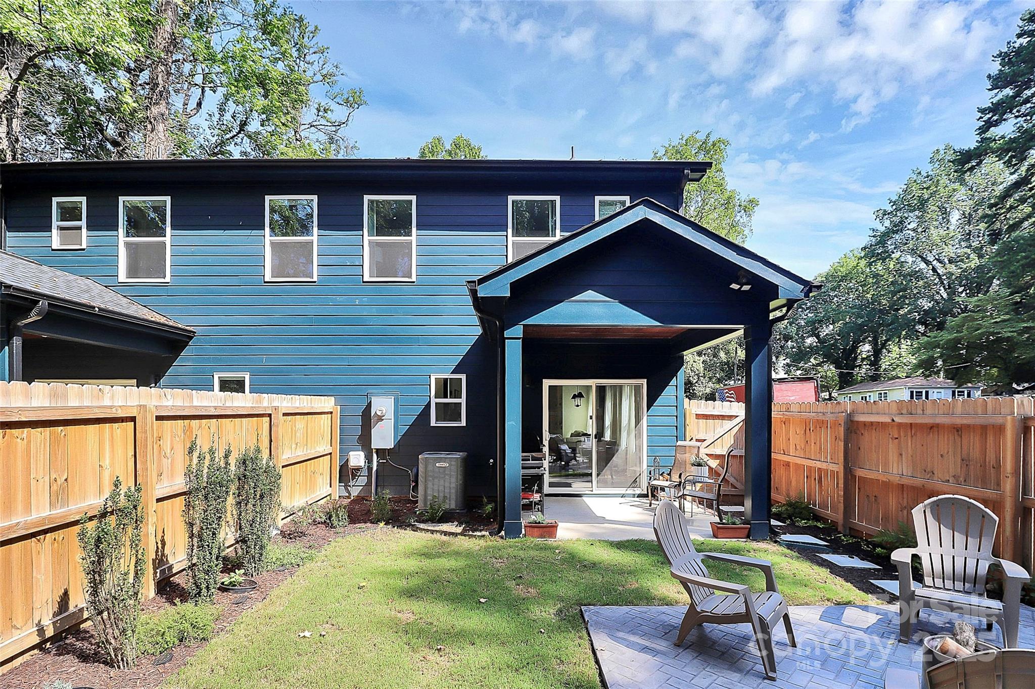 Imagine yourself relaxing or entertaining family & friends in the privacy of the beautifully landscaped fully fenced backyard with extended patio and covered porch. This Duet Style townhome host 3 bedrooms/2.5 baths + 1 car garage; upgrades throughout. Kitchen features designer finishes of quartz countertops, subway tile backsplash, SS energy grade Appliances, and Center Island w/seating. Open Living floorplan on Main level with stunning electric fireplace and luxury vinyl plank flooring, updated lighting + natural lighting. All bedrooms upstairs: Primary bedroom host 2 walk-in closets featuring custom closet built-ins; attached bath w/dual sink vanities and shower finish out the primary space. Both secondary bedrooms have access to the large hallway full bath with tub/shower. Laundry upstairs. Did I mention? NO HOA! This property is conveniently located near NoDa, Camp North End, easy access to I-77 and Uptown. Nearby Druid Hills Park has been recently renovated by Charlotte Parks & Rec.