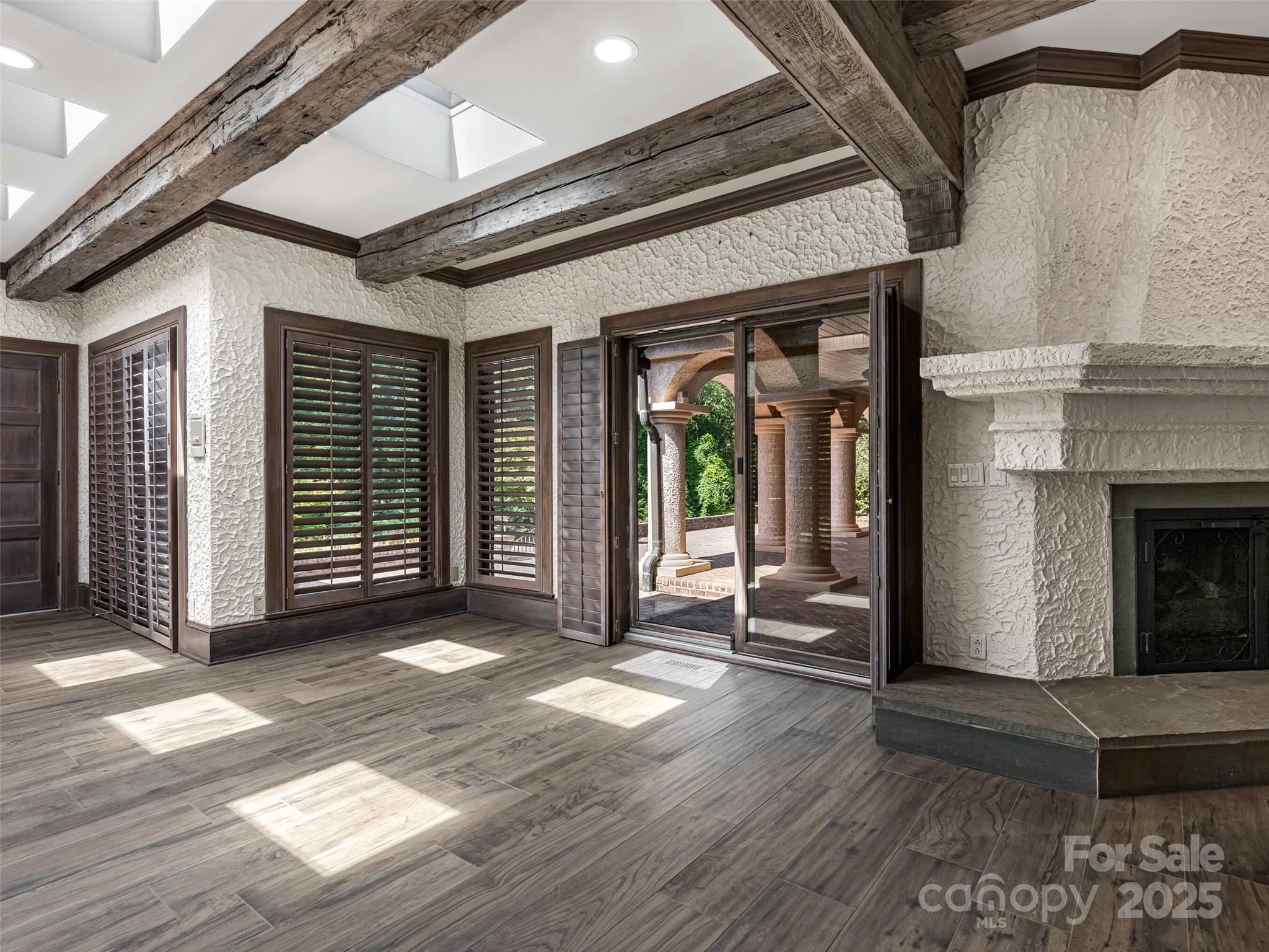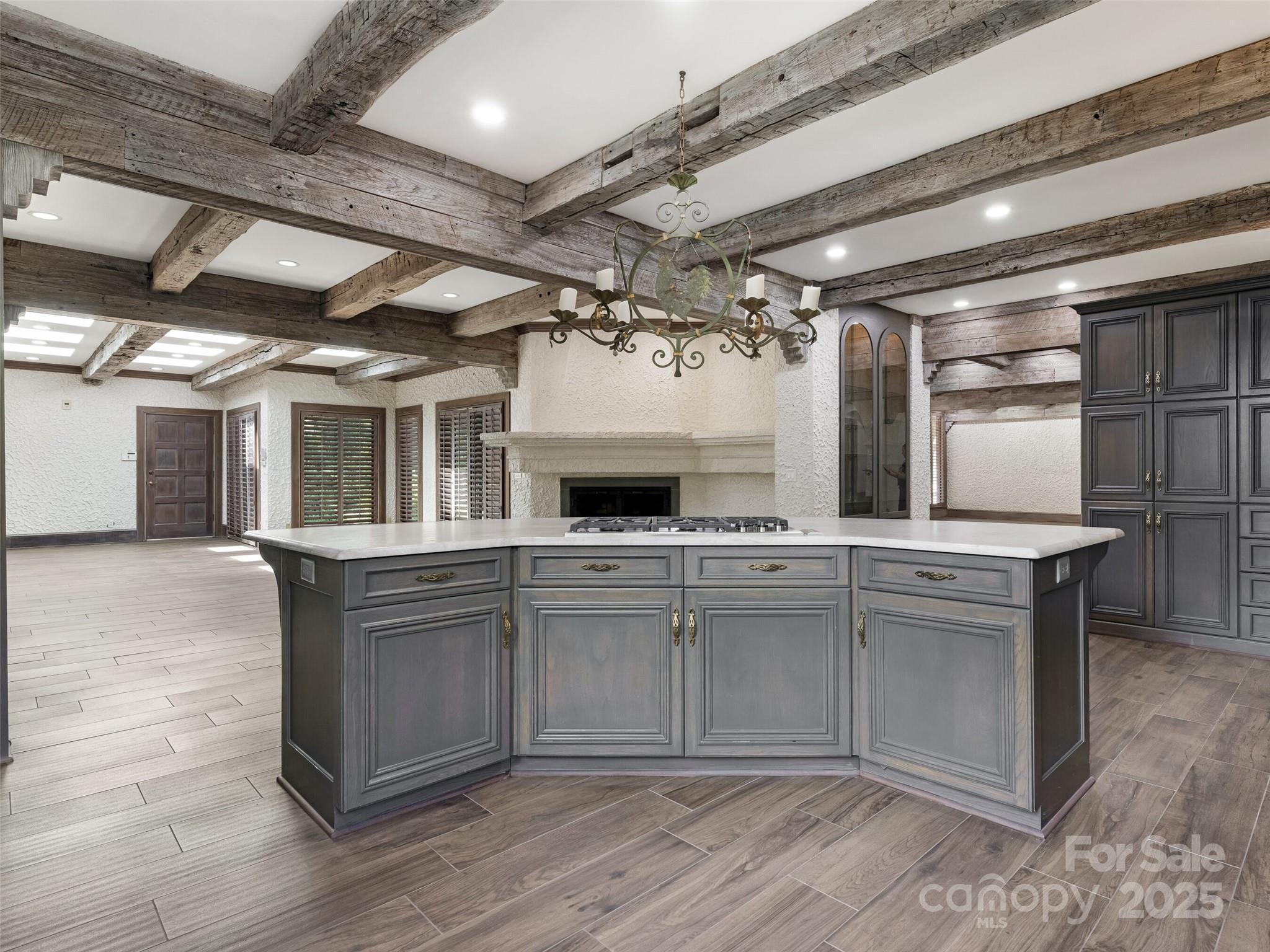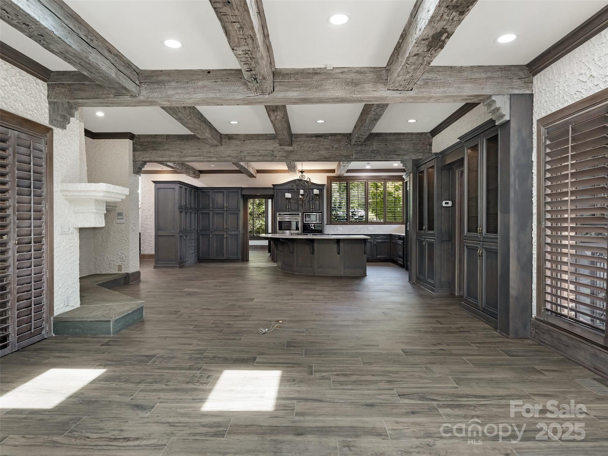 Exceptional Estate on Private Road - Welcome to this remarkable all-brick, 1-story estate offering nearly 6,000 sq. ft. of heated living space in one of South Charlotte’s most sought-after neighborhoods. Tucked away on a private road near Quail Hollow and Carmel Country Clubs, this residence blends timeless craftsmanship with modern comfort. Enter inside to high ceilings and stunning antique hand-hewn beams that anchor the main living spaces with warmth and character. The home boasts four bedrooms, four full baths and three half baths, along with abundant storage including a 1,200+ sq. ft. walk-up attic complete with a cedar closet. Multiple fireplaces create inviting gathering spaces plus, a dramatic wet bar in living room. Designed for both entertaining and everyday living, the floor plan flows seamlessly outdoors to expansive patios (with a 1/2 bath for the pool), a covered terrace and a sparkling pool—perfect for hosting or relaxing in privacy. A porte-cochere and four-car garage (with over 1,700sq ft) provide convenience and curb appeal. There is also a garage storage room and garage storage loft. Cedar shake roof and copper gutters compliment the exterior. This rare opportunity combines architectural detail, spacious design and a premier location—a true sanctuary just minutes from world-class golf, dining and shopping.