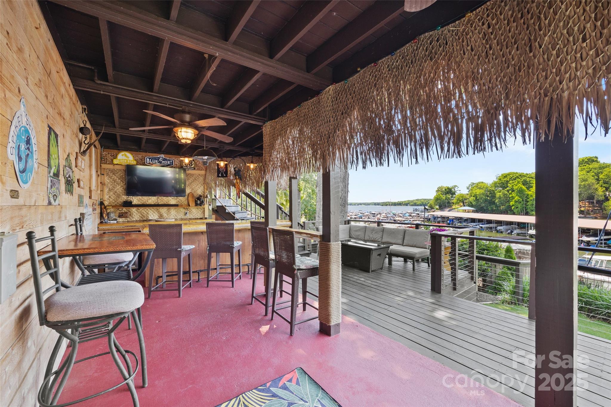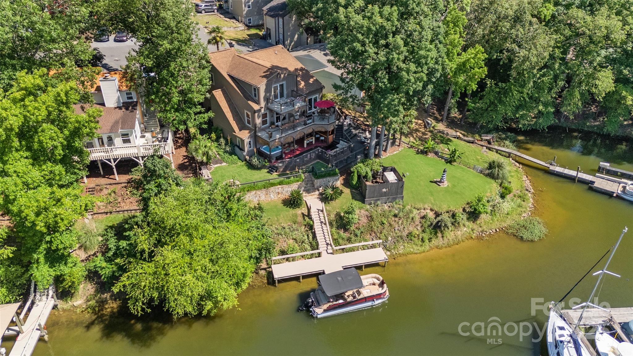 With sunset views looking out onto Lake Wylie from a private cove, this waterfront home is truly a slice of paradise! Outdoor entertaining spaces galore incl a Barefoot hot tub & custom built bar, 2 addl levels of decks w/ cable railing to take advantage of the views, stone fire pit w/ a fenced lawn area & rock retaining wall, & last but not least, a new PERMITTED private dock w/ composite decking. The same theme of thought & care was put into the inside, incl a complete kitchen remodel w/ details such as custom wood beams & luxury plank Pergo flooring that runs throughout the main. The primary suite boasts a private deck, & bath will leave you speechless - completely redone to incl an enormous walk-in dual shower & tub area w/ river rock, skylight, dual sinks, & more. The basement is a walk out providing tons of natural light, & fully remodeled bath w/ spa shower. No expense was spared making this home ready for you to move right in! Video: https://www.youtube.com/watch?v=XufO7SpdI9w