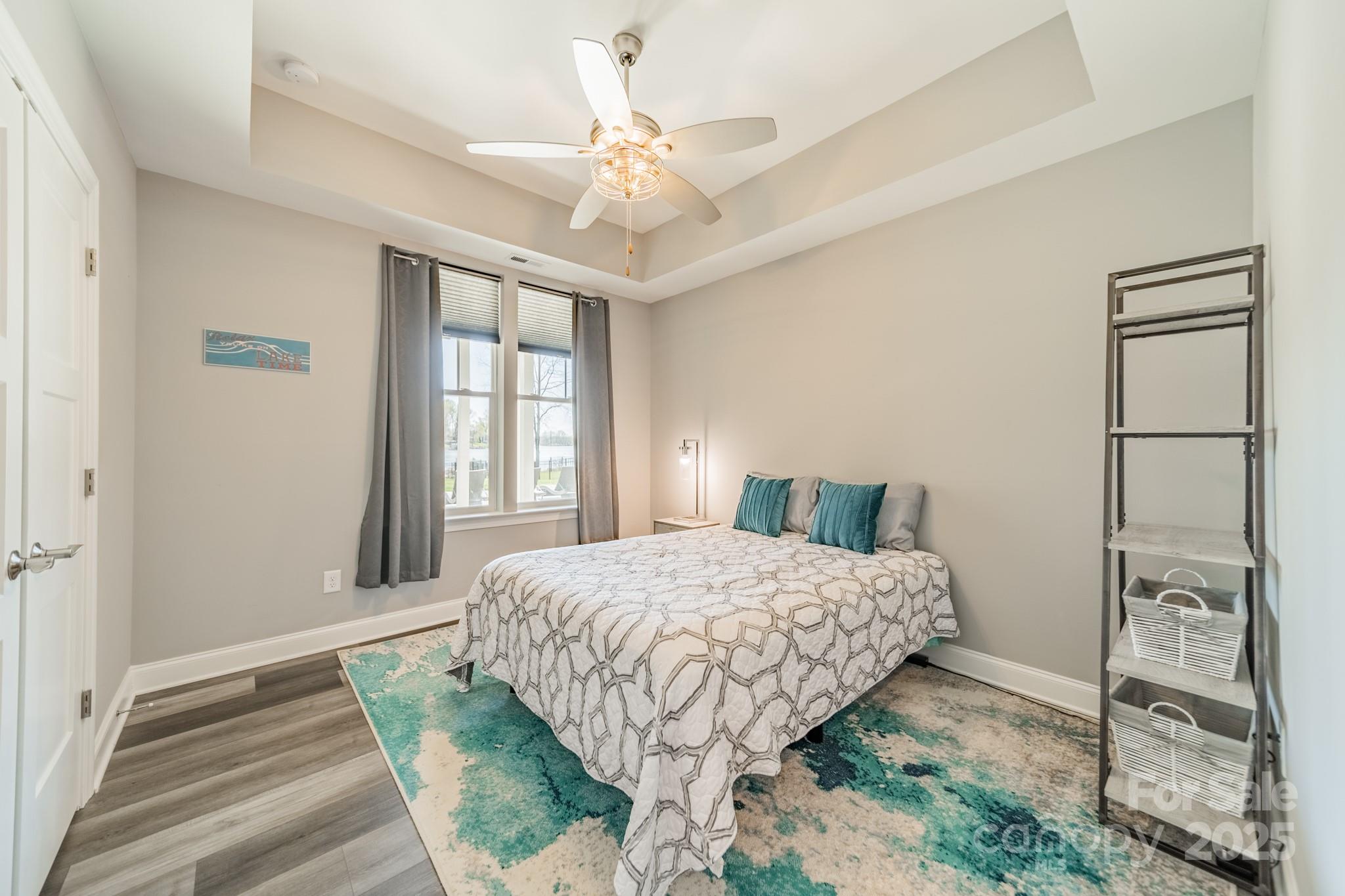 Unwind in the spacious main-level primary suite, featuring panoramic lake views and a spa-inspired bathroom with an oversized walk-in shower. The suite connects directly to a generously sized laundry room for added convenience.