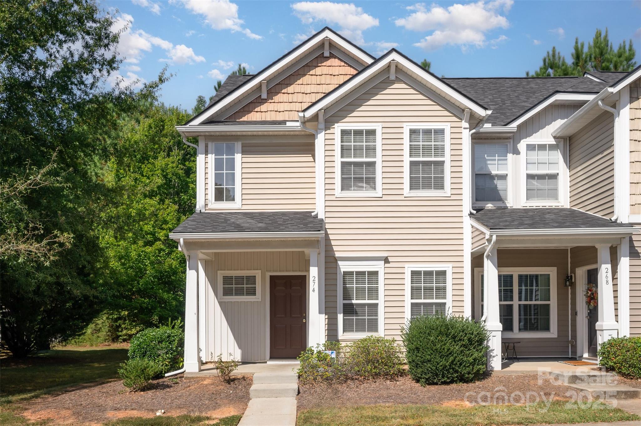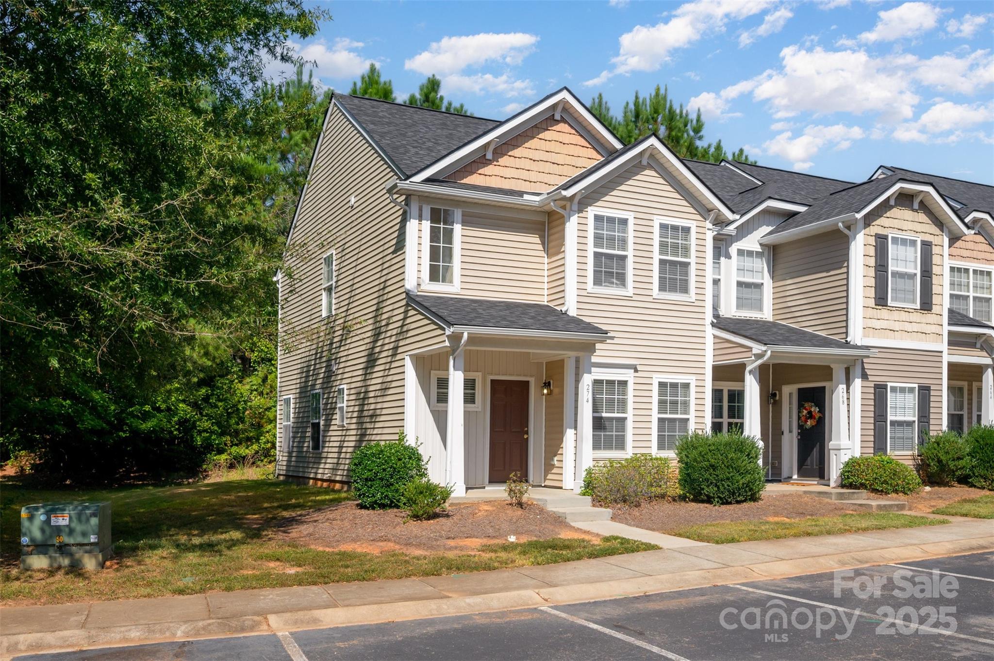 Spacious and updated end unit townhome convenient to tons of shops, restaurants & I-77! Home is in a peaceful community with beautiful green area & playground. Interior features tons of upgrades including new appliances, vinyl flooring, and interior paint. As you enter, flex room on the right is perfect for formal living area, play space, or home office! Open living, kitchen and dining features focal gas fireplace & sliding door leading to back patio. Kitchen has center island area with breakfast bar seating plus tons of cabinets and full pantry for storage. Primary bedroom suite upstairs features attached full bath. Two additional bedrooms and full hall bath great for family or guests. Private back patio faces the woods for privacy and is great for grilling or enjoying the cooler fall evenings. HOA includes lawn maintenance and trash.